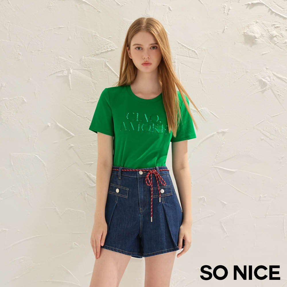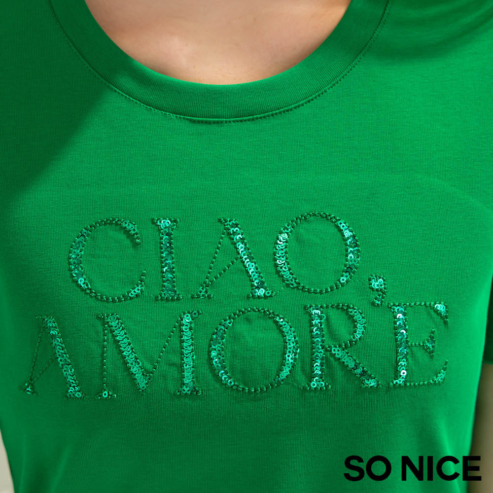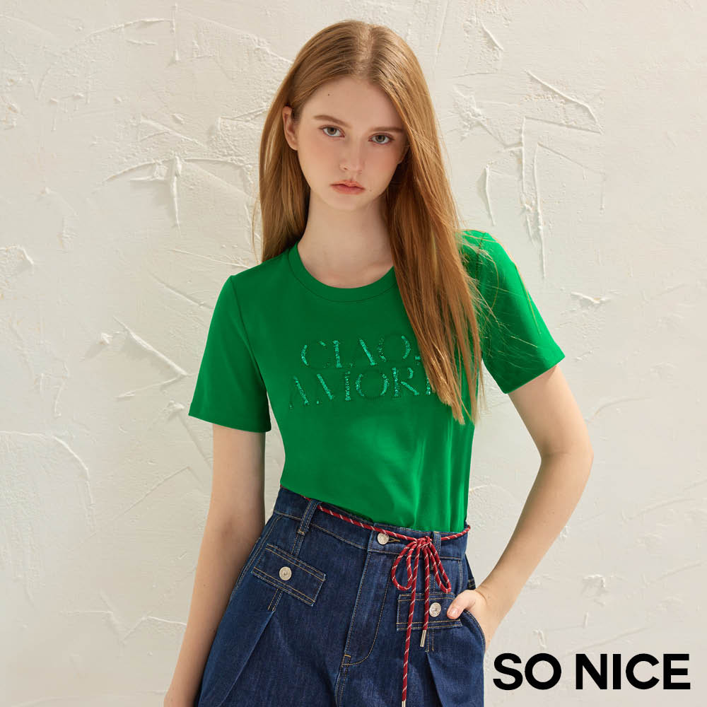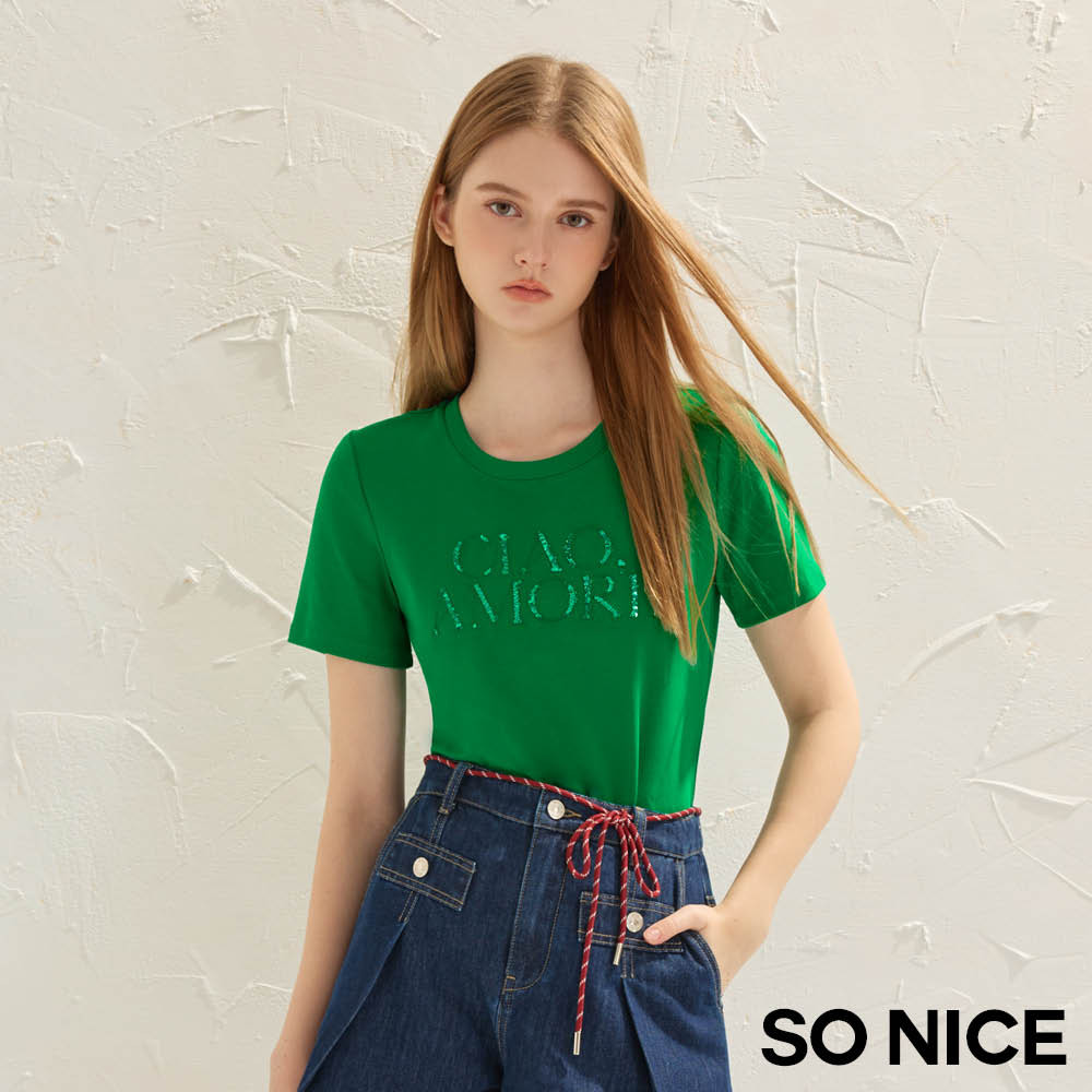 SO NICE 亮片字母彈力棉質上衣|桃紅/綠|都會時尚女裝【68541004】桃紅,34(XS)|綠,36(S)|綠,38(M)|綠,40(L)|綠,42(XL)|桃紅,36(S)|桃紅,38(M)|桃紅,40(L)|桃紅,42(XL)|綠,34(XS)T-shirtsSO NICE 官方旗艦店