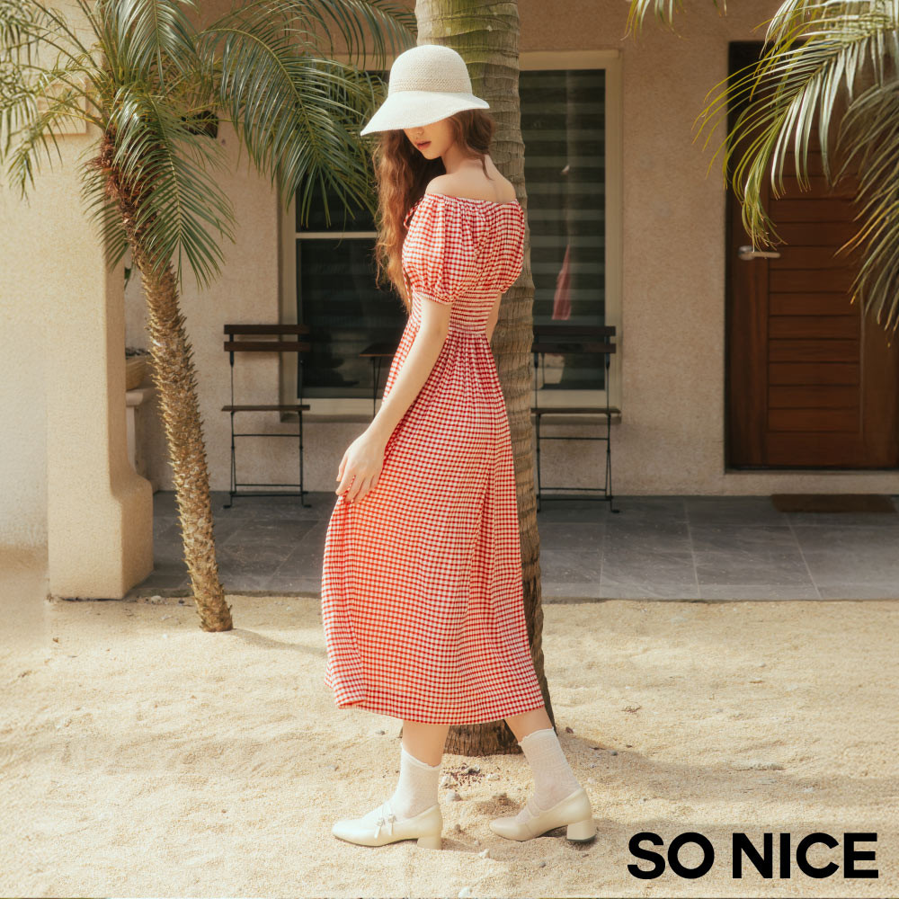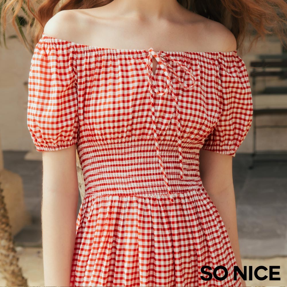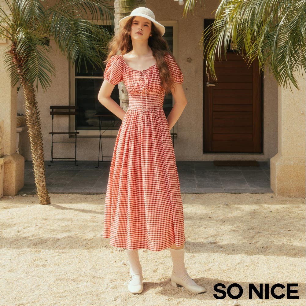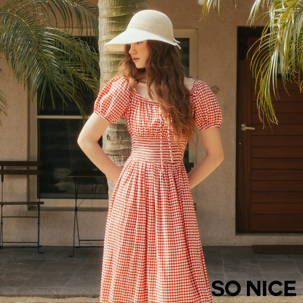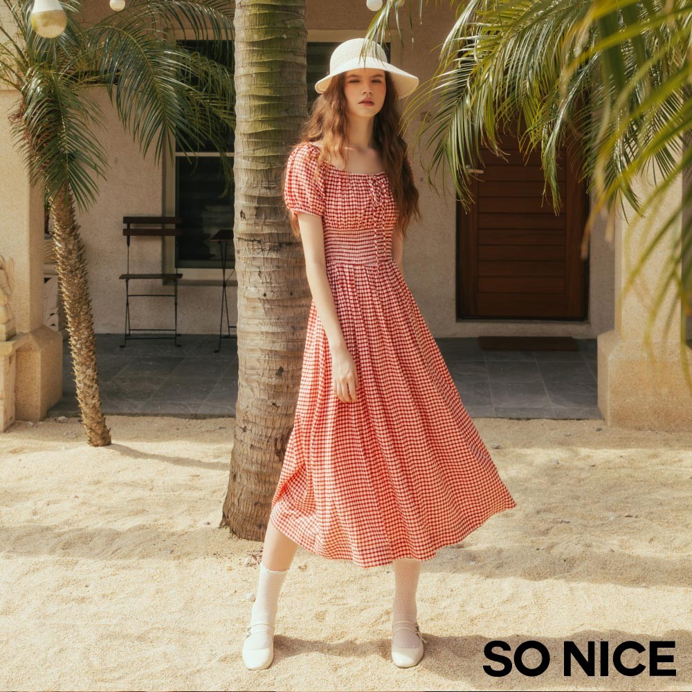 SO NICE 活力紅番茄女孩田園格紋方領公主袖打攬顯瘦長洋裝|都會時尚女裝【75544001】紅,34(XS)|紅,36(S)|紅,38(M)|紅,40(L)|紅,42(XL)SO NICE 官方旗艦店