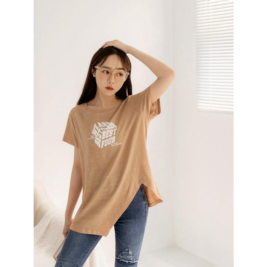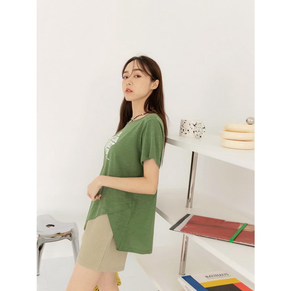 OB嚴選 竹節棉印花不規則下襬短袖上衣 《AB18453》大尺碼/現貨/女裝淺灰,F|淺灰,XL|淺灰,3L|墨綠,XL|墨綠,3L|卡其,XL|淺灰,2L|墨綠,F|墨綠,2L|卡其,F|卡其,2L|卡其,3LT-shirtsOB嚴選官方旗艦店
