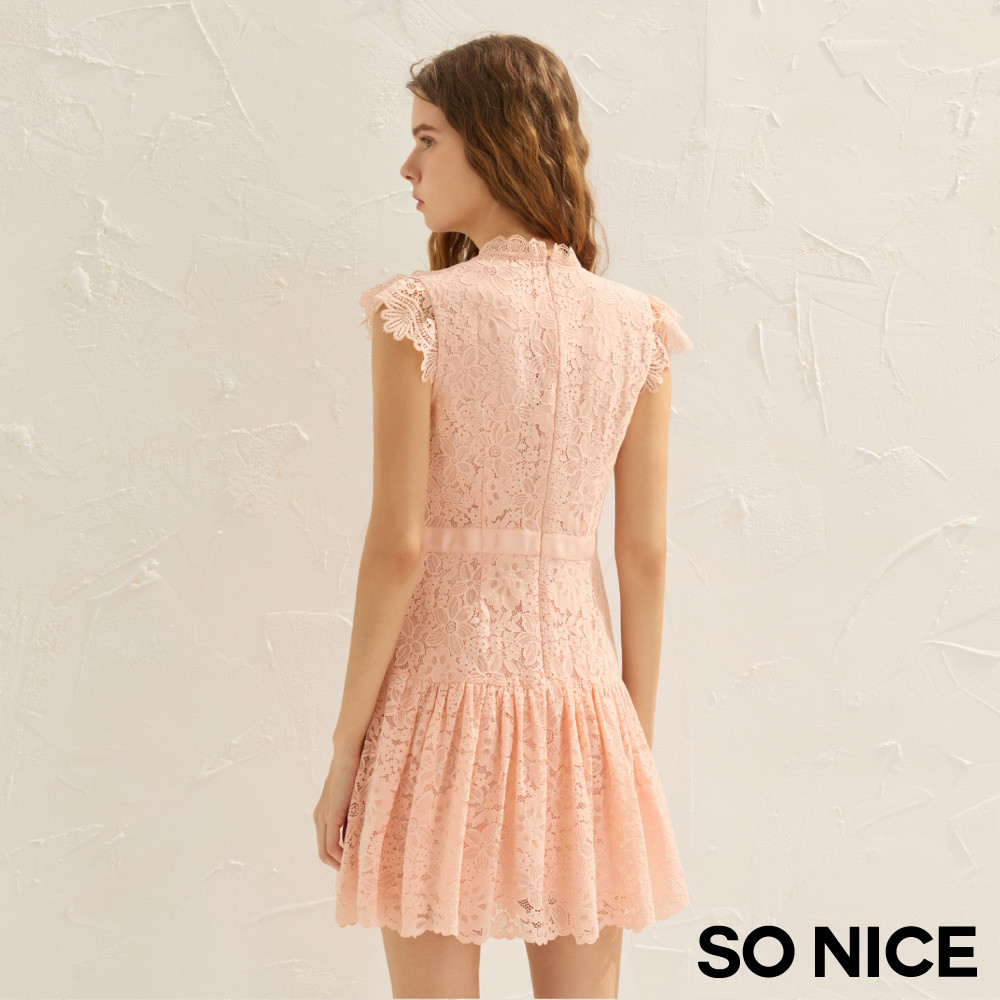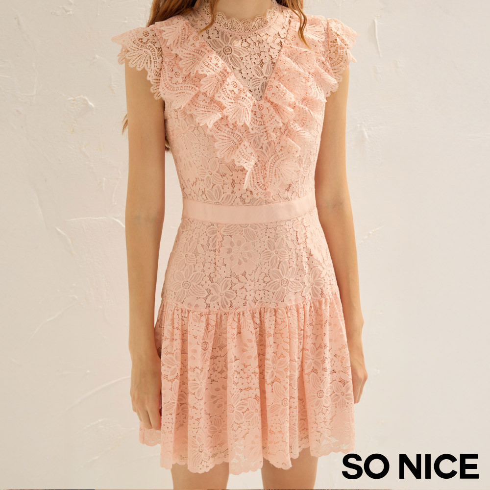 SO NICE 落櫻粉立體荷葉領水溶蕾絲收腰洋裝|都會時尚女裝【75544003】粉,34(XS)|粉,36(S)|粉,38(M)|粉,40(L)SO NICE 官方旗艦店