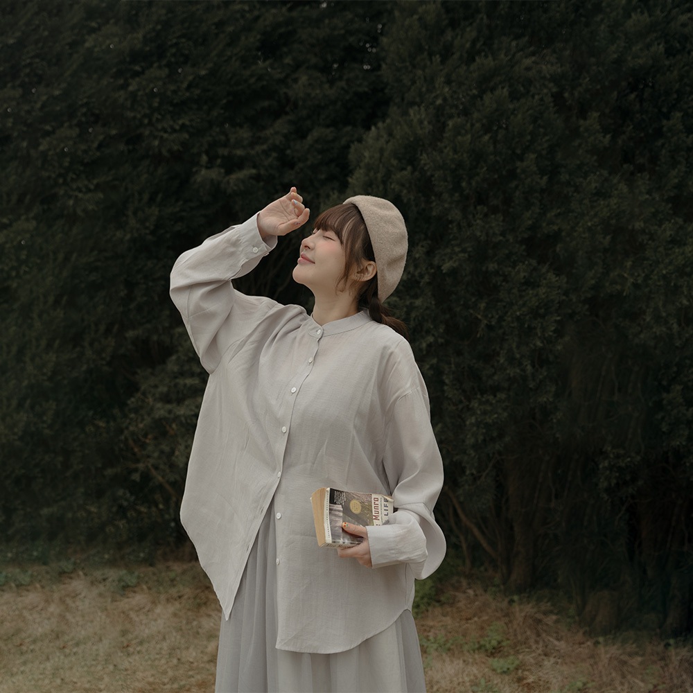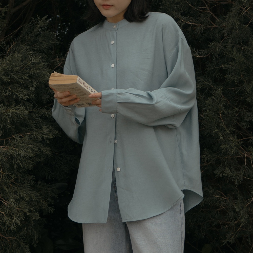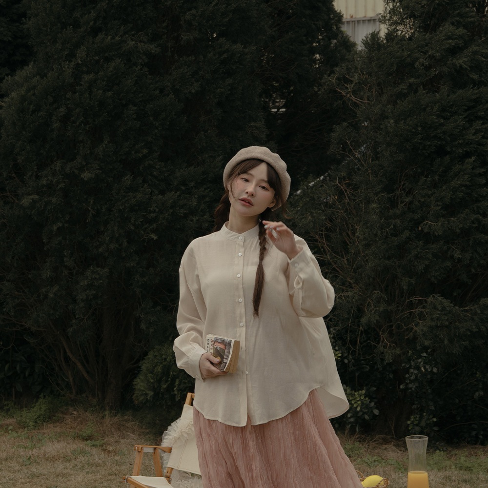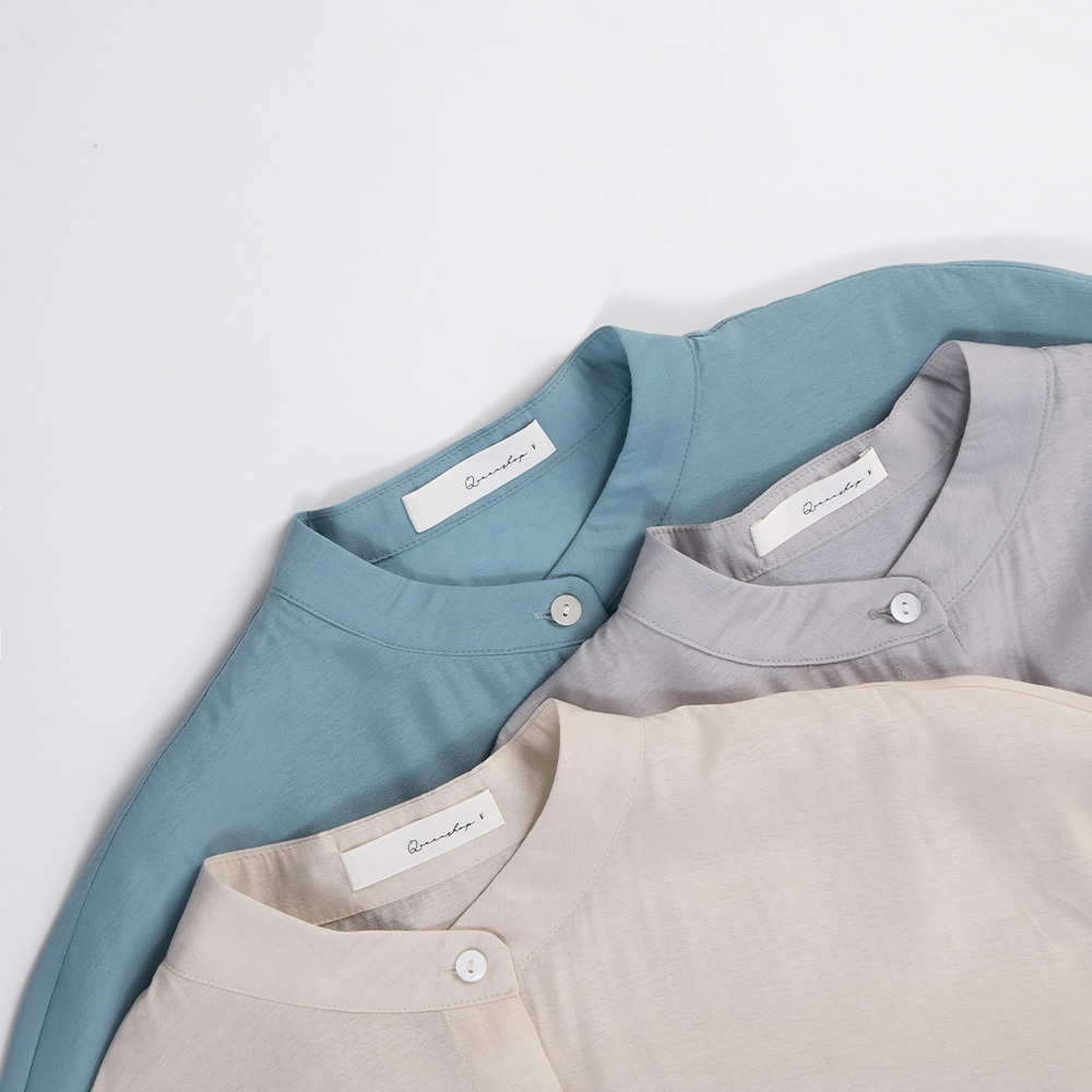 QUEENSHOP_ S 女裝 長袖 素面微透膚剪接中山領襯衫 三色售 現+預 【01025257】藍|杏|淺灰Shirts & BlousesQUEENSHOP