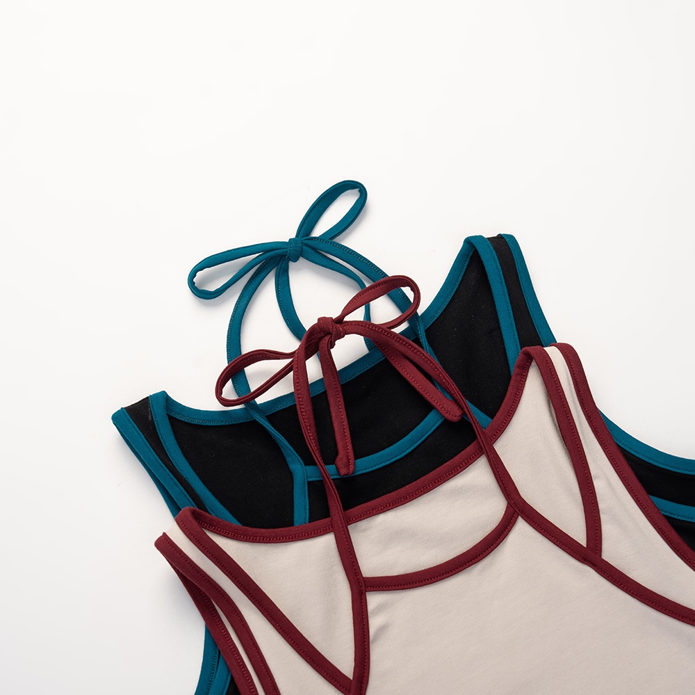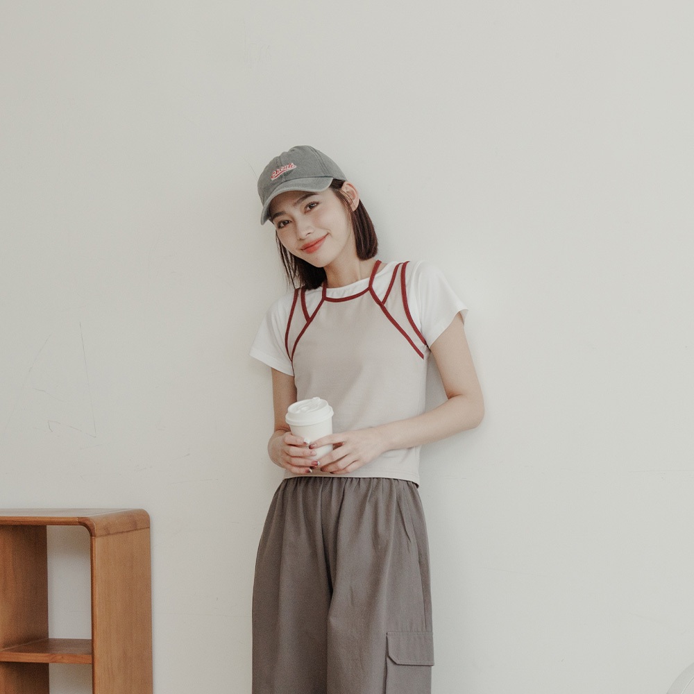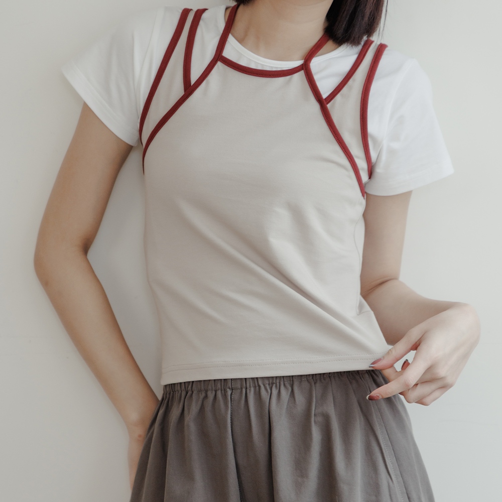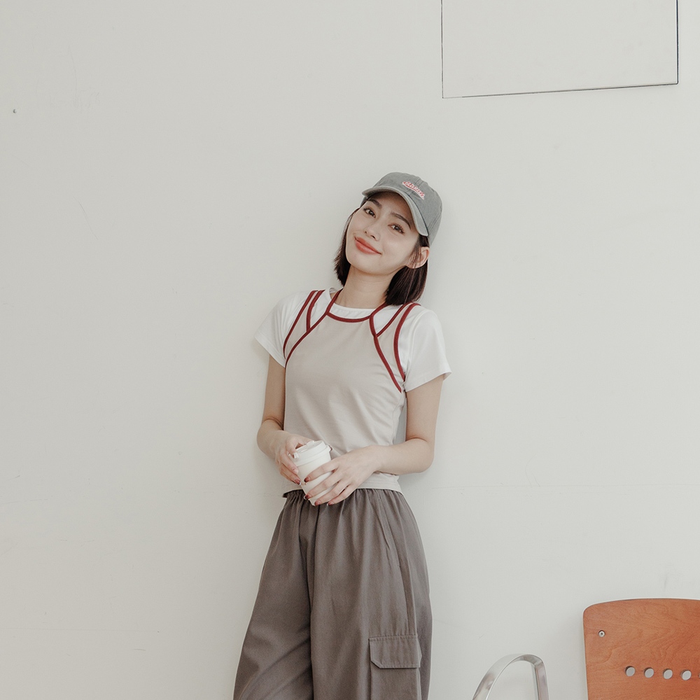 QUEENSHOP_ S 女裝 假兩件設計撞色綁帶背心 兩色售 現+預 【01150451】黑|杏灰Tanks & CamisolesQUEENSHOP