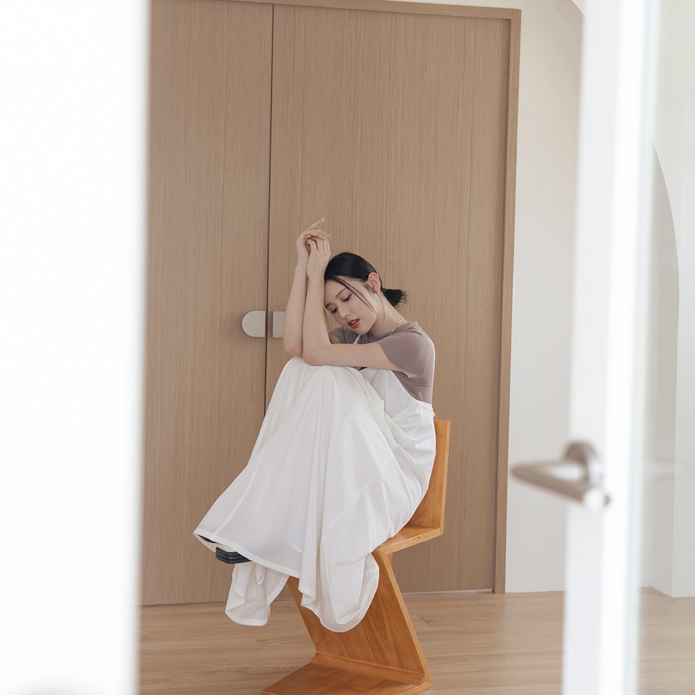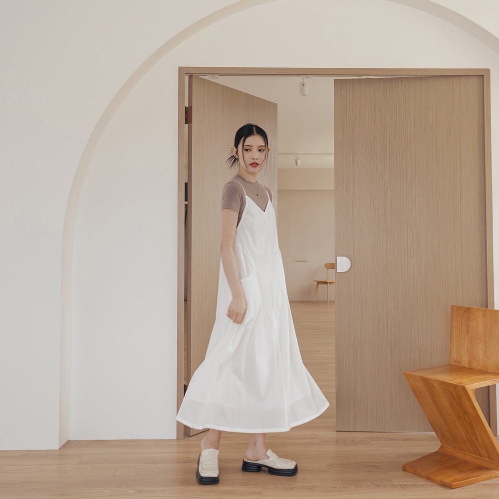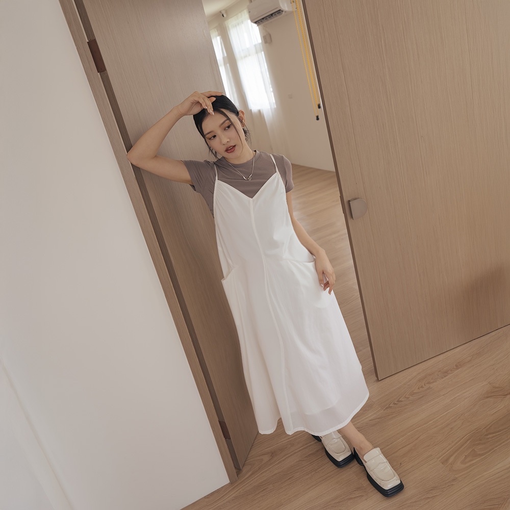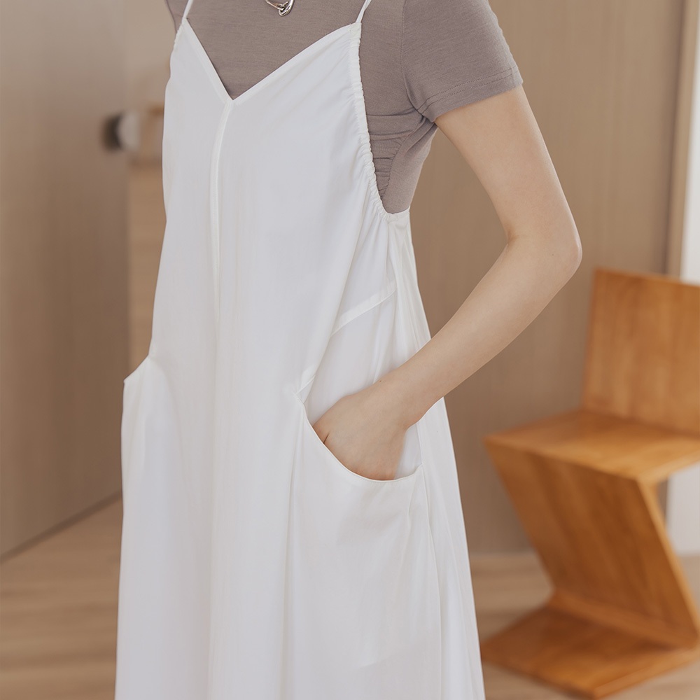 QUEENSHOP_ S 女裝 側抓皺剪接口袋細肩長洋裝-白 現+預 【01087064】白QUEENSHOP