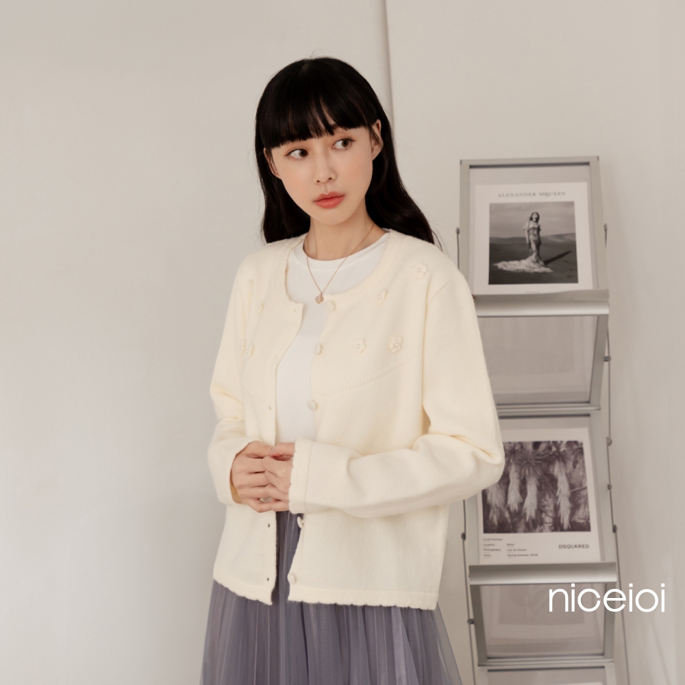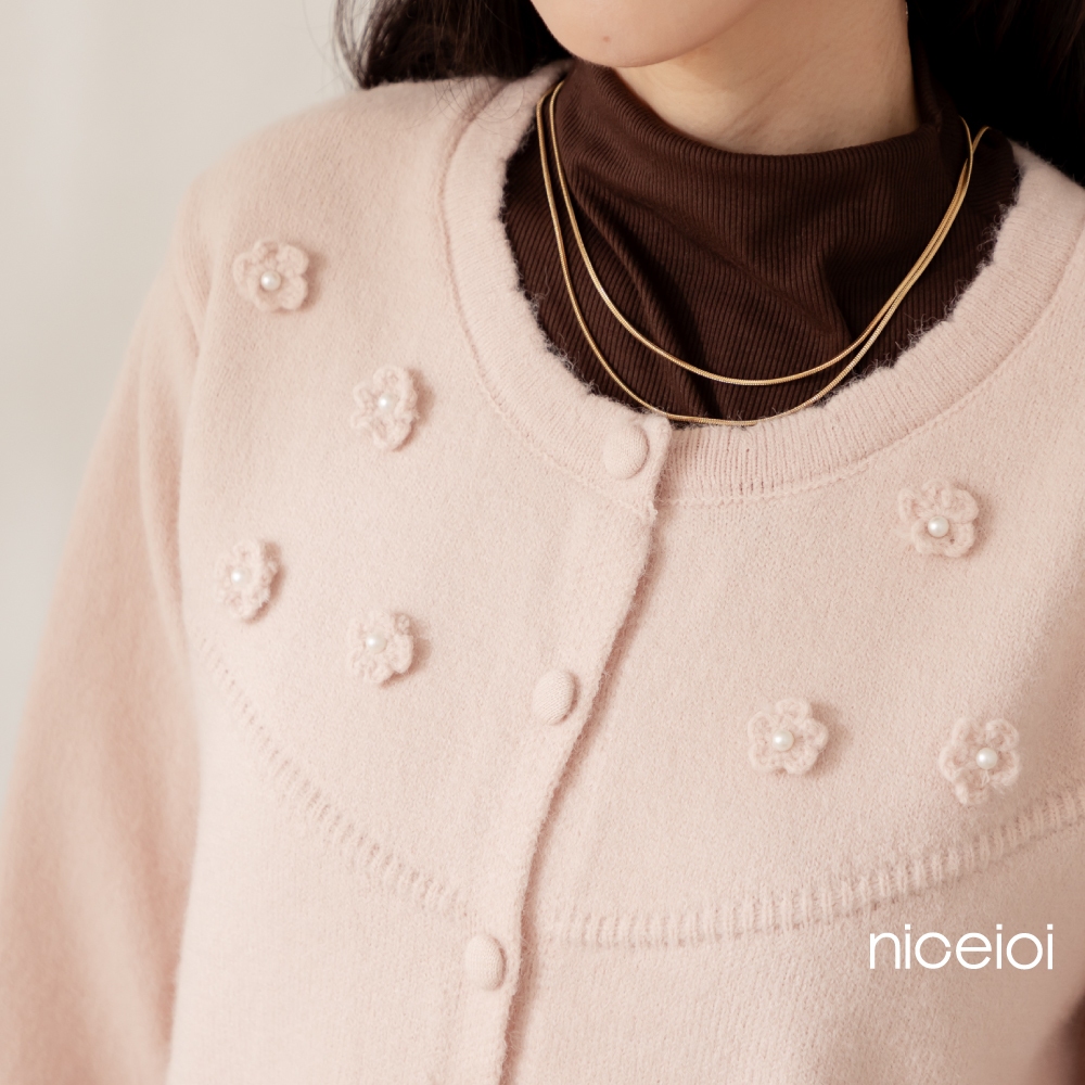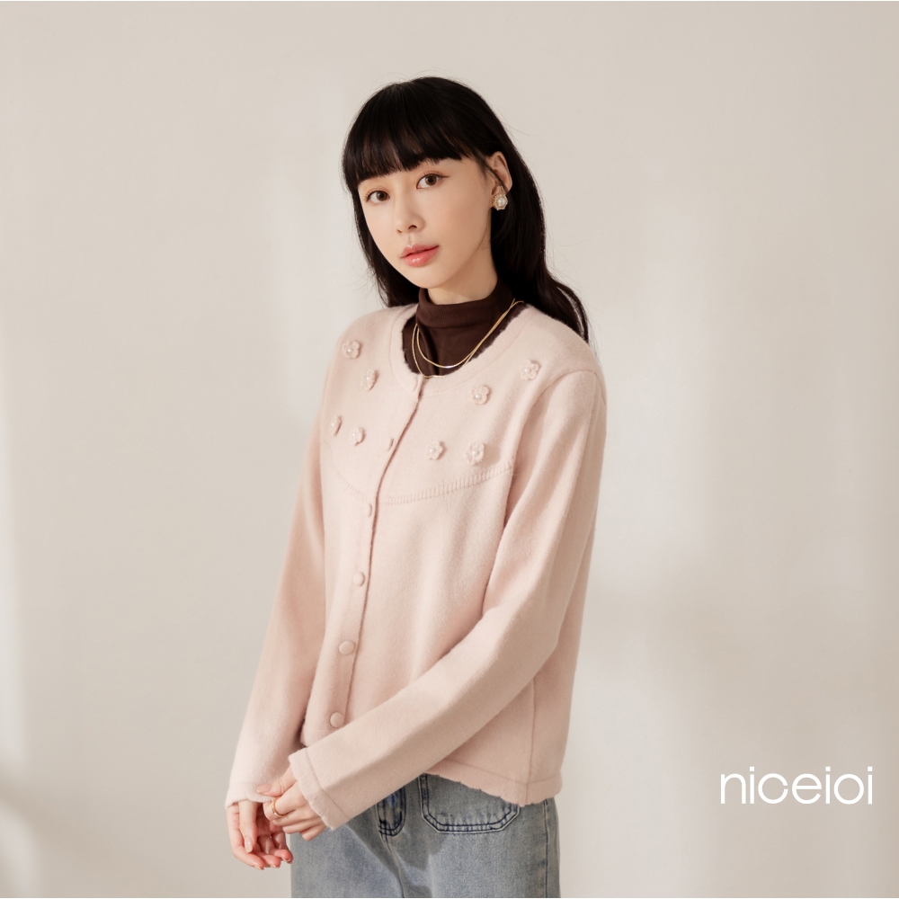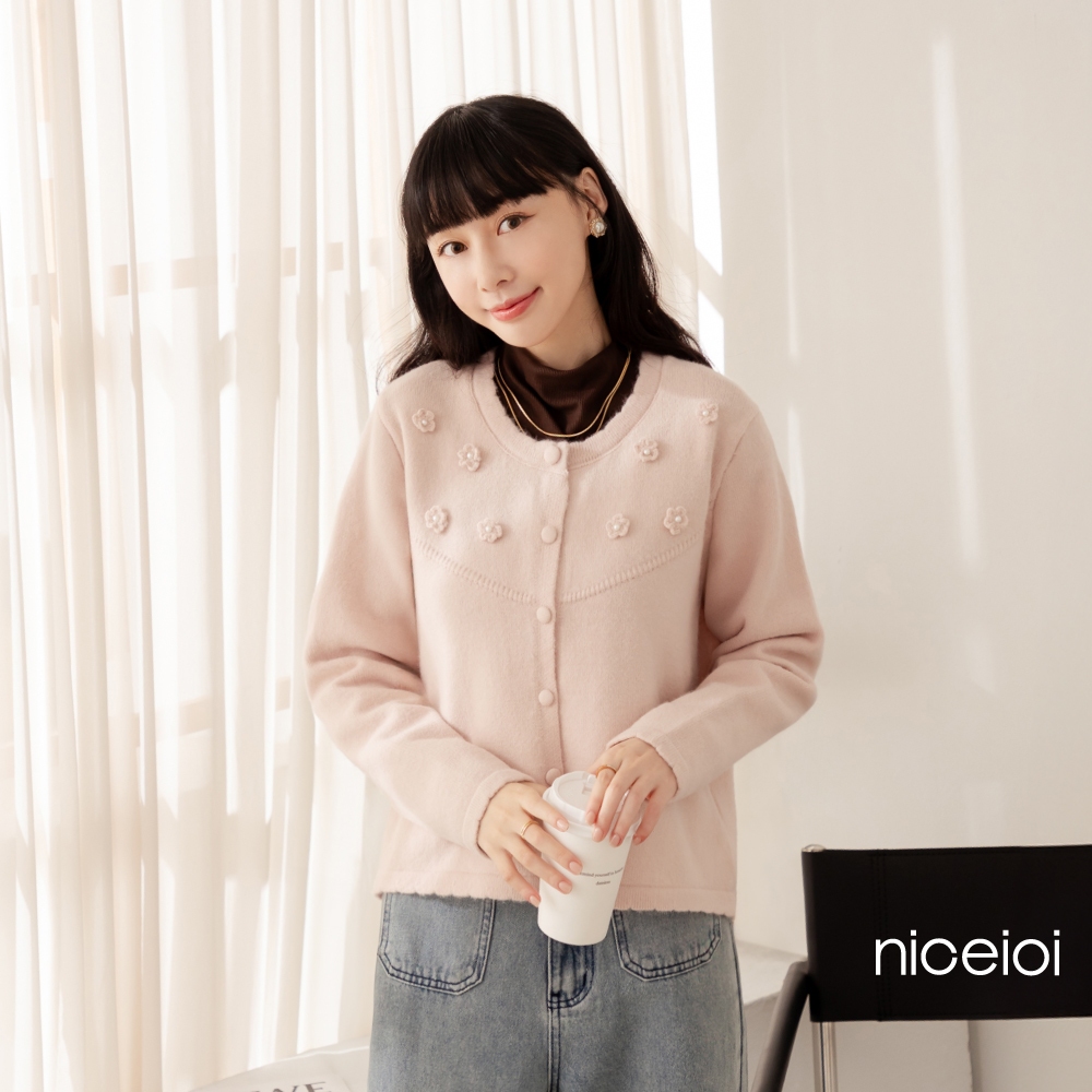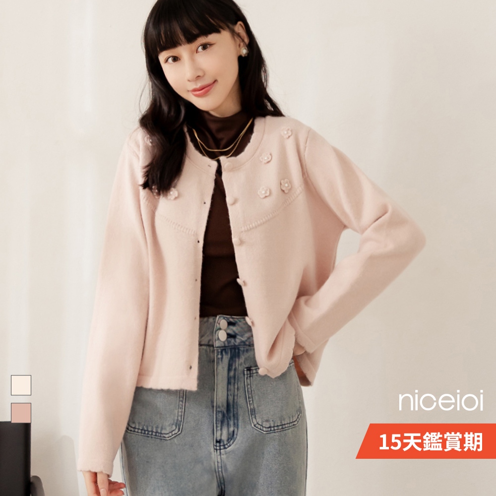niceioi【特惠】針織外套 外套 羊毛外套 粉色 [清新珍珠立體小花針織外套] 女裝米白,F|粉,Fniceioi 官方旗艦店