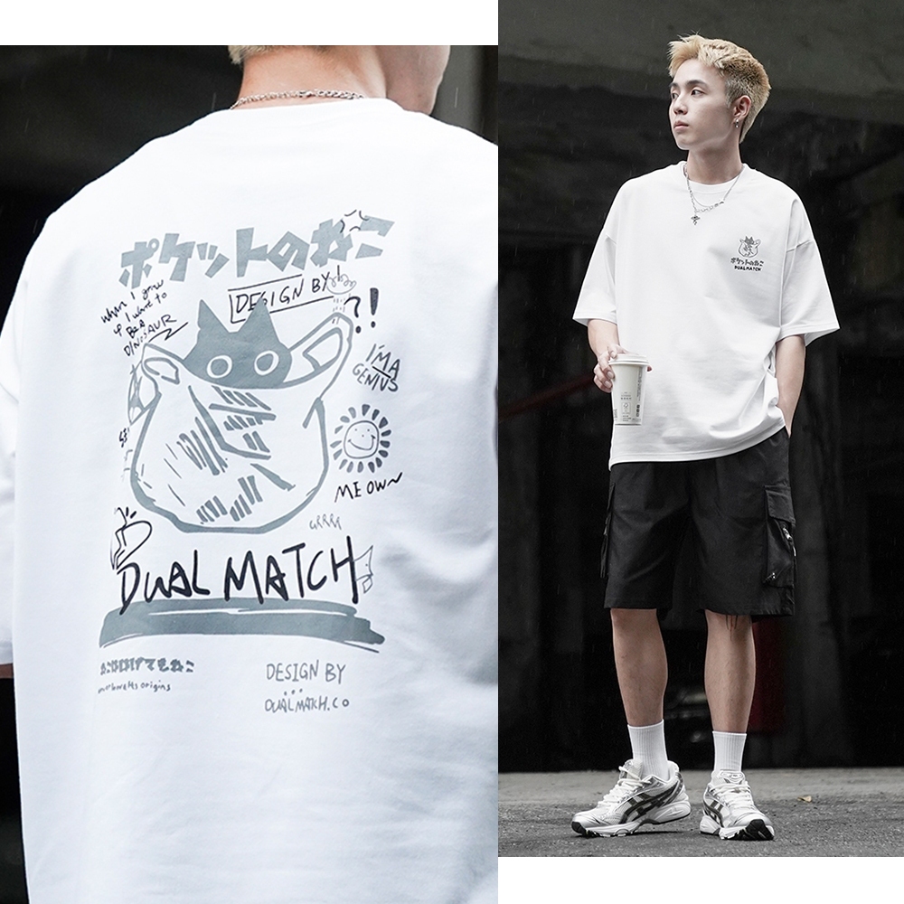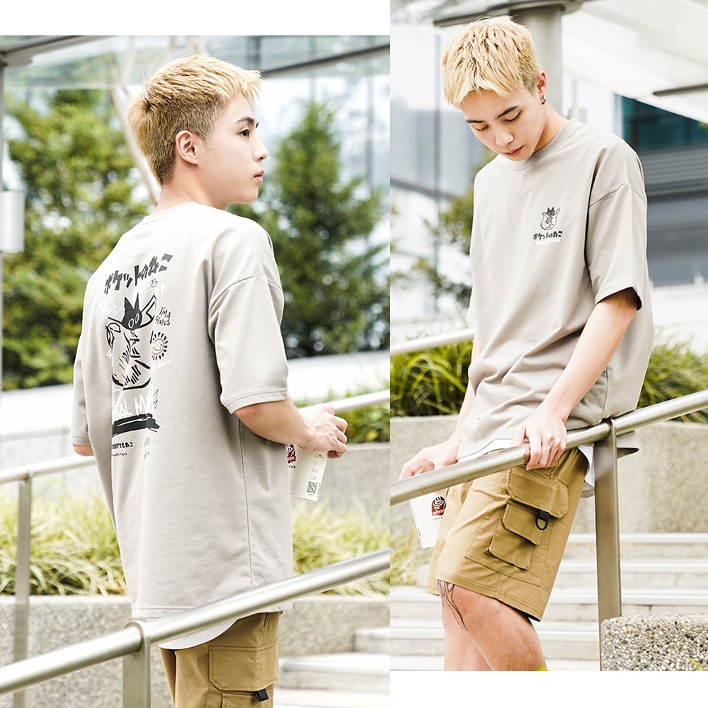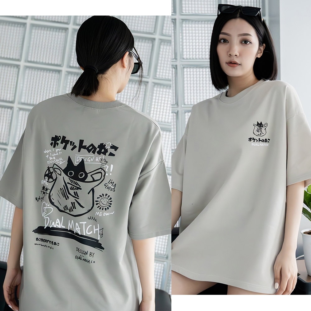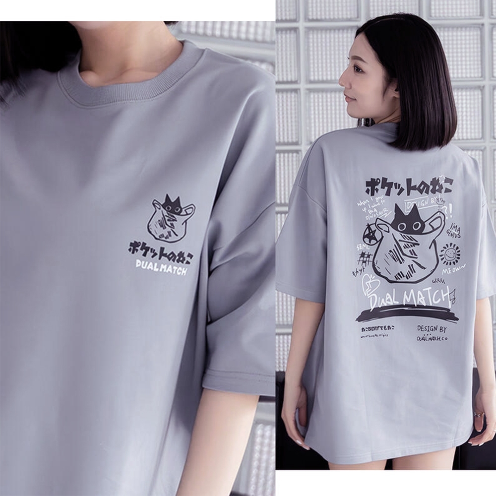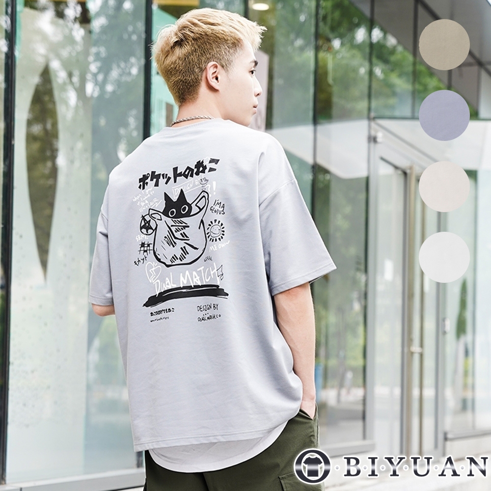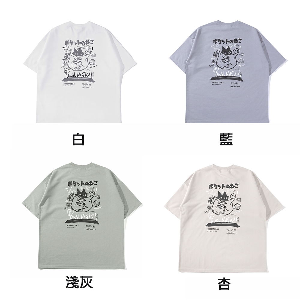 【OBIYUAN】短袖 上衣 繪畫 貓咪 t恤 細絨布 寬鬆 短T 衣服 4色【GJ5232】藍,M|藍,L|白,M|白,L|杏,M|杏,L|淺灰,M|淺灰,LT-shirtsOBIYUAN