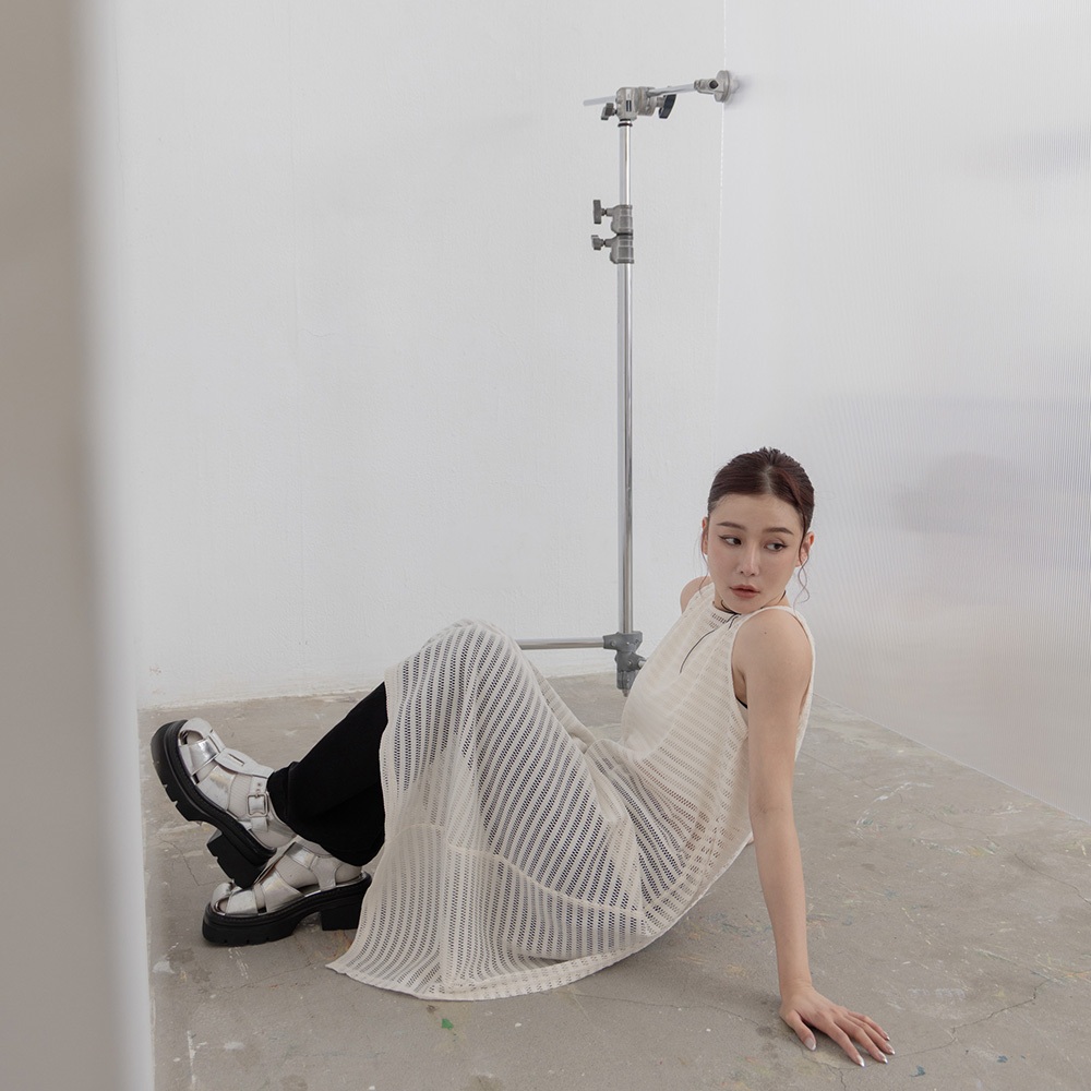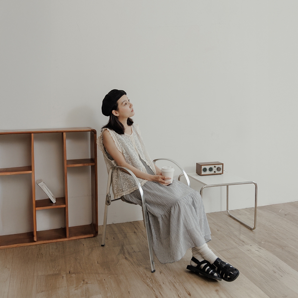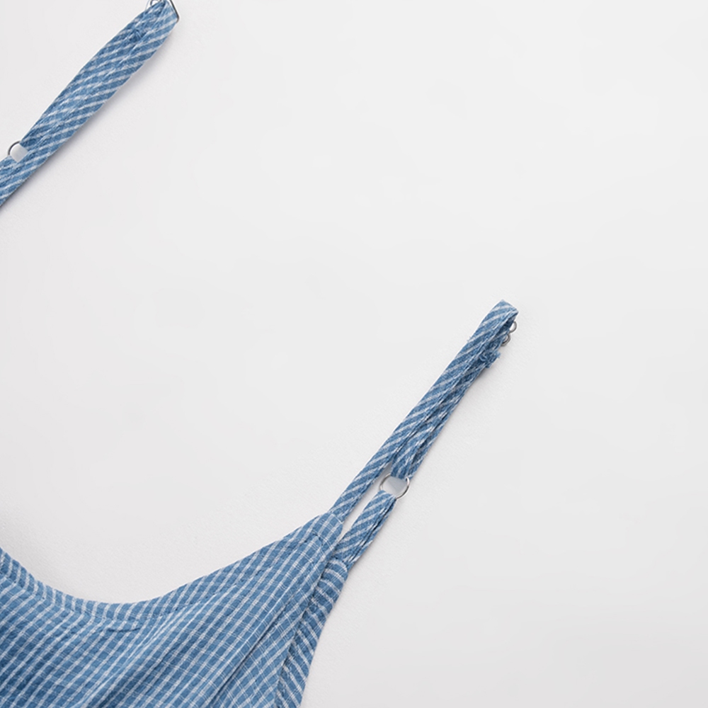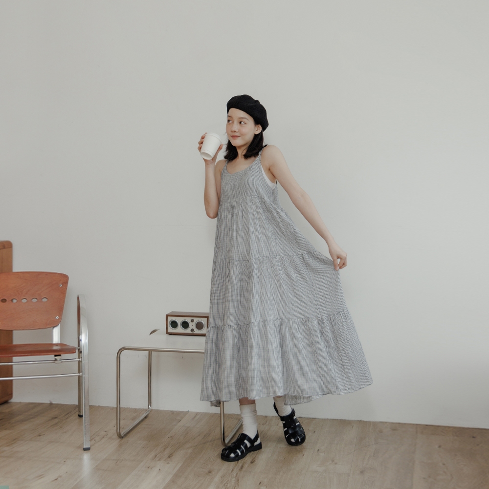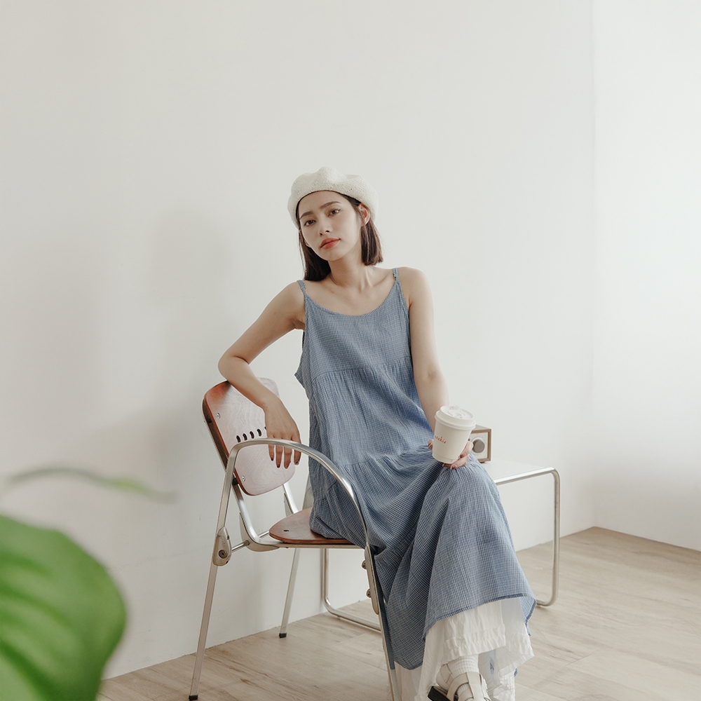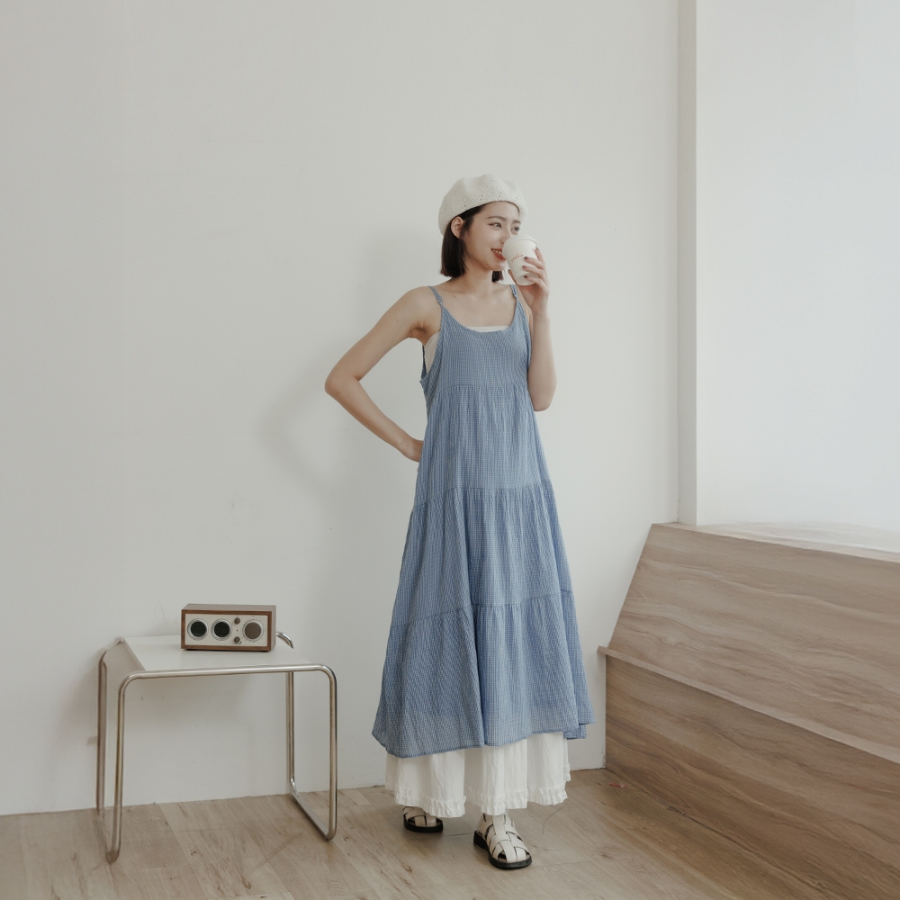 QUEENSHOP_ S 女裝 經典棉麻格紋細肩長洋裝 兩色售 現+預 【01087077】白|藍QUEENSHOP
