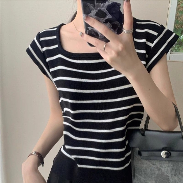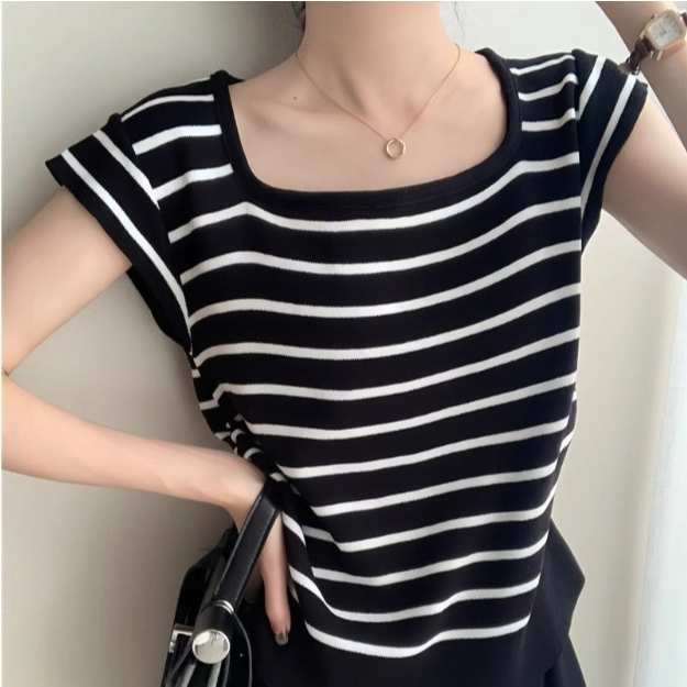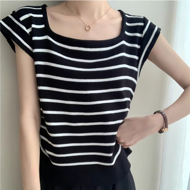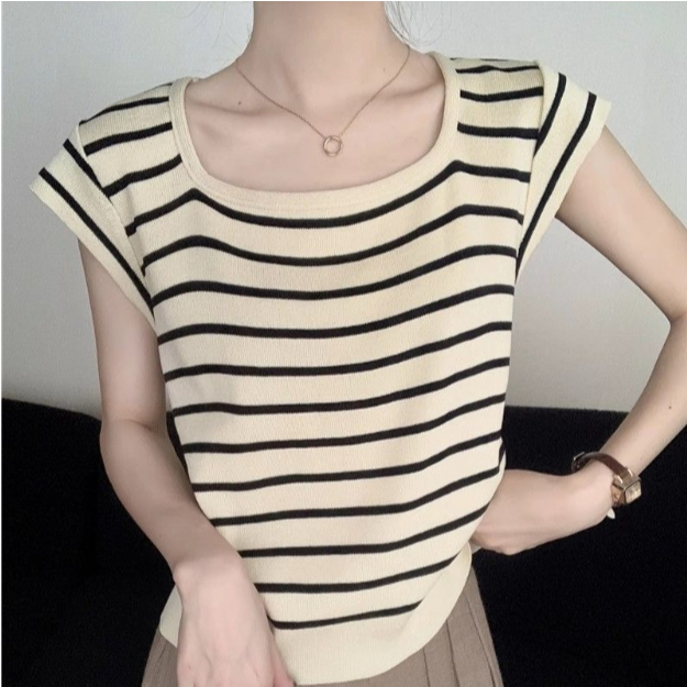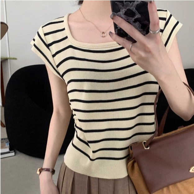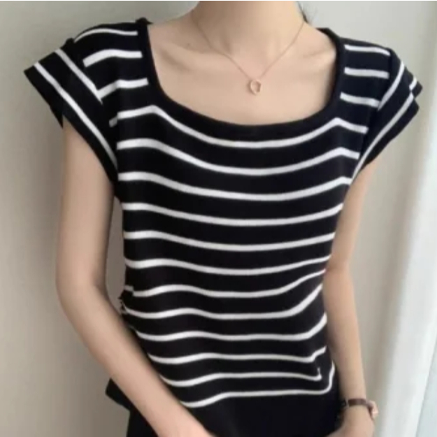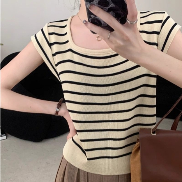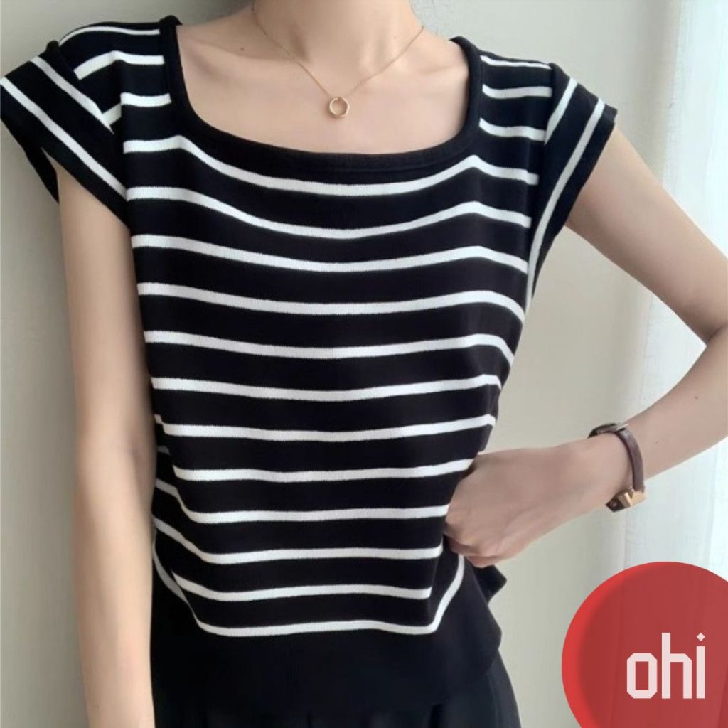【ohi】甜辣薄款方領撞色條紋針織衫 正肩短袖 女生上衣 針織上衣 女裝 顯瘦上衣 韓版上衣 GWH2270杏色,F碼(均碼40-55KG可穿)|黑色,F碼(均碼40-55KG可穿)OthersOHI衣著