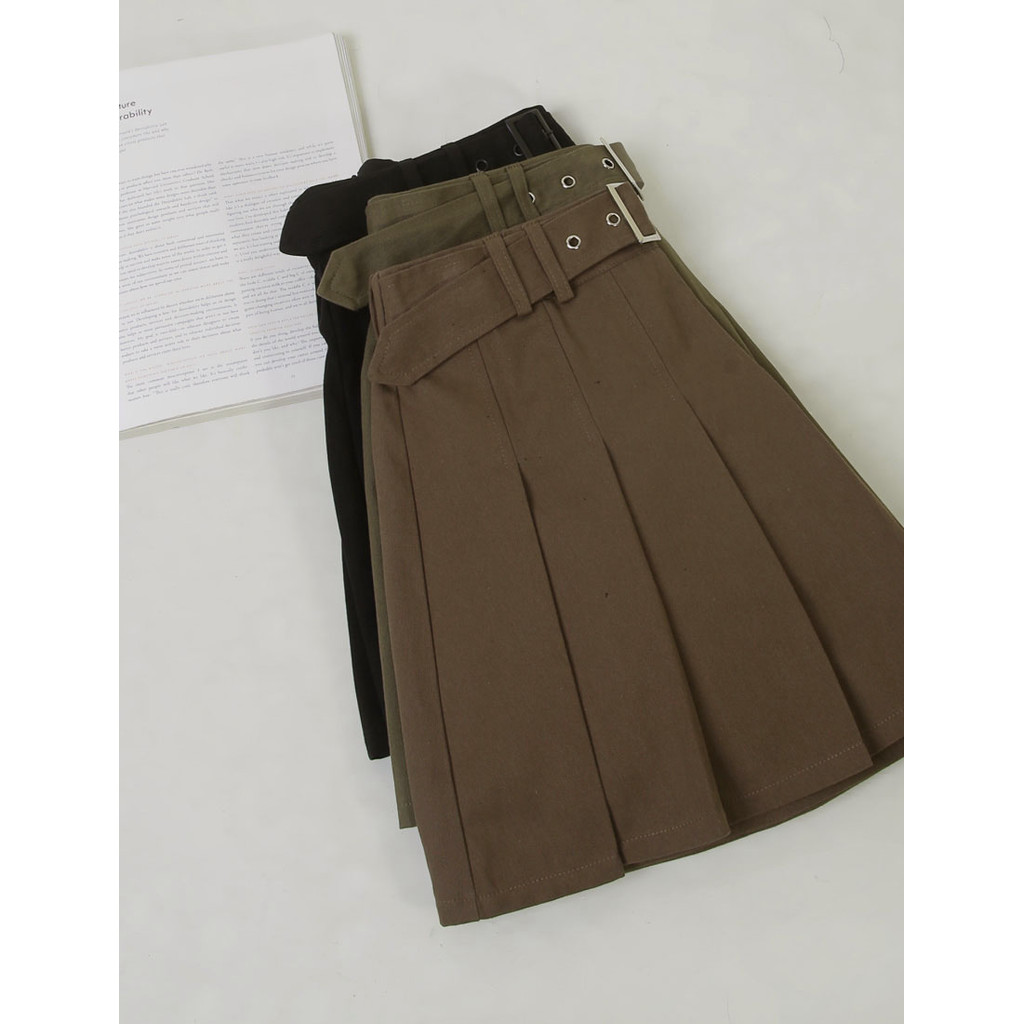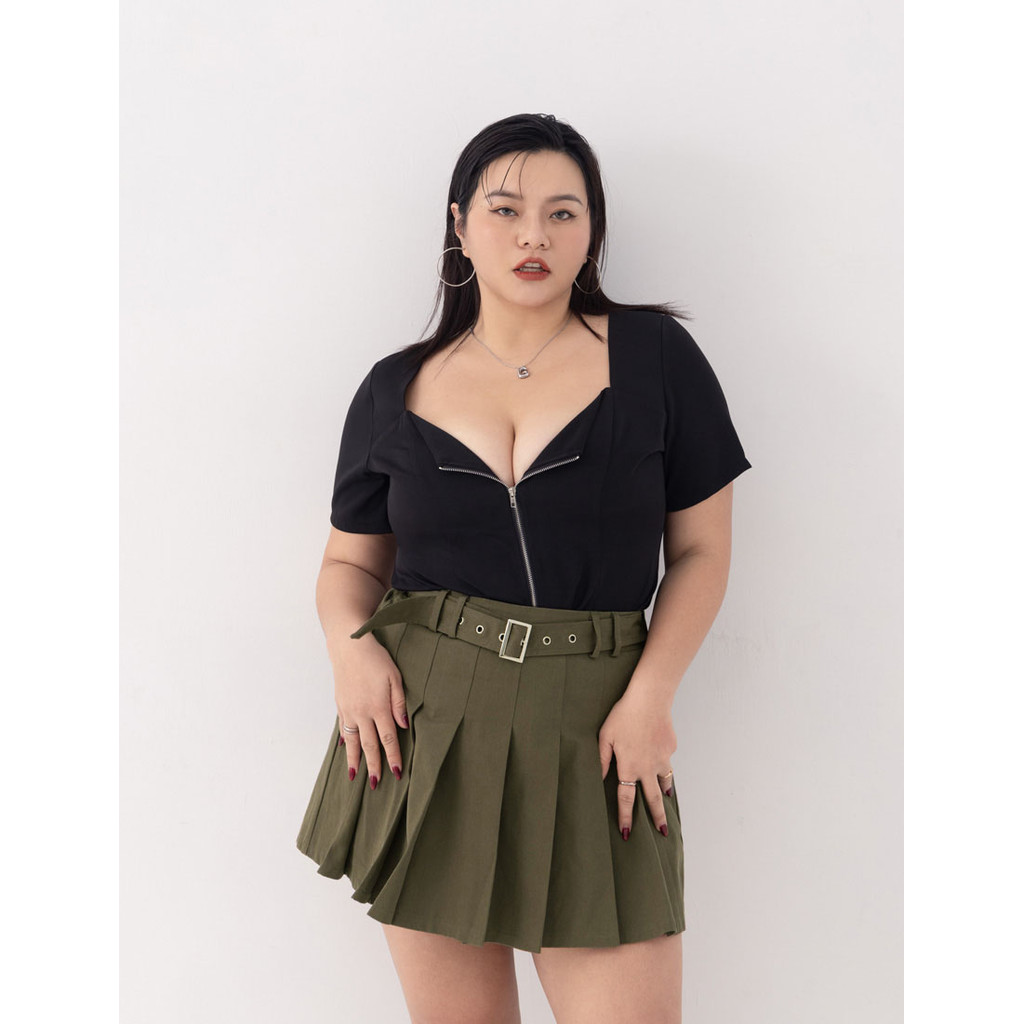 【PolyLulu】 率性假皮帶百褶斜紋短裙(附褲) MUA! 中大尺碼裙子 灰綠色2XL|3XL|L|XLPOLY LULU丨BEAUTY HAS NO SIZE 中大尺碼女裝