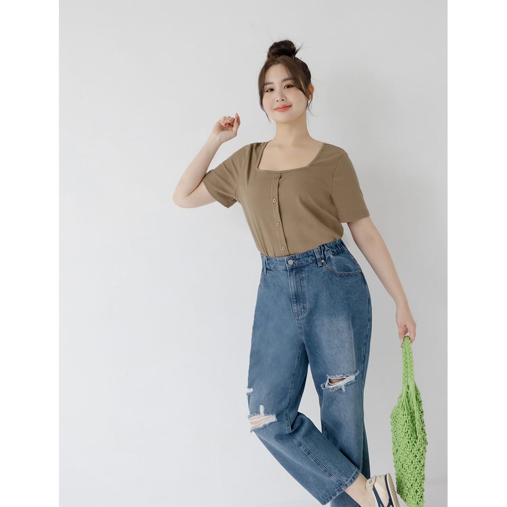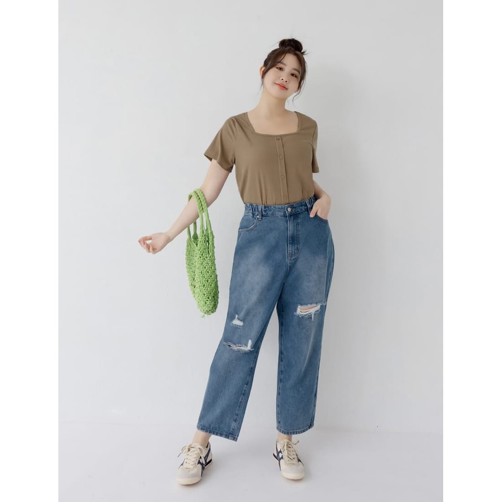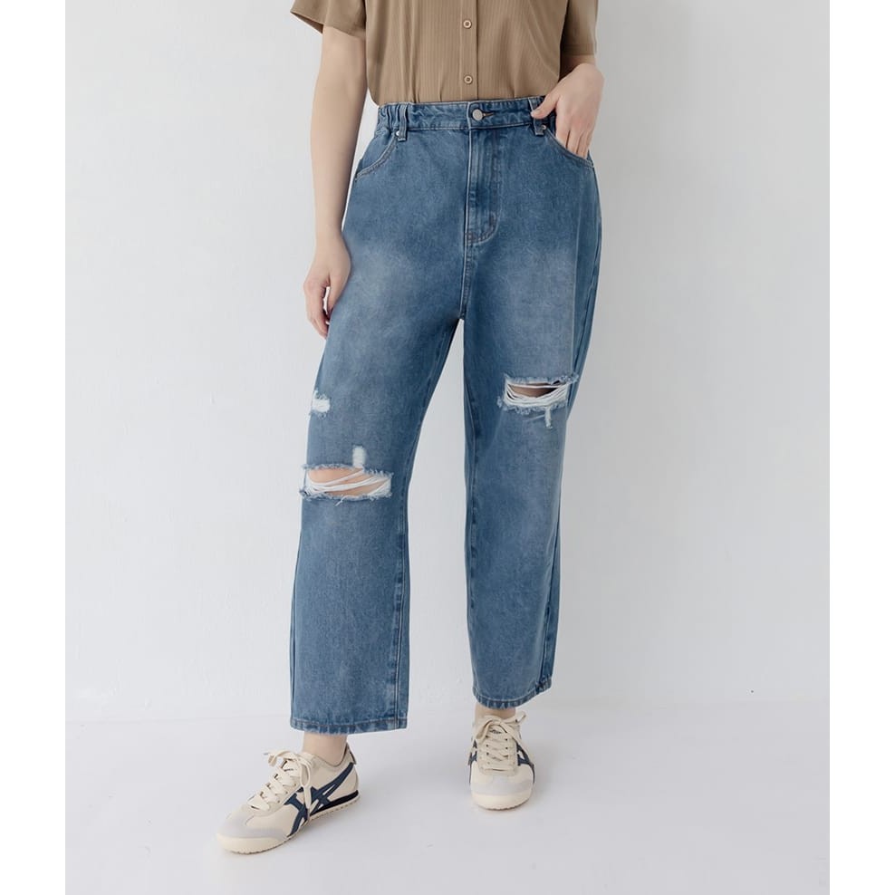 【PolyLulu】 側腰鬆緊刷破牛仔男友褲 中大尺碼褲子 深藍色XL|2XL|3XL|4XL|LPOLY LULU丨BEAUTY HAS NO SIZE 中大尺碼女裝
