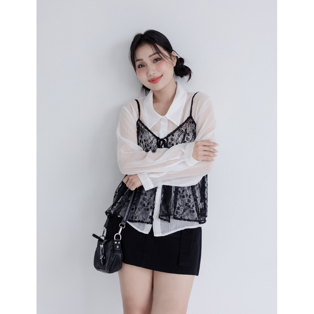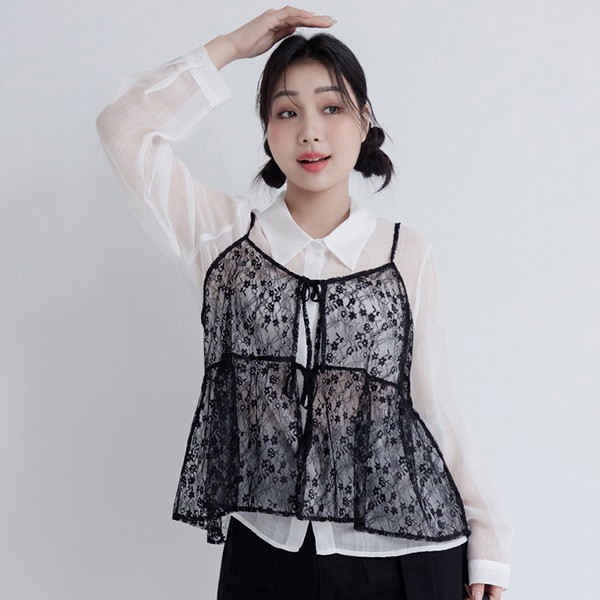 【PolyLulu】 日系可調式蕾絲綁帶背心 中大尺碼上衣 黑色