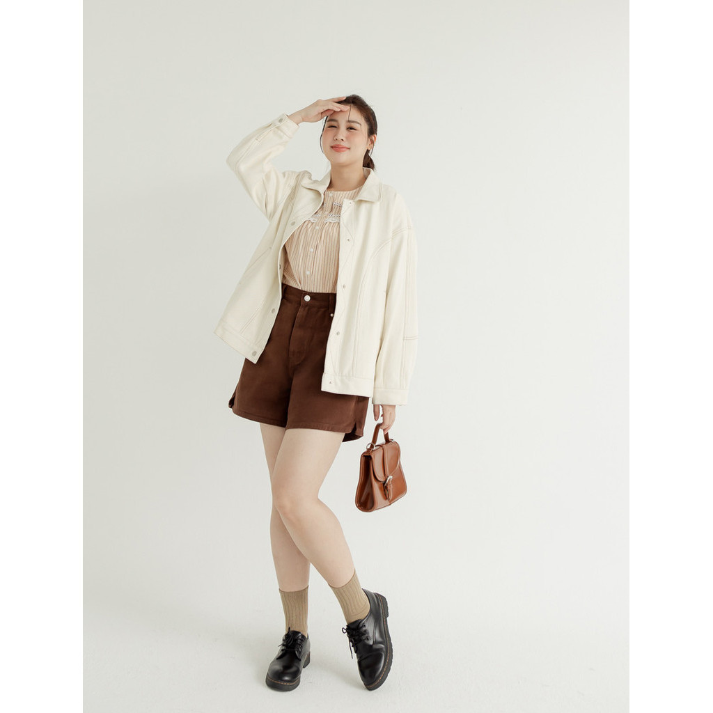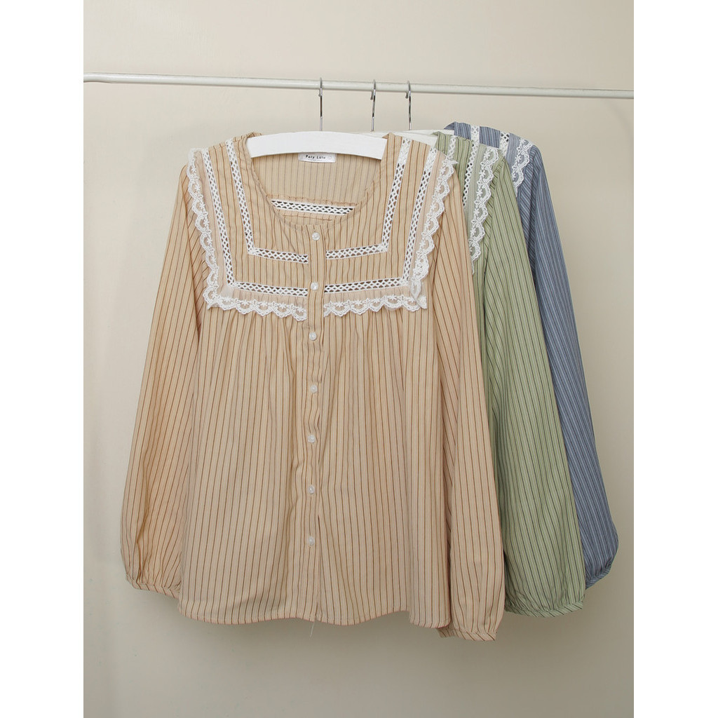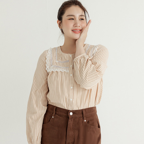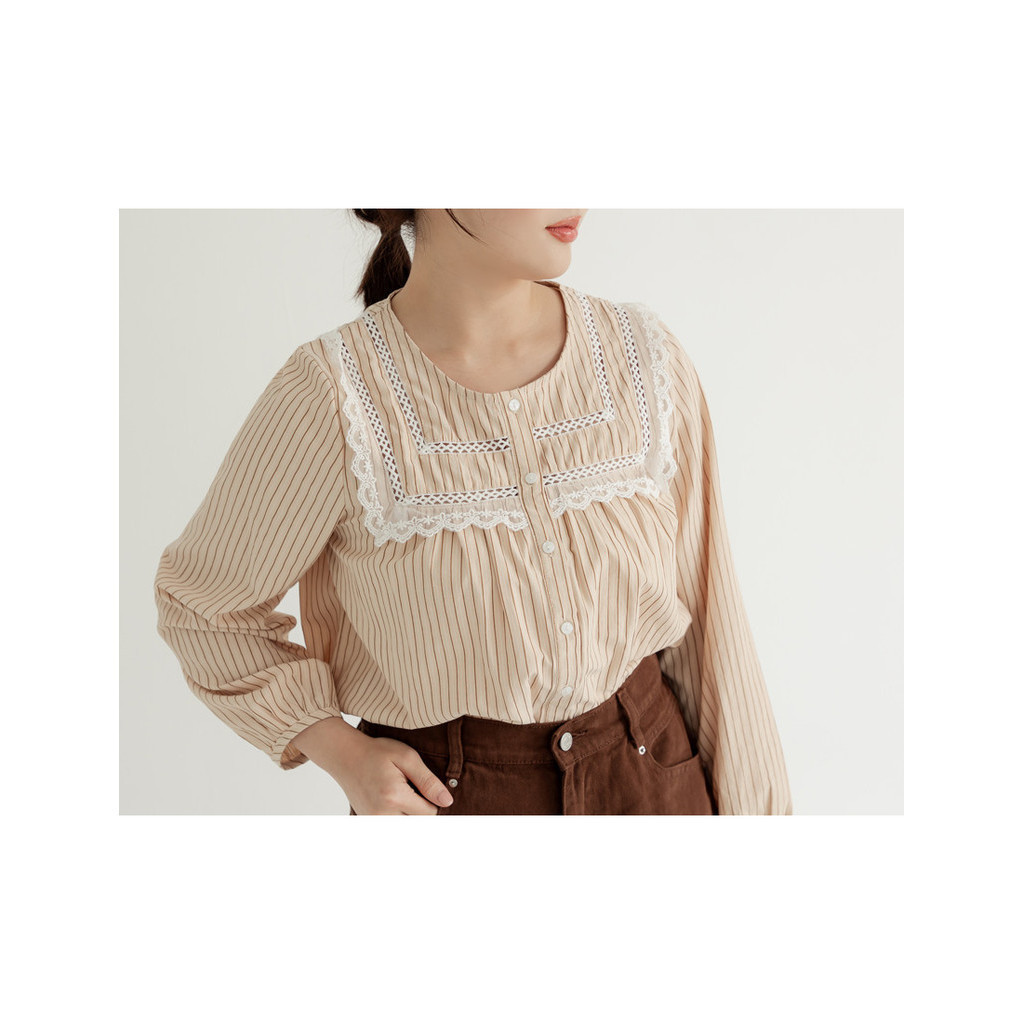 【PolyLulu】 俏皮直條紋拼蕾絲抓褶圓領長袖襯衫 中大尺碼上衣 奶茶色L|XL|2XL|3XLShirts & BlousesPOLY LULU丨BEAUTY HAS NO SIZE 中大尺碼女裝