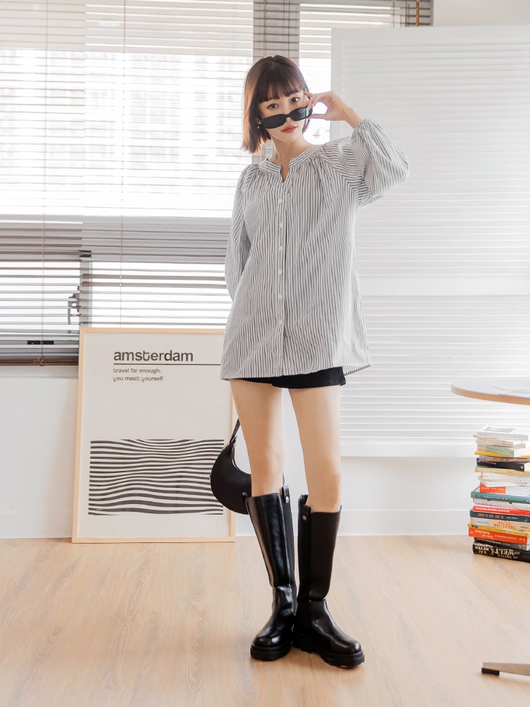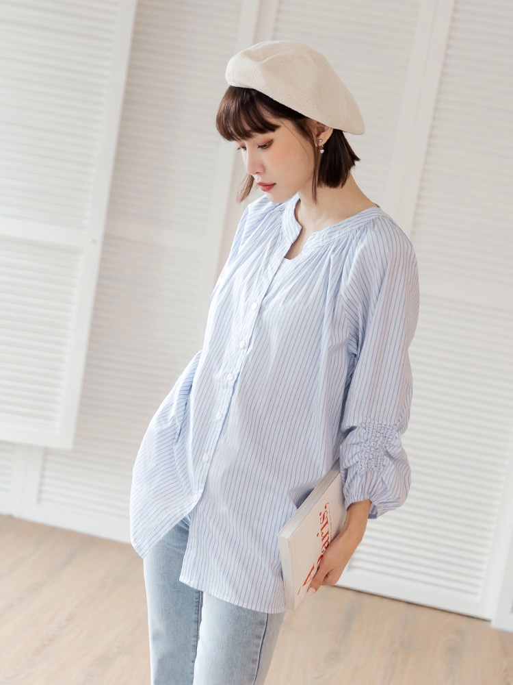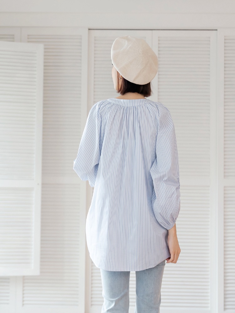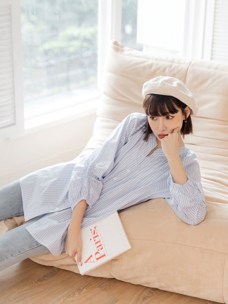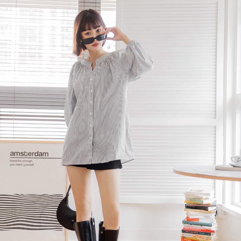 OB嚴選 棉質細條紋排釦拋袖長版上衣 《AB18928》大尺碼/現貨/女裝霧藍,M|霧藍,L|黑,XL|黑,2L|黑,3L|霧藍,XL|霧藍,2L|霧藍,3L|黑,M|黑,LT-shirtsOB嚴選官方旗艦店