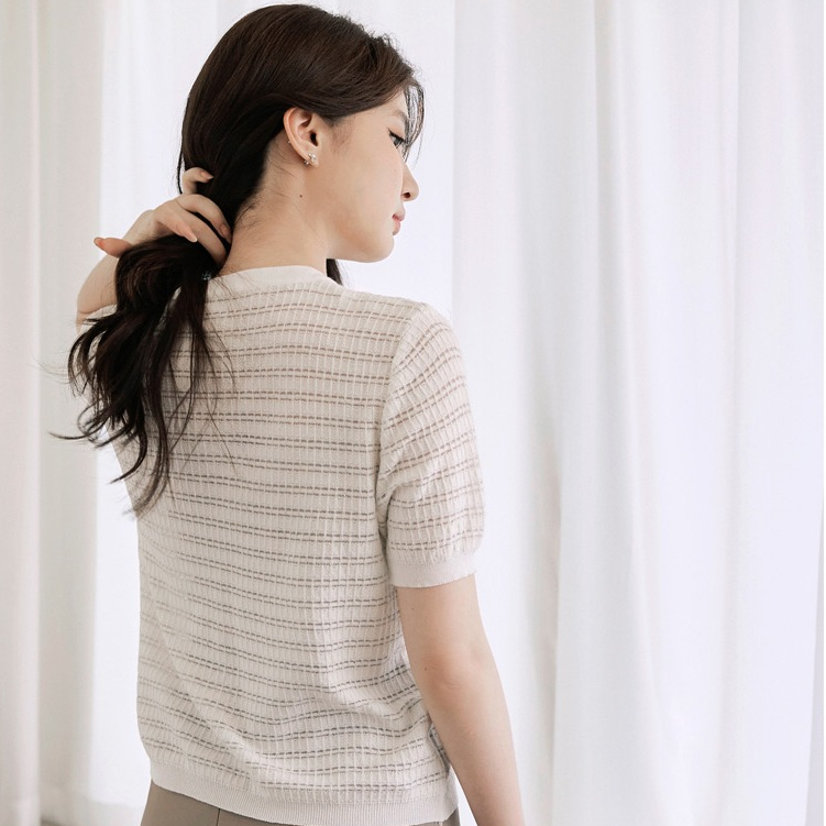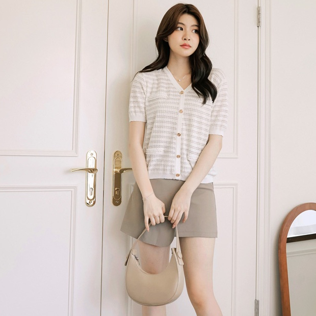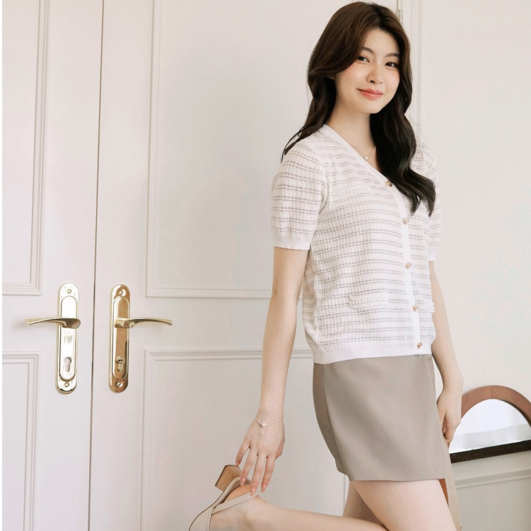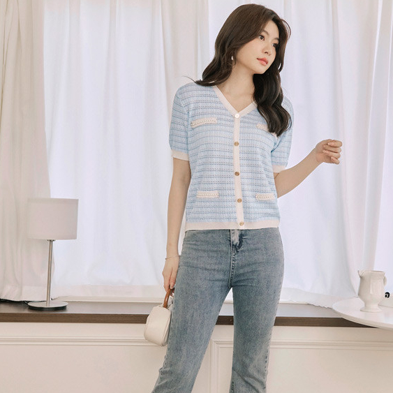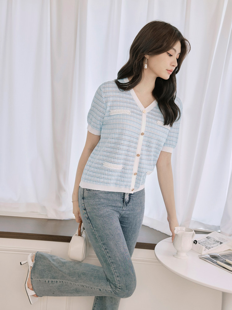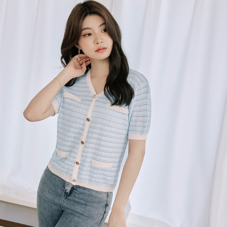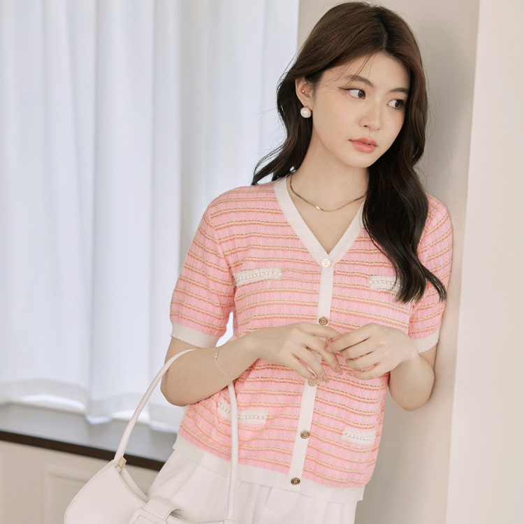 OB嚴選 小香風V領造型排釦短袖針織上衣 《FA3029》女裝/現貨白,M|粉紅,M|淺水藍,MOB嚴選官方旗艦店