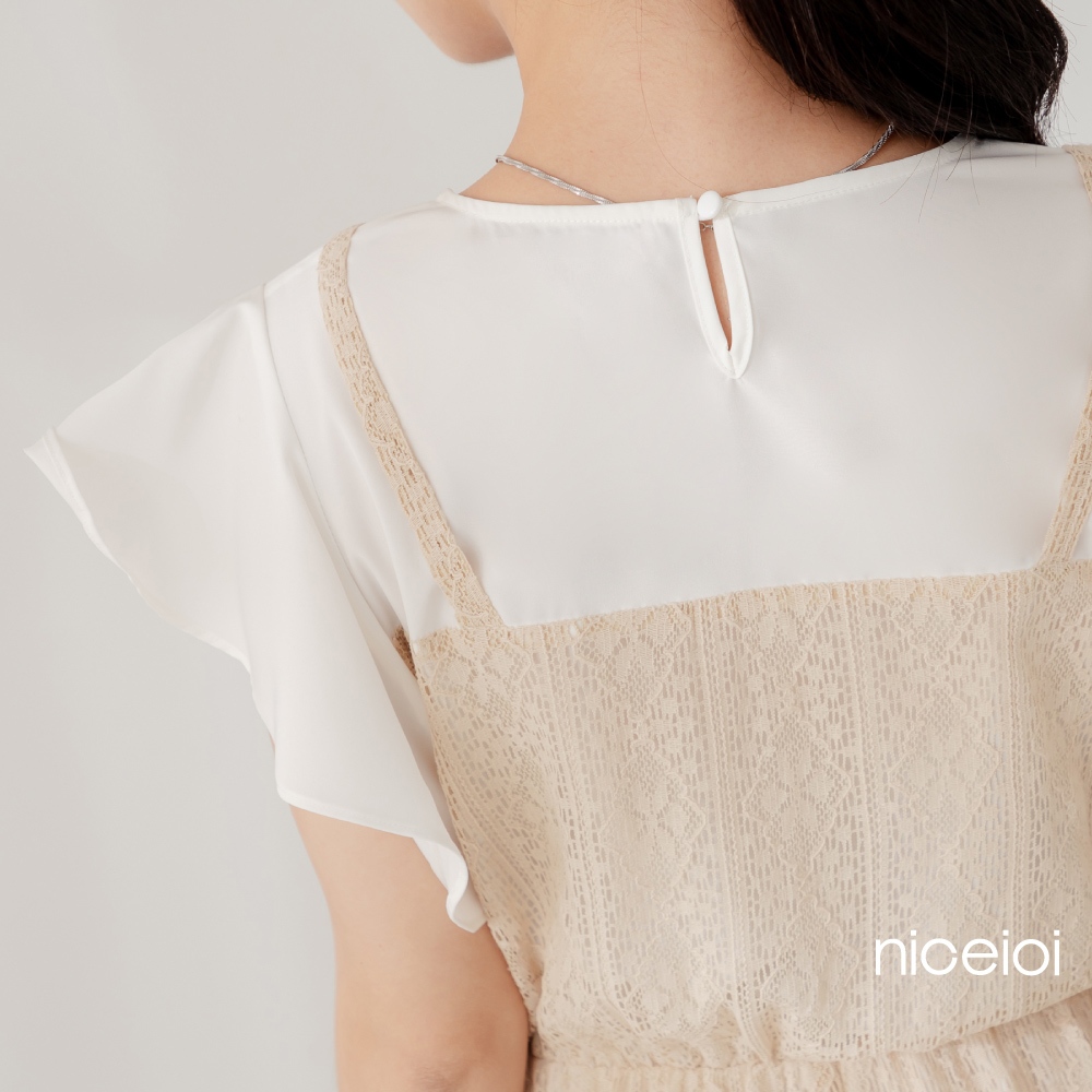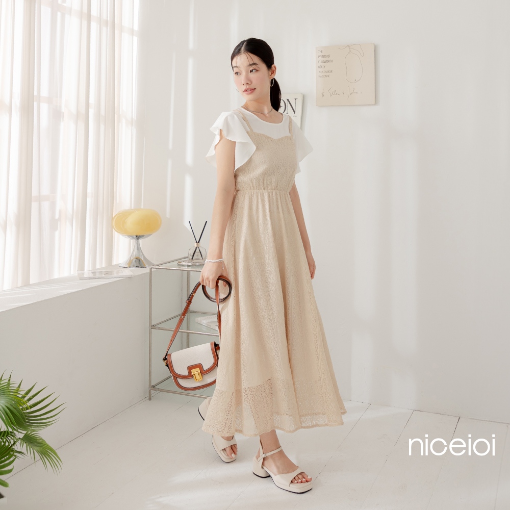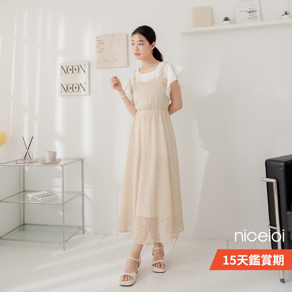 niceioi【特惠】荷葉袖長洋 洋裝 蕾絲洋裝 卡其色 [甜美荷葉袖假兩件蕾絲洋裝] 涼感洋裝 冰絲 女裝涼感蕾絲洋裝-卡其,L|涼感蕾絲洋裝-卡其,XL|涼感蕾絲洋裝-卡其,S|涼感蕾絲洋裝-卡其,Mniceioi 官方旗艦店