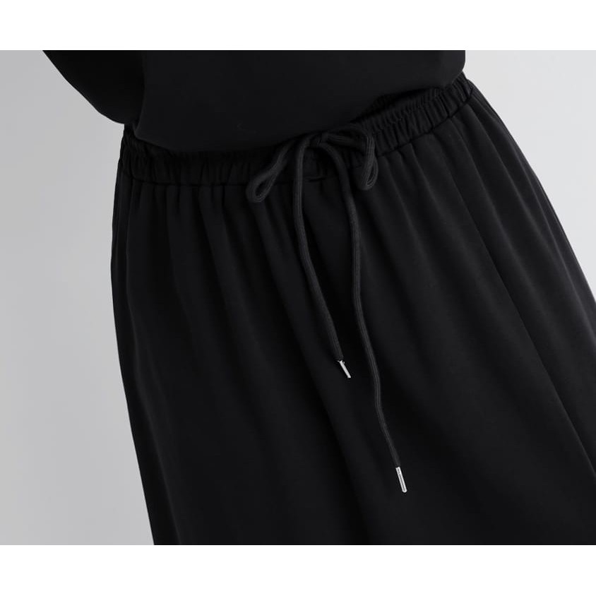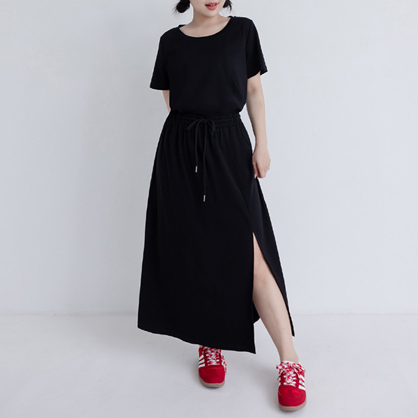 【PolyLulu】 絲滑涼感液氨棉開衩鬆緊長裙 中大尺碼裙子 黑色