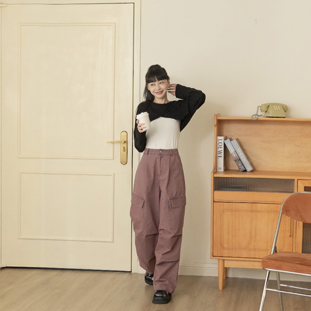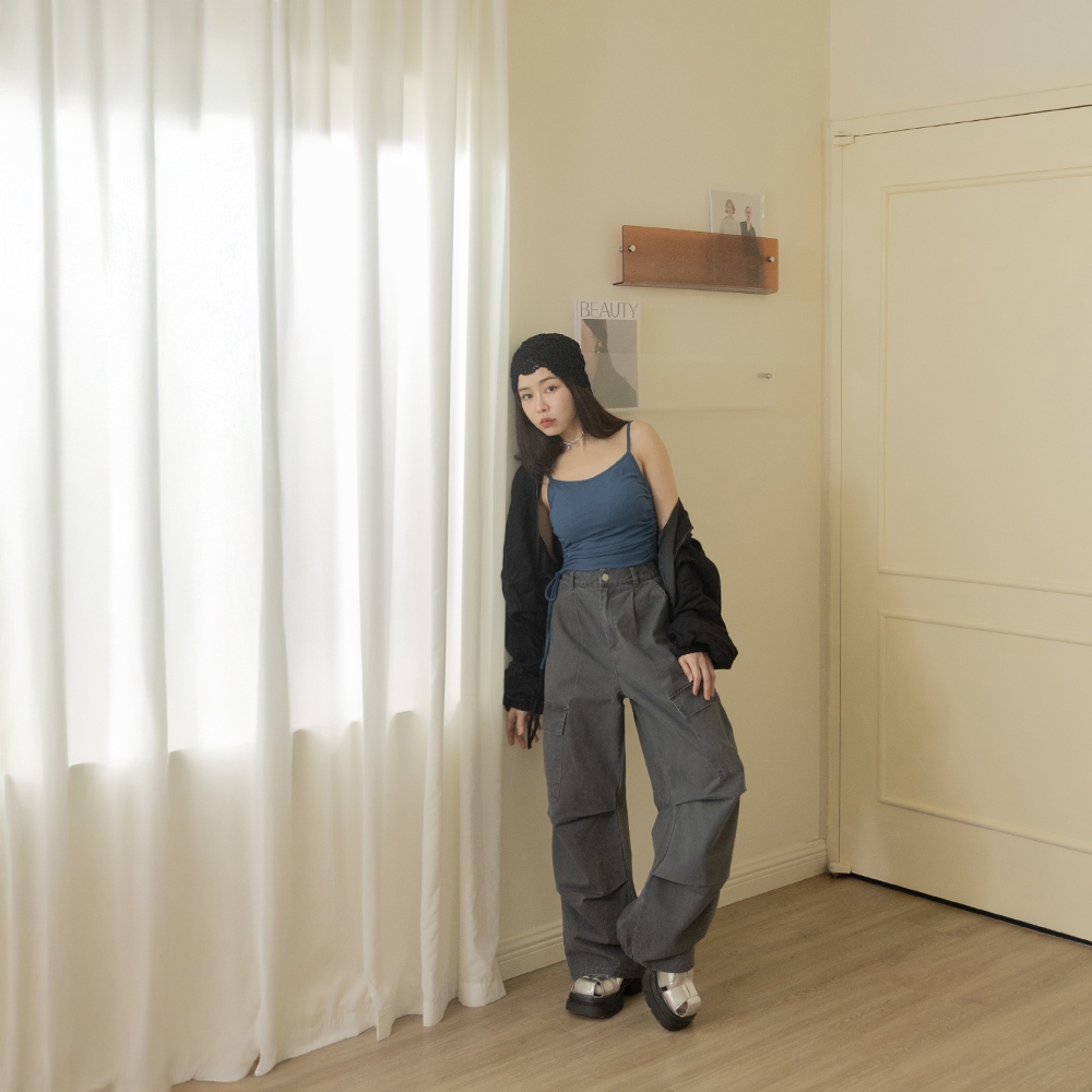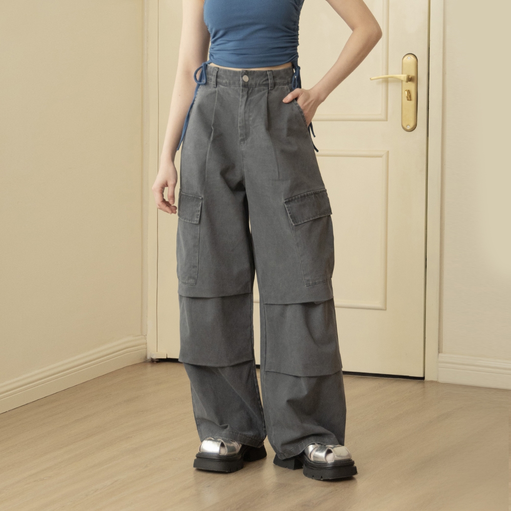 QUEENSHOP_ S 女裝 打褶大口袋洗水工裝長褲 三色售 S/M/L現+預 【04101941】深灰S|深灰M|深灰LPantsQUEENSHOP