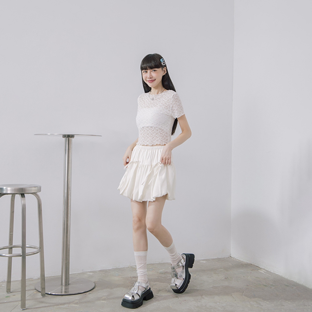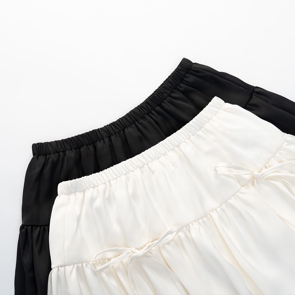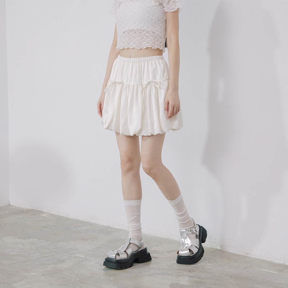 QUEENSHOP_ S 女裝 緞面綁帶花苞造型澎澎短裙 兩色售 S/M 現+預 【03010894】黑S|黑M|米白S|米白MQUEENSHOP