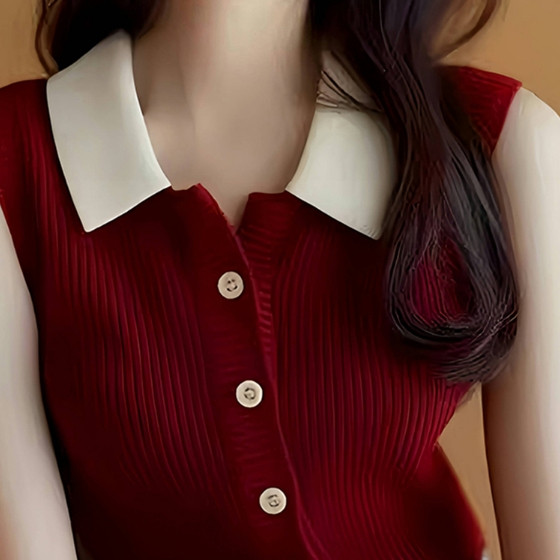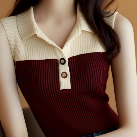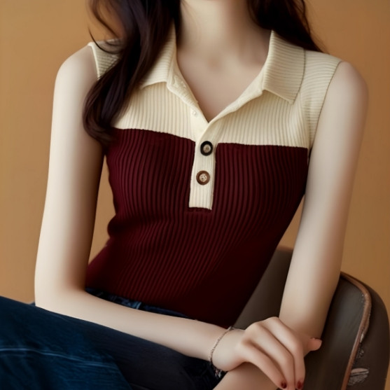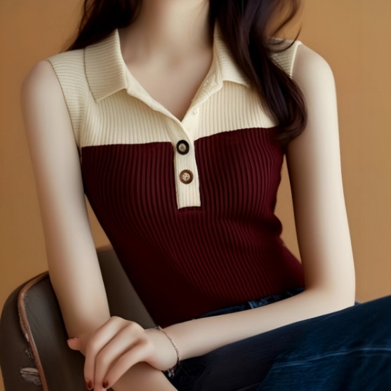【ohi】背心上衣 復古紅色撞色針織開衫 翻領打底背心 小眾絕美上衣 針織衫 秋款女裝 GVH2183棗紅,F均碼(40-55KG可穿)|棗紅拼杏,F均碼(40-55KG可穿)Tanks & CamisolesOHI衣著