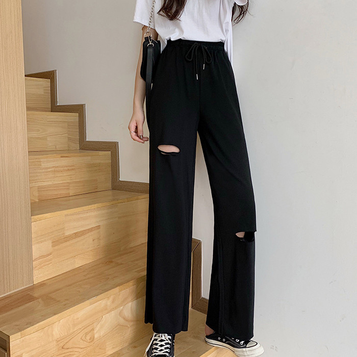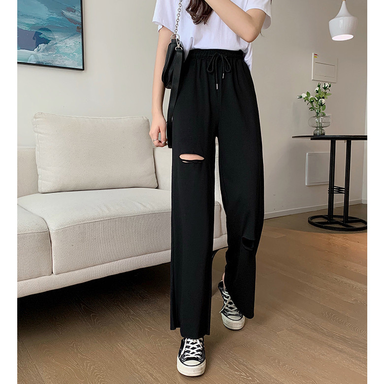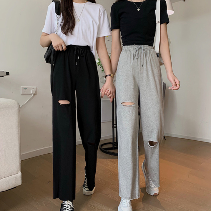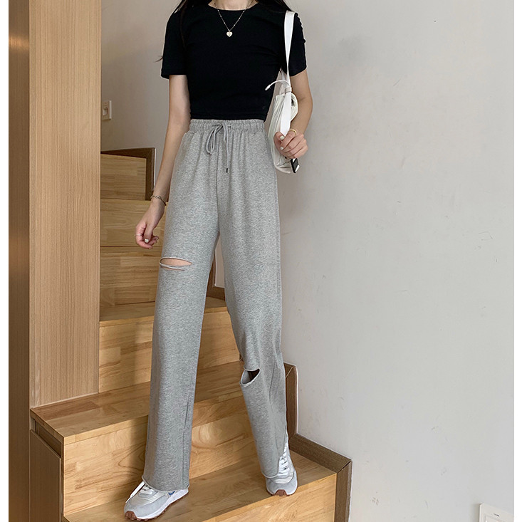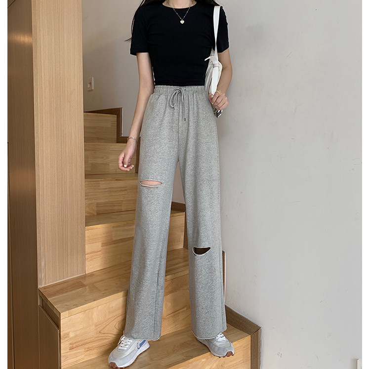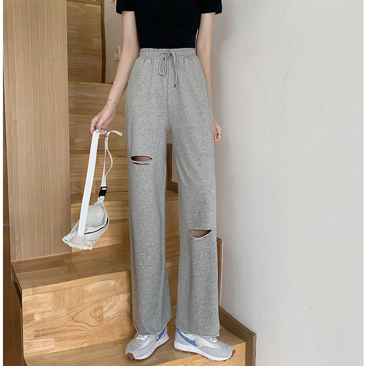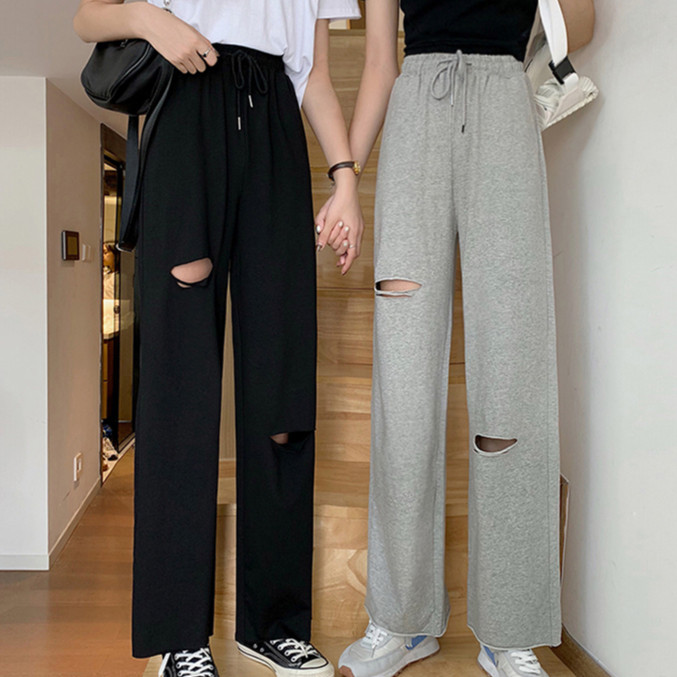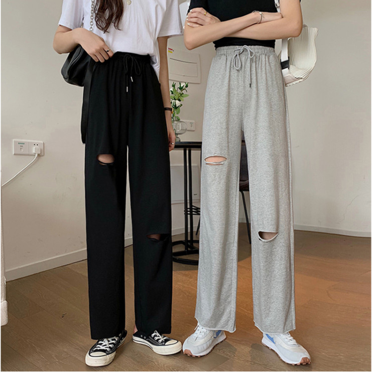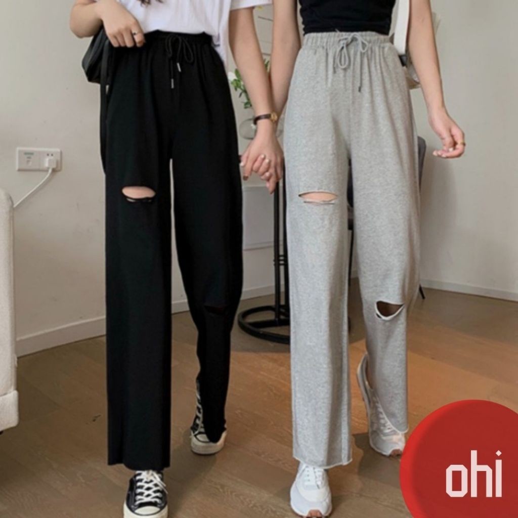 【ohi】韓系 破洞 休閒 寬褲 鬆緊腰 高腰 直筒褲 運動褲 顯瘦 闊腿褲 直筒褲 落地褲 拖地褲 越破越好GPD18灰色|黑色PantsOHI衣著