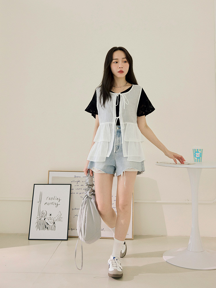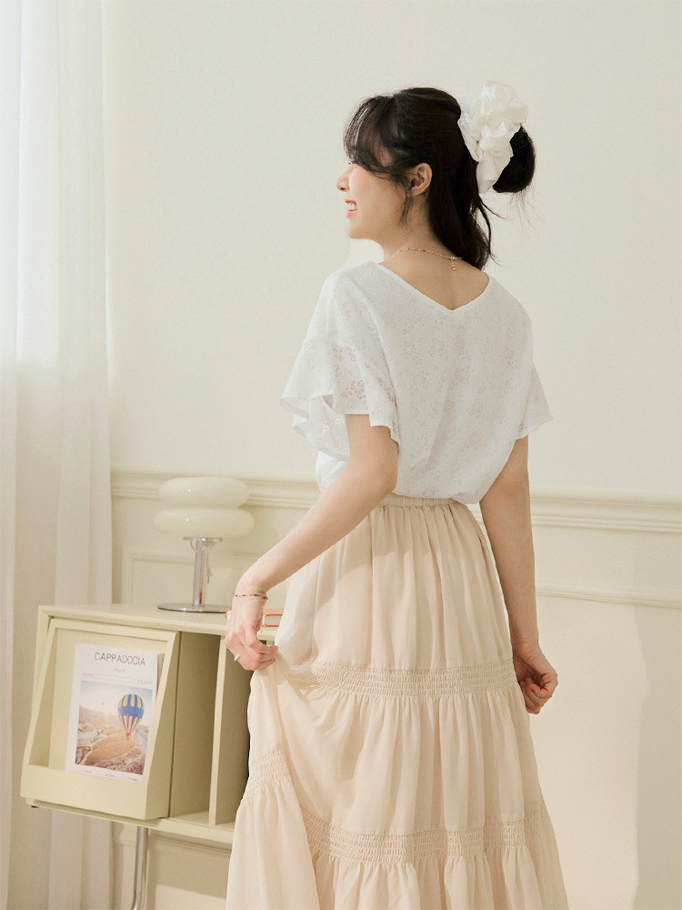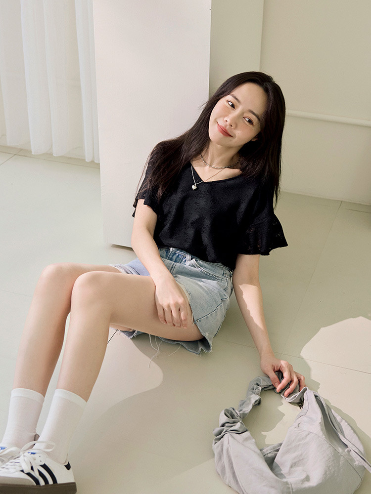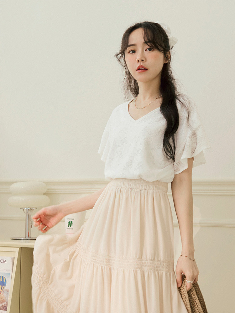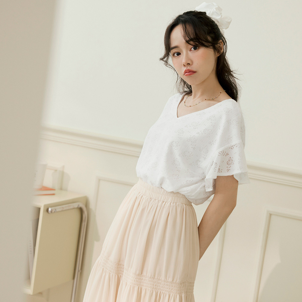 OB嚴選 V領蕾絲雕花荷葉袖短袖上衣 《AB20257》白,S|白,M|白,L|白,XL|白,2L|白,3L|黑,S|黑,M|黑,L|黑,XL|黑,2L|黑,3LT-shirtsOB嚴選官方旗艦店