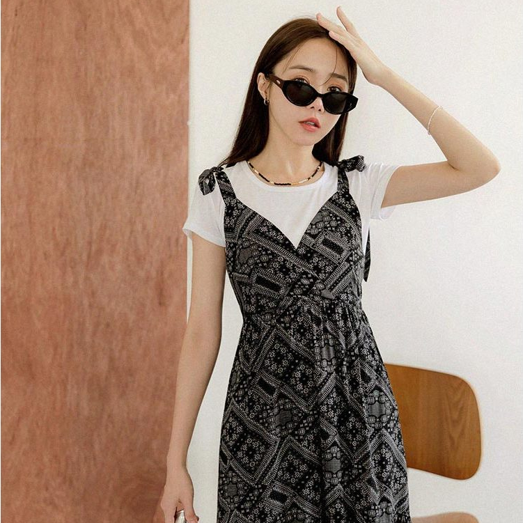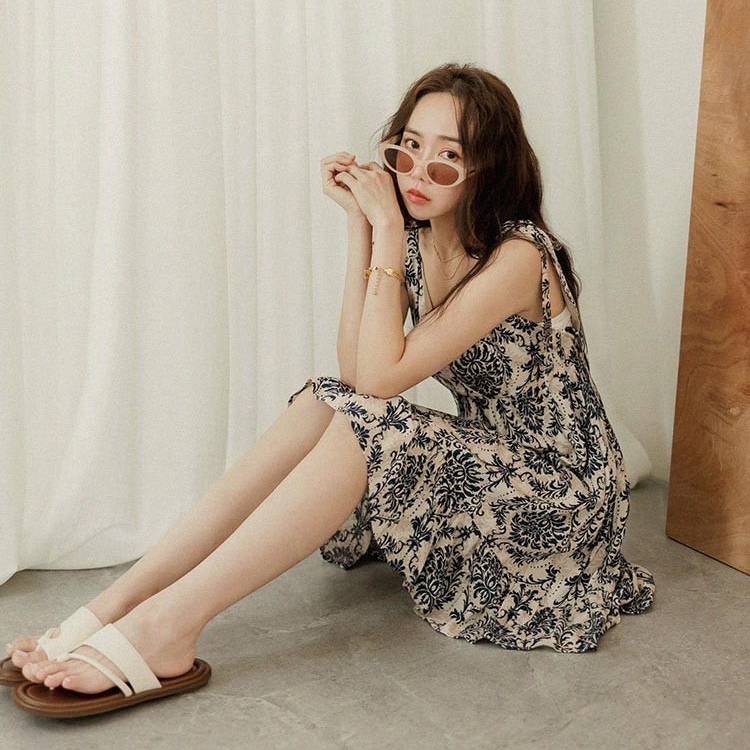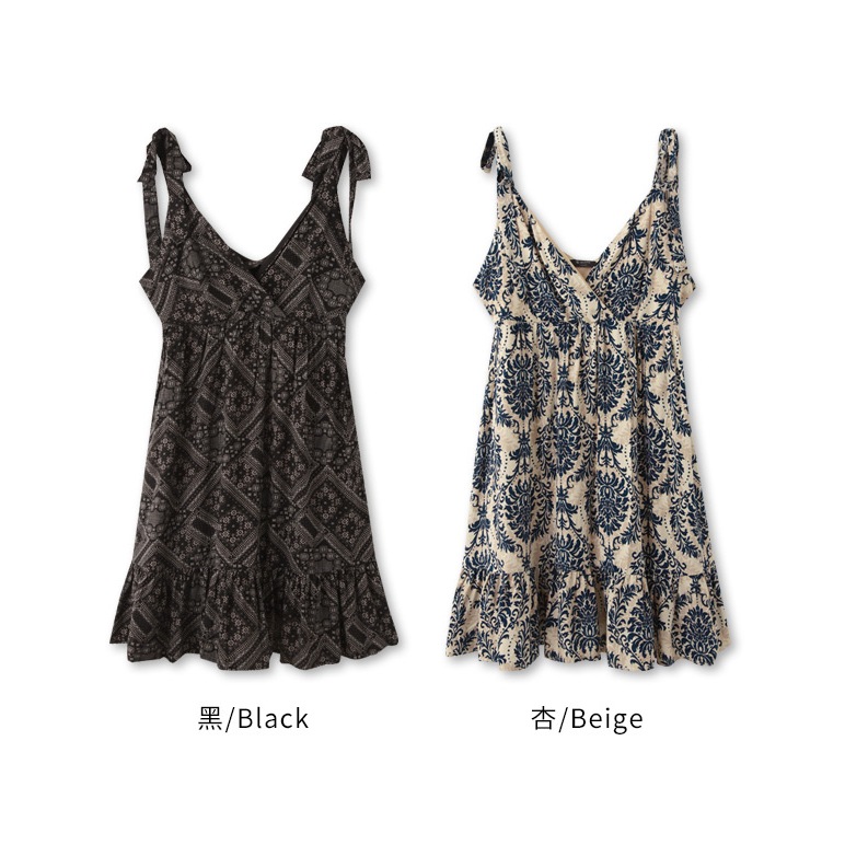 OB嚴選 度假印花V領肩綁帶傘襬洋裝 《DA10088》時髦/現貨/女裝黑,S|黑,M|黑,L|黑,XL|杏,S|杏,M|杏,L|杏,XLOB嚴選官方旗艦店