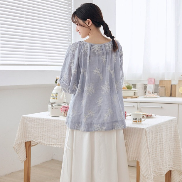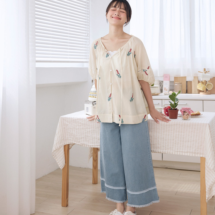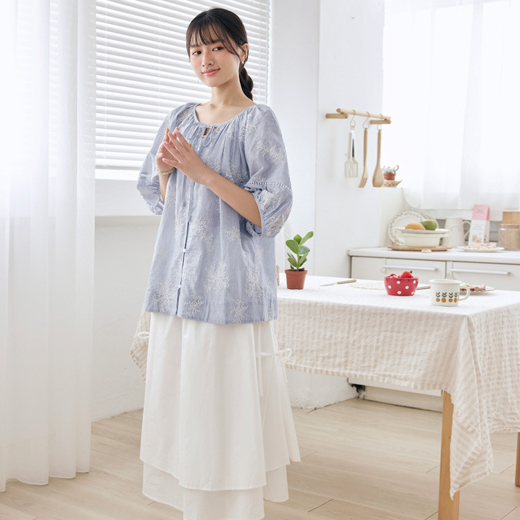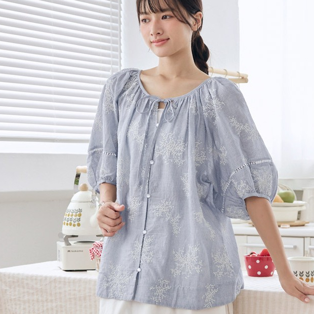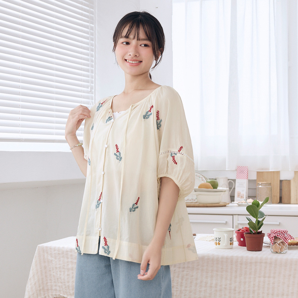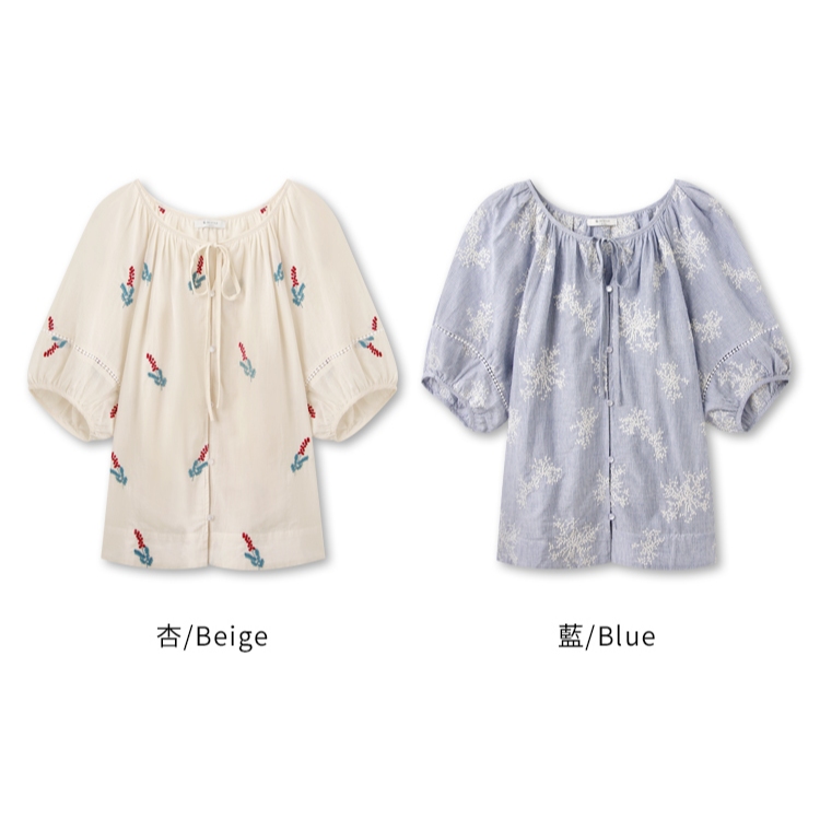 OB嚴選 純棉刺繡綁帶澎袖上衣 《AB20492》杏,F|杏,XL|杏,2L|杏,3L|藍,F|藍,XL|藍,2L|藍,3LT-shirtsOB嚴選官方旗艦店