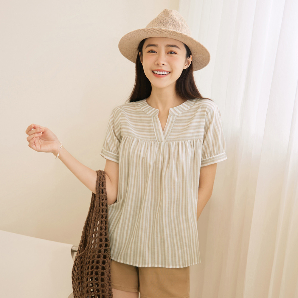 OB嚴選 純棉條紋小V領傘襬拋袖上衣 《AB18717》淺水藍,S|淺水藍,M|淺水藍,L|淺水藍,XL|淺水藍,2L|淺水藍,3L|卡其,S|卡其,M|卡其,L|卡其,XL|卡其,2L|卡其,3LT-shirtsOB嚴選官方旗艦店