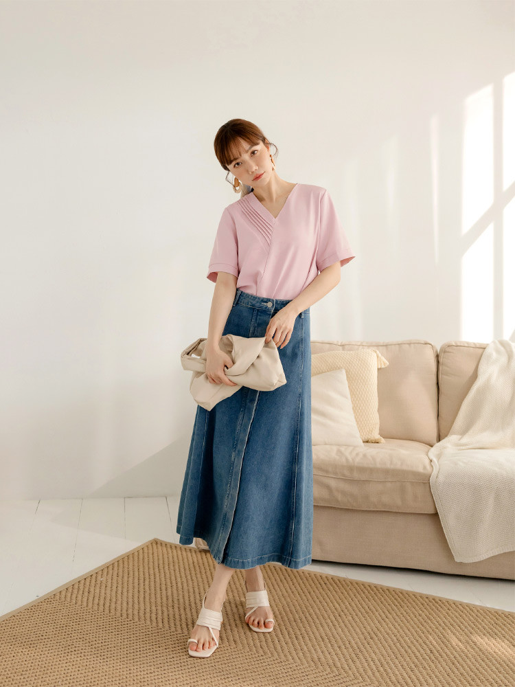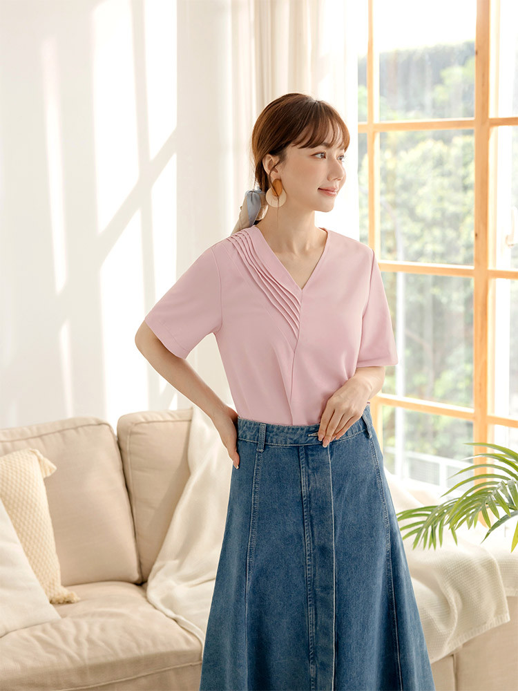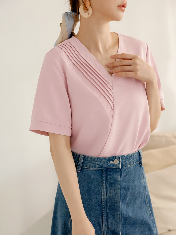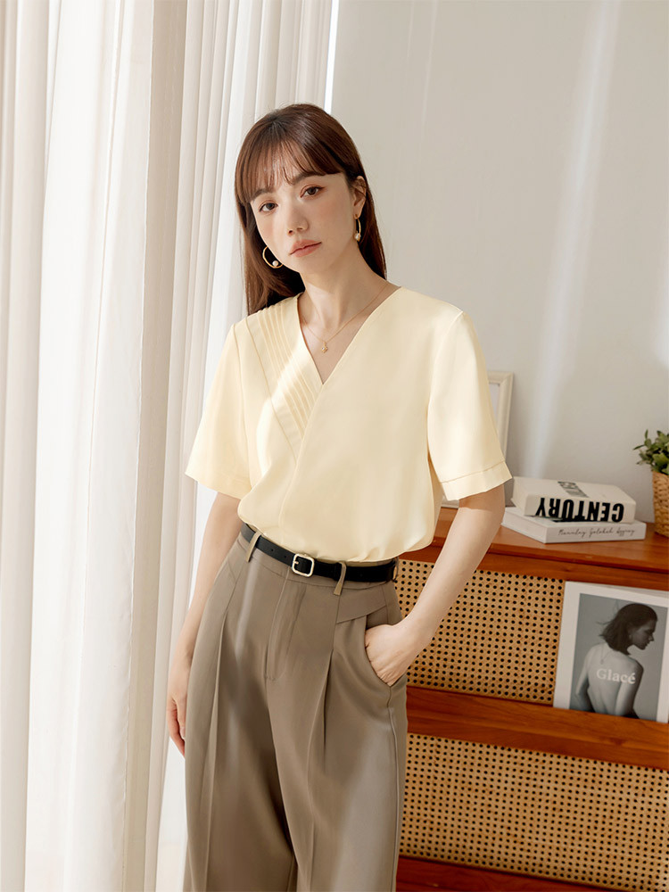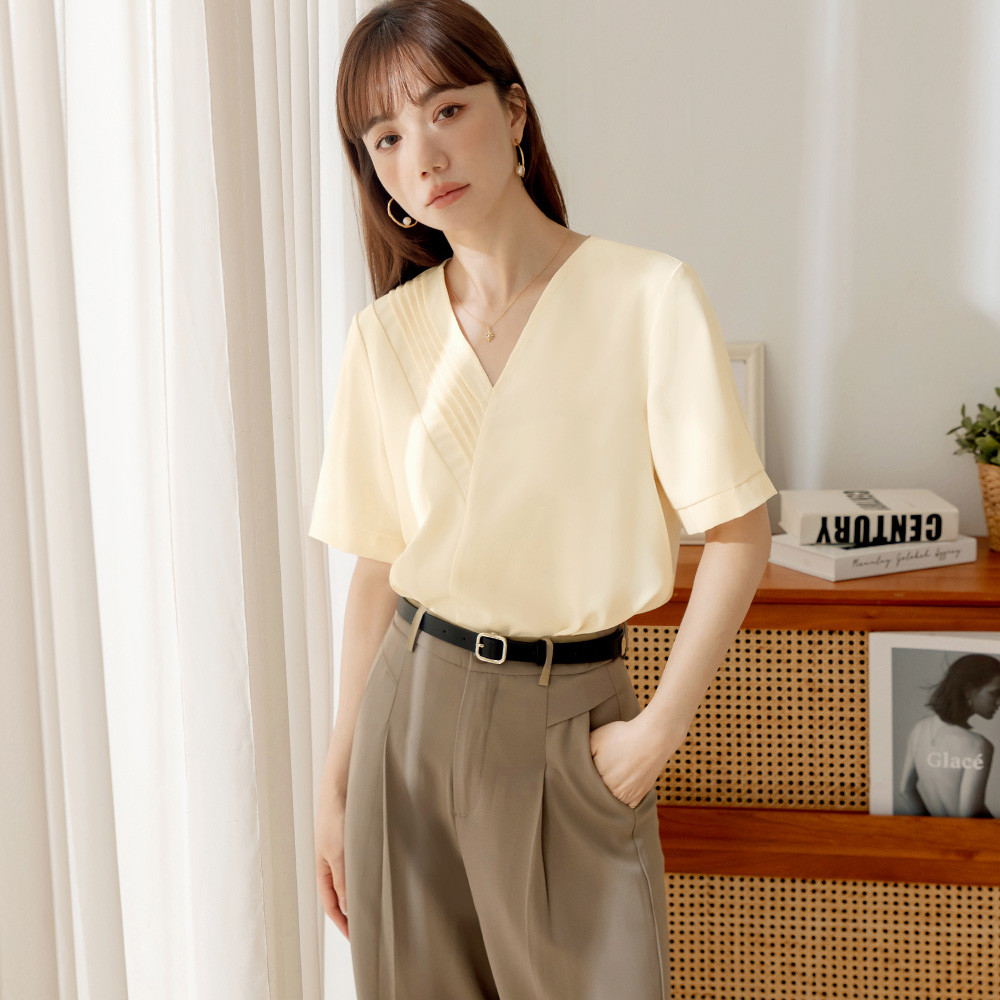 OB嚴選 不易皺V領打褶造型短袖上衣 《AB20357》奶油黃,S|奶油黃,M|奶油黃,L|奶油黃,XL|奶油黃,2L|奶油黃,3L|粉紅,S|粉紅,M|粉紅,L|粉紅,XL|粉紅,2L|粉紅,3LT-shirtsOB嚴選官方旗艦店