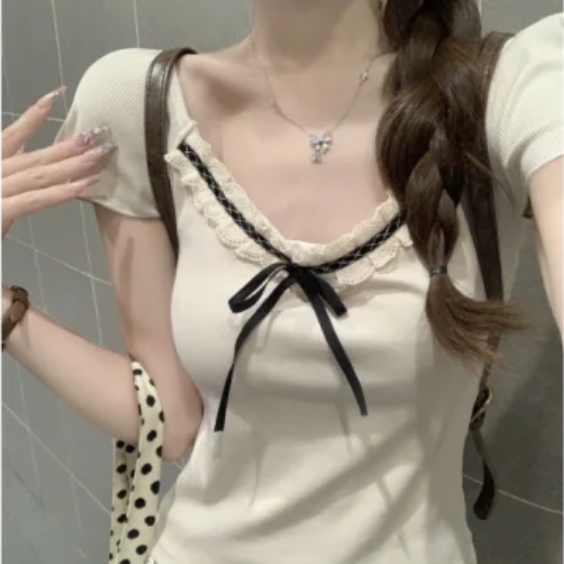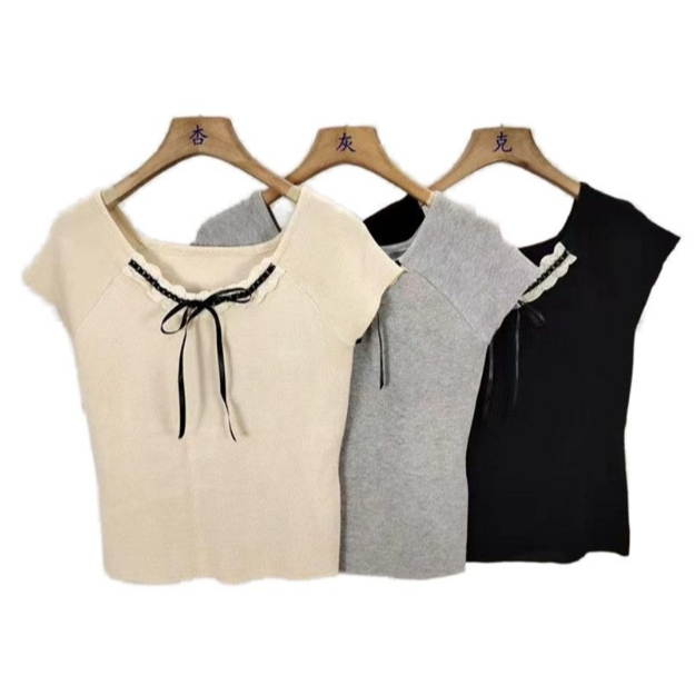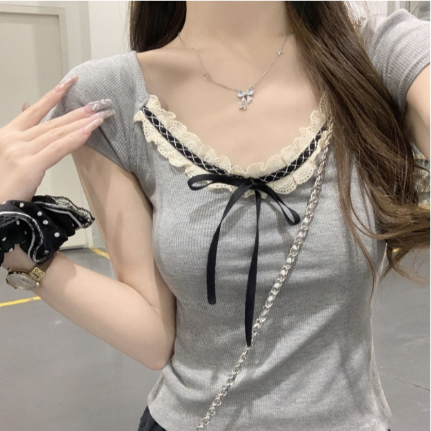【ohi】法式減齡蕾絲拼接短袖T恤 短款方領正肩上衣 女生上衣 針織上衣 女裝 顯瘦上衣 韓版上衣 GWH2243黑色,F碼(均碼40-55KG可穿)|灰色,F碼(均碼40-55KG可穿)|杏色,F碼(均碼40-55KG可穿)T-shirtsOHI衣著