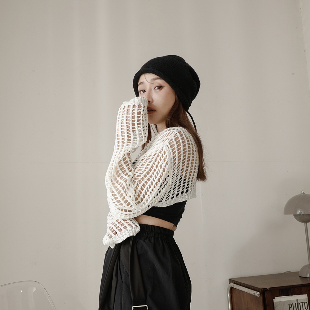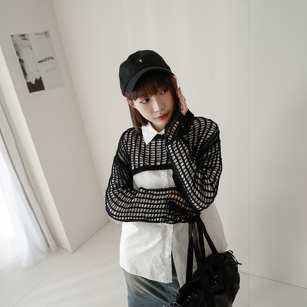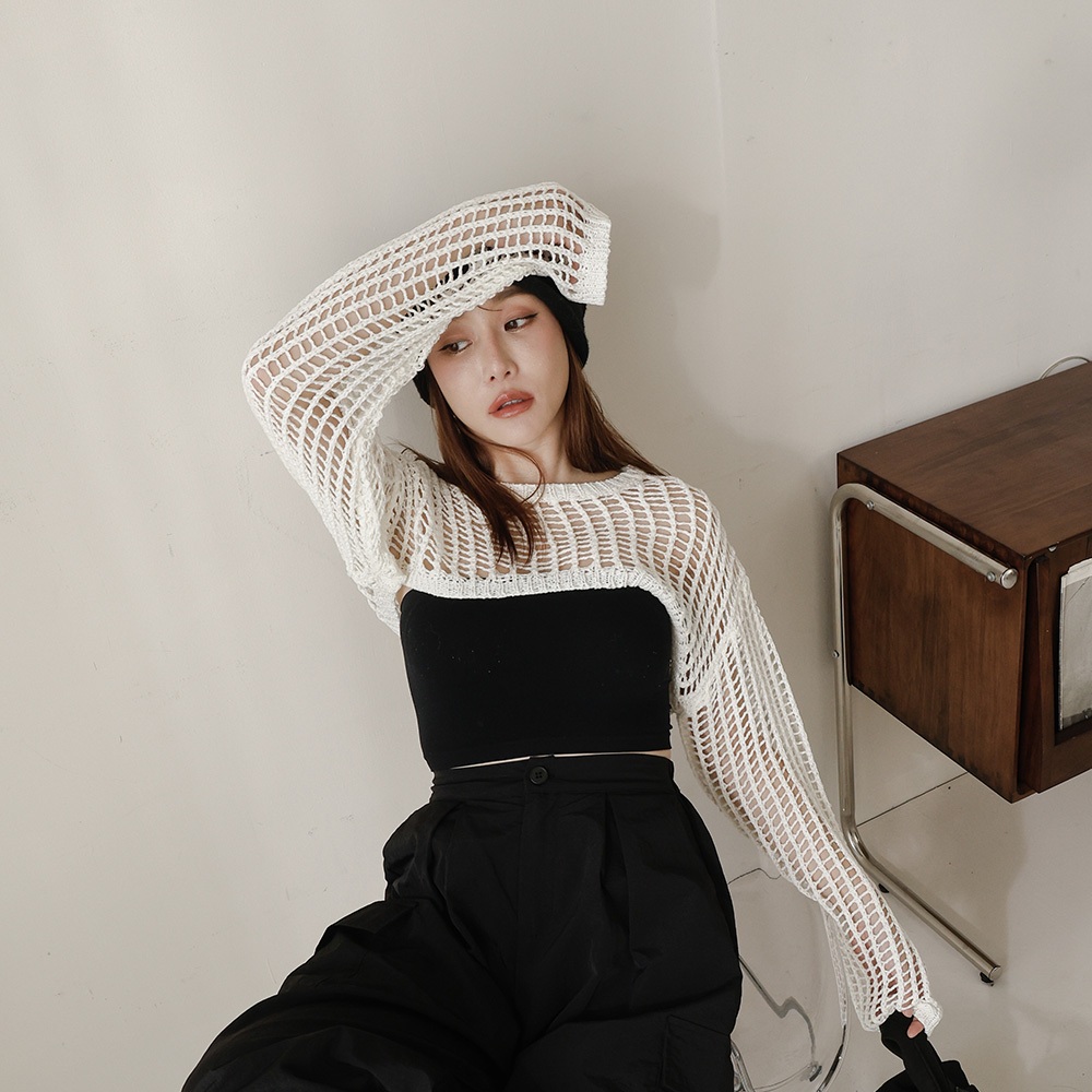 QUEENSHOP_ S 女裝 長袖 洞洞鏤空針織短版罩衫上衣 兩色售 現+預 【01013429】黑|米白QUEENSHOP