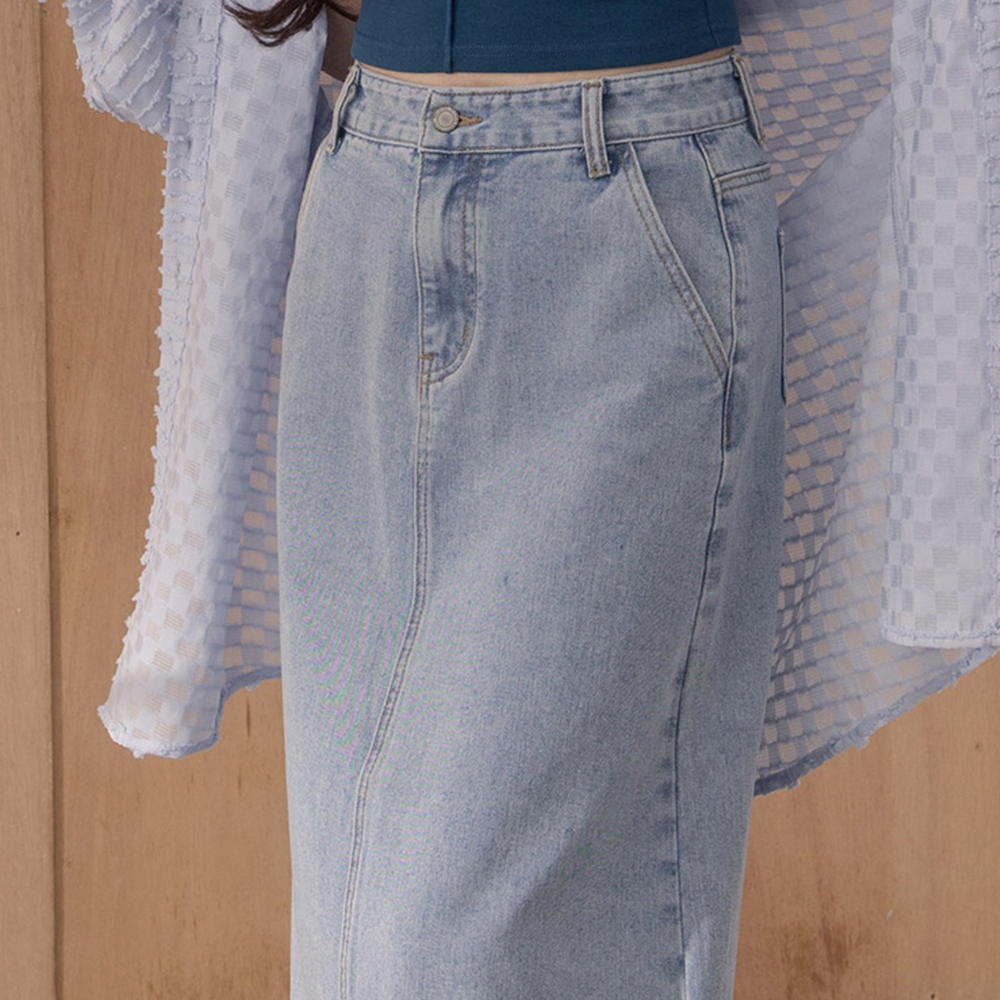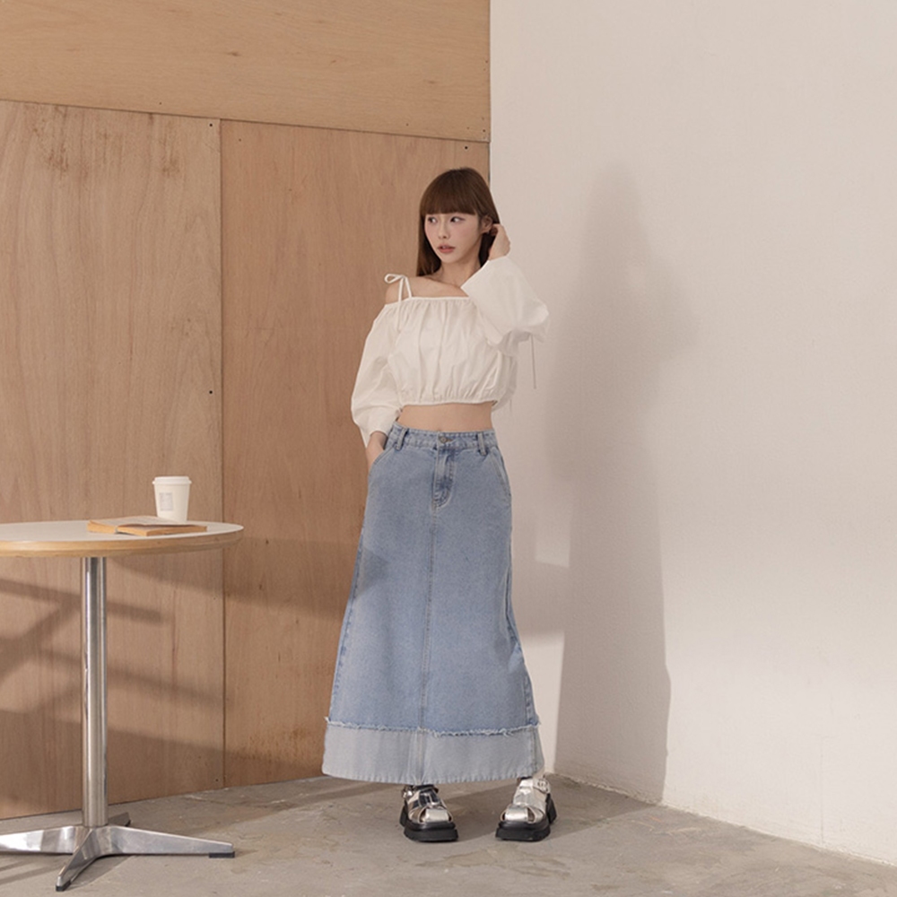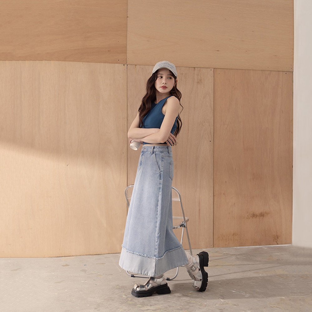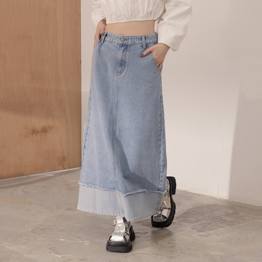 QUEENSHOP_ S 女裝 下擺反折剪接鬚邊牛仔裙 S/M/L 現+預 【03021600】S|M|LQUEENSHOP