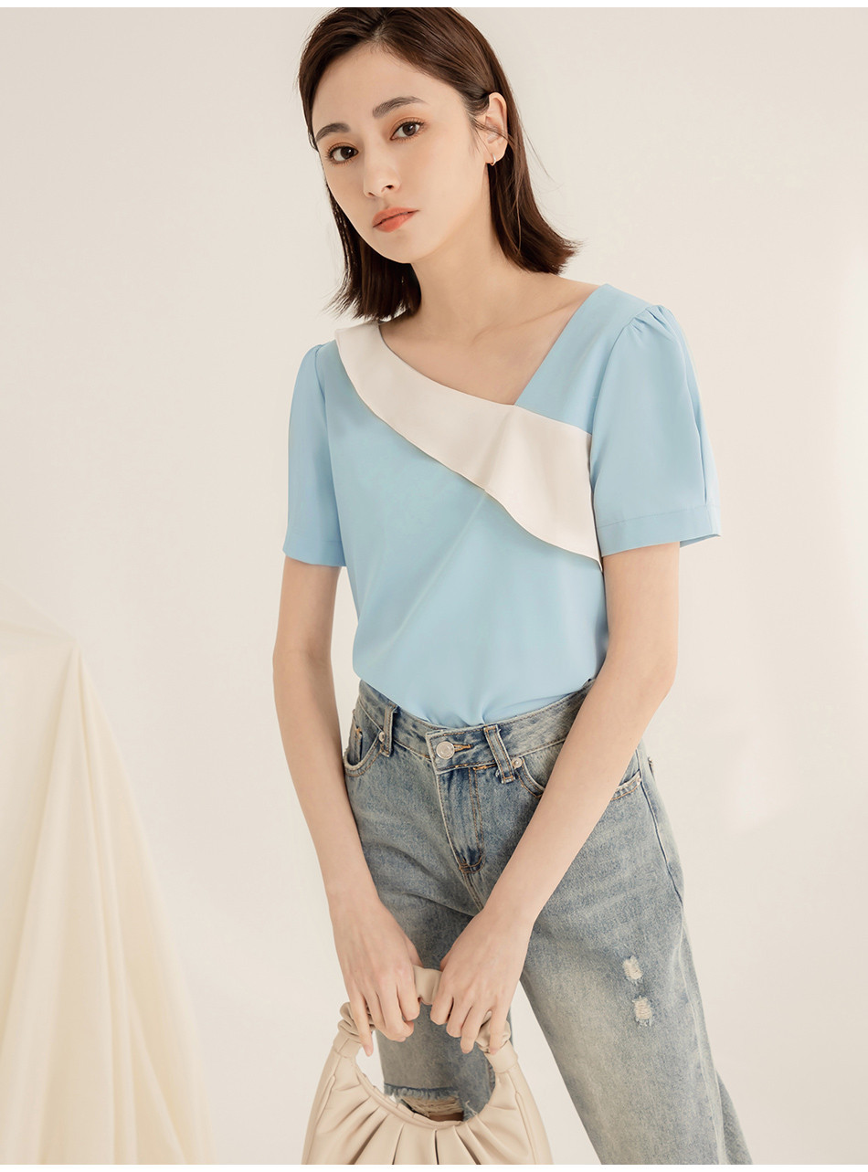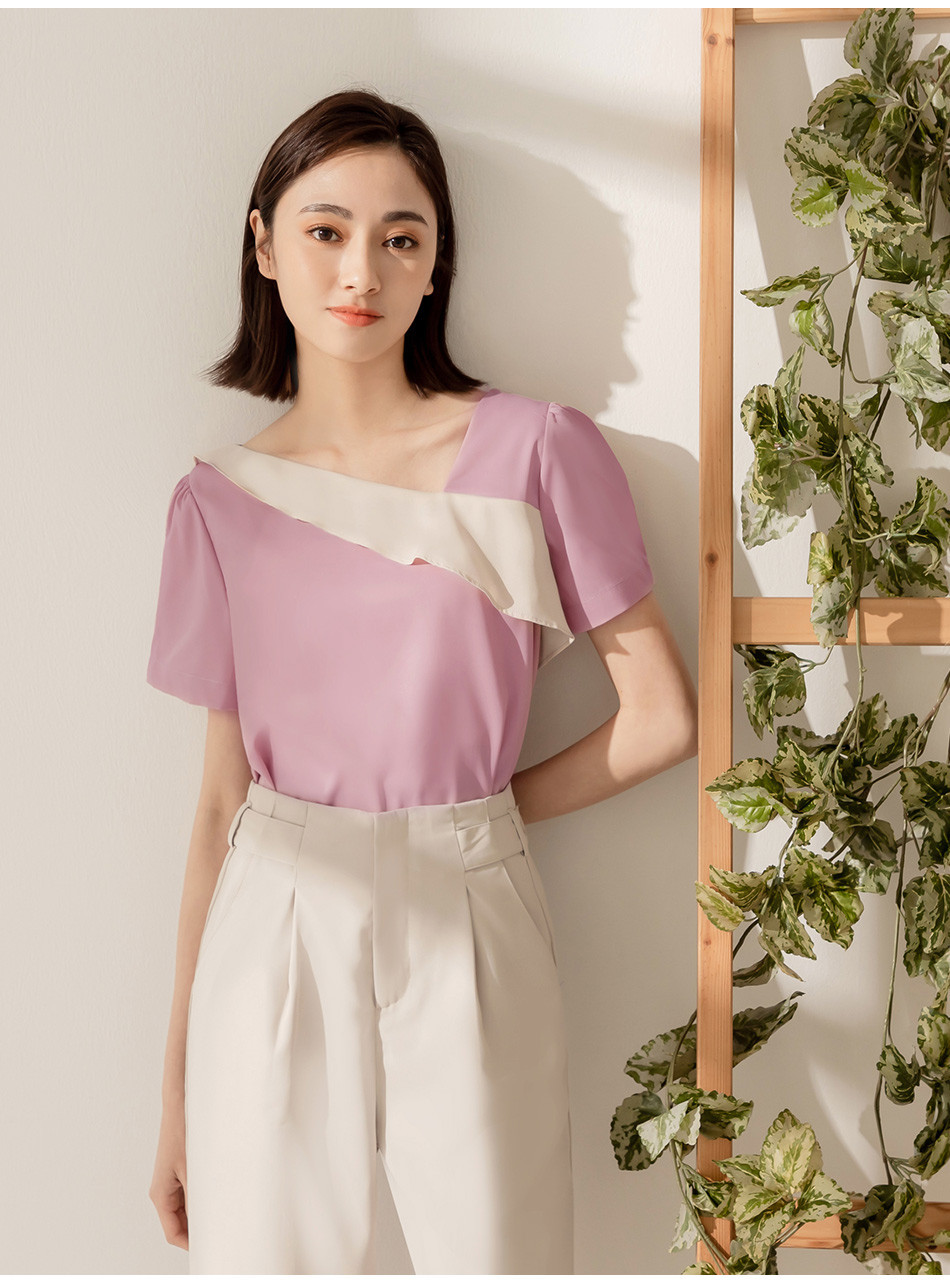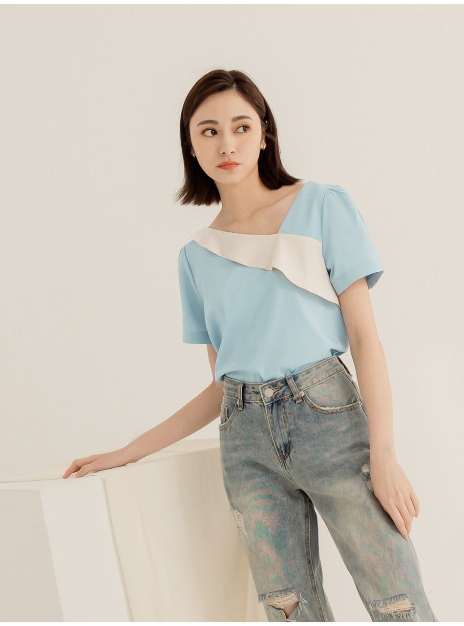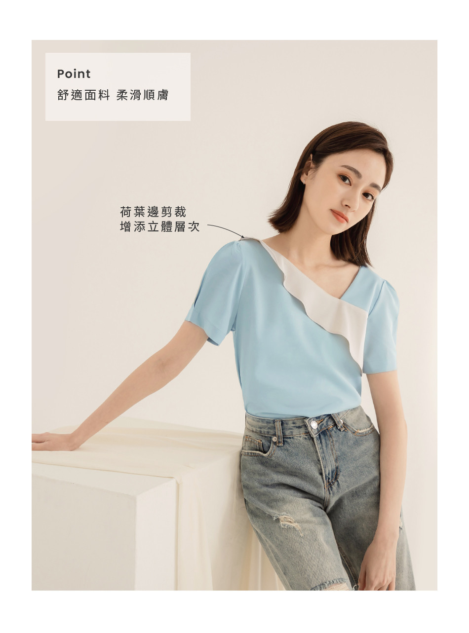 OB嚴選 撞色荷葉領短袖上衣 《AB18455》大尺碼/現貨/女裝淺丹寧藍,S|淺丹寧藍,M|淺丹寧藍,L|淺丹寧藍,XL|淺丹寧藍,2L|淺丹寧藍,3L|霧粉,S|霧粉,M|霧粉,L|霧粉,XL|霧粉,2L|霧粉,3LT-shirtsOB嚴選官方旗艦店