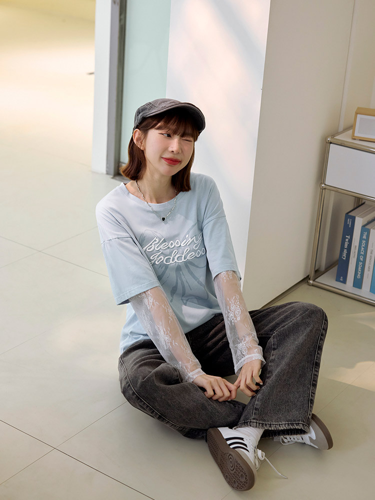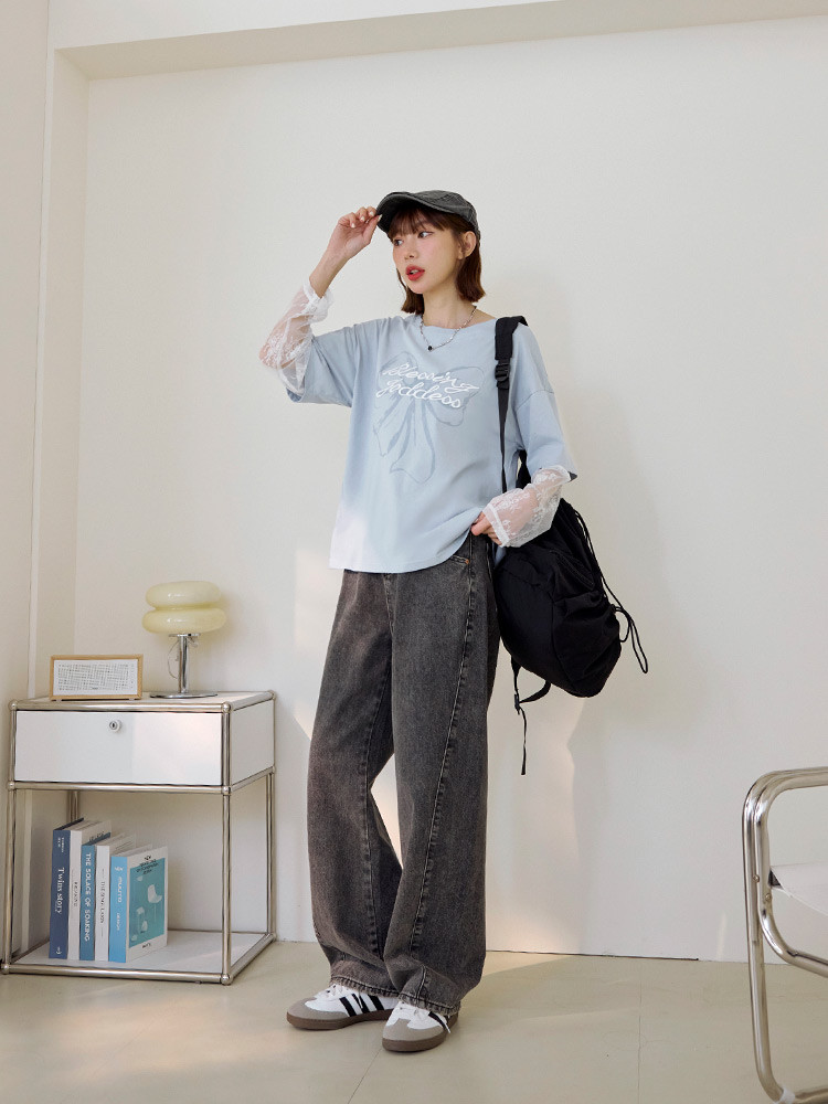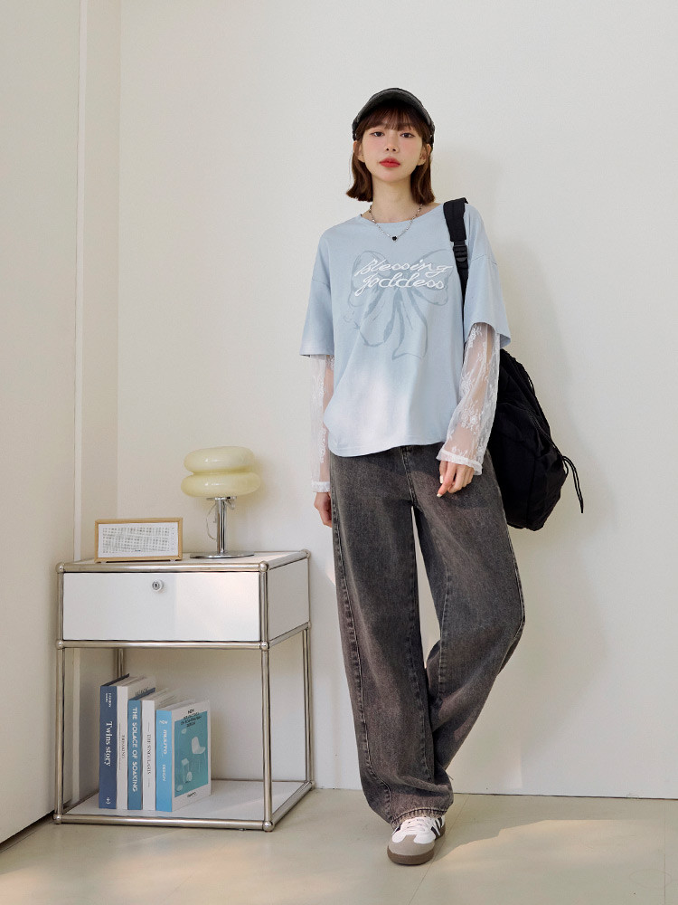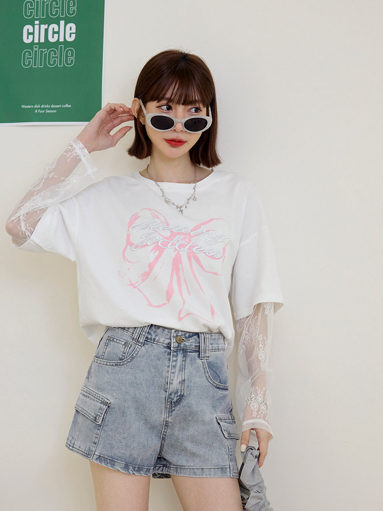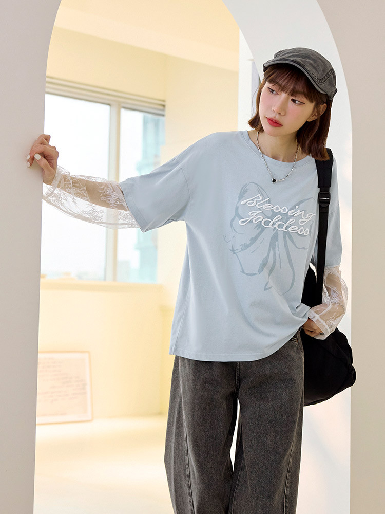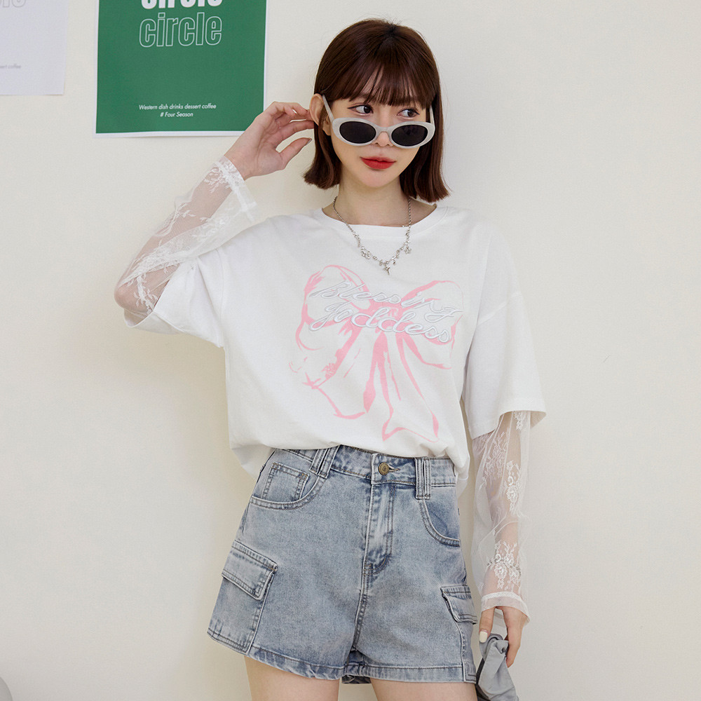 OB嚴選 純棉假兩件蝴蝶結蕾絲拼接短袖上衣 《AB20240》白,3L|灰藍,M|灰藍,L|灰藍,XL|灰藍,2L|灰藍,3L|白,M|白,L|白,XL|白,2LT-shirtsOB嚴選官方旗艦店
