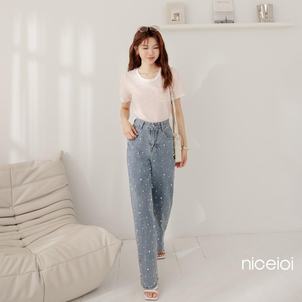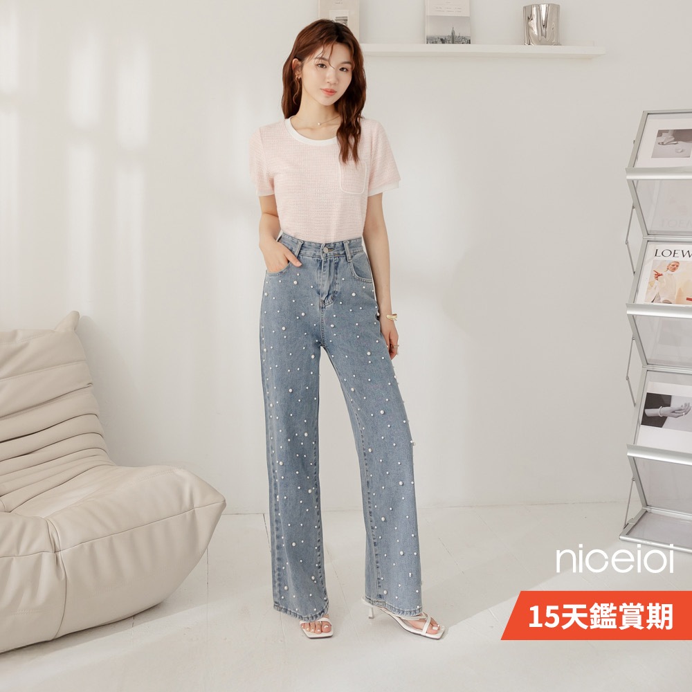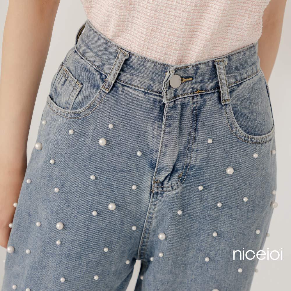 niceioi【特惠】珍珠牛仔褲 女生牛仔褲 高腰牛仔褲 藍色 [純粹珍珠水洗高腰直筒牛仔長褲] 女裝珍珠牛仔褲-藍,S|珍珠牛仔褲-藍,Mniceioi 官方旗艦店