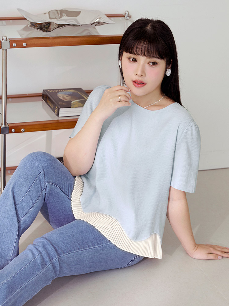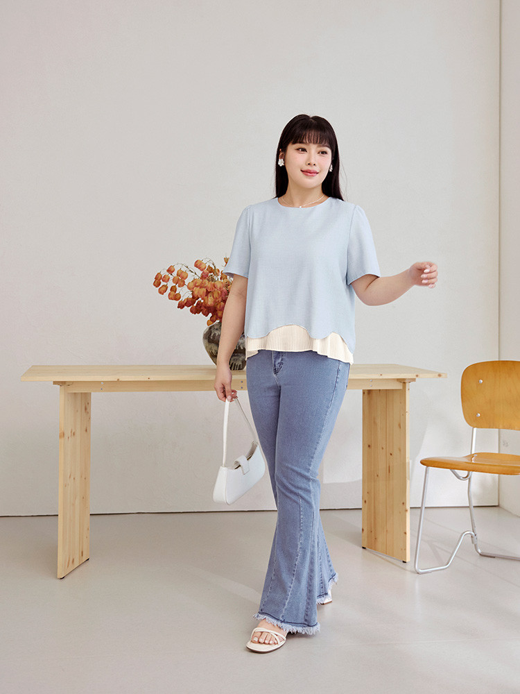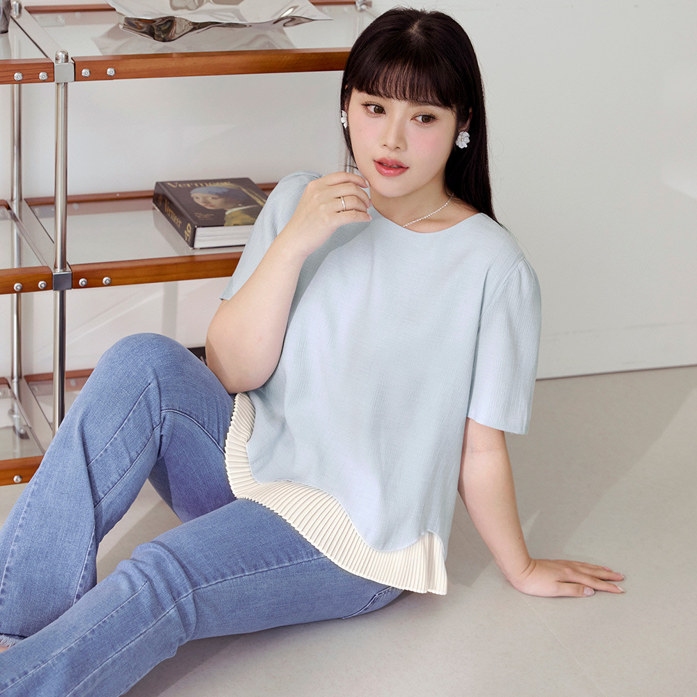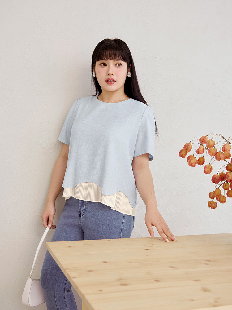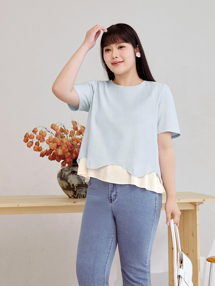 OB嚴選 雲朵自訂款-直紋百褶拼接寬鬆澎袖上衣 《AB20395》淺水藍,XL|淺水藍,2L|淺水藍,3L|淺水藍,4L|深灰藍,XL|深灰藍,2L|深灰藍,3L|深灰藍,4LT-shirtsOB嚴選官方旗艦店