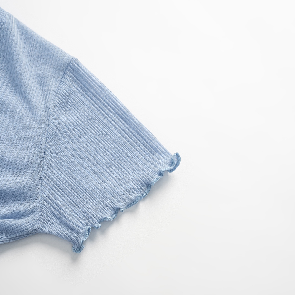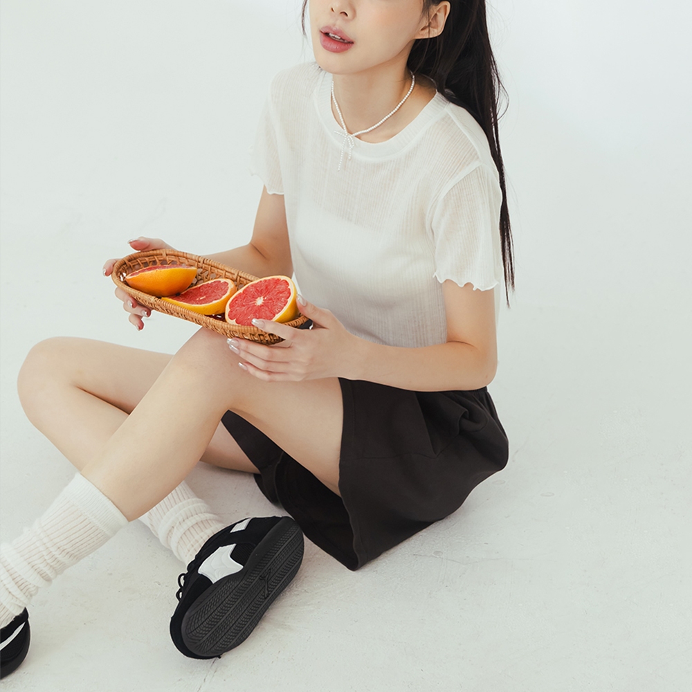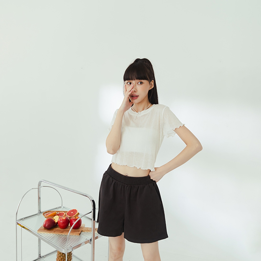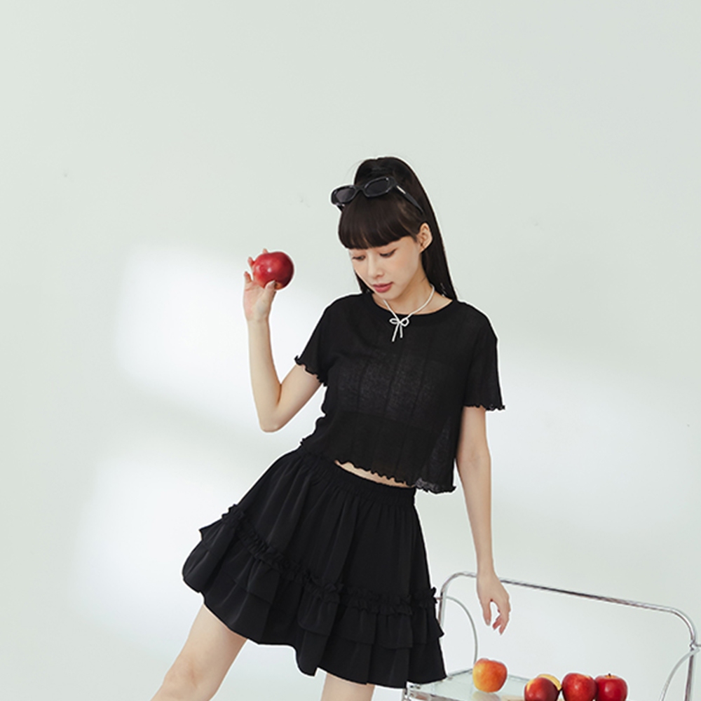 QUEENSHOP_ S 女裝 短袖木耳邊坑條透膚短版上衣 三色售 現+預 【01098797】黑|白|藍T-shirtsQUEENSHOP