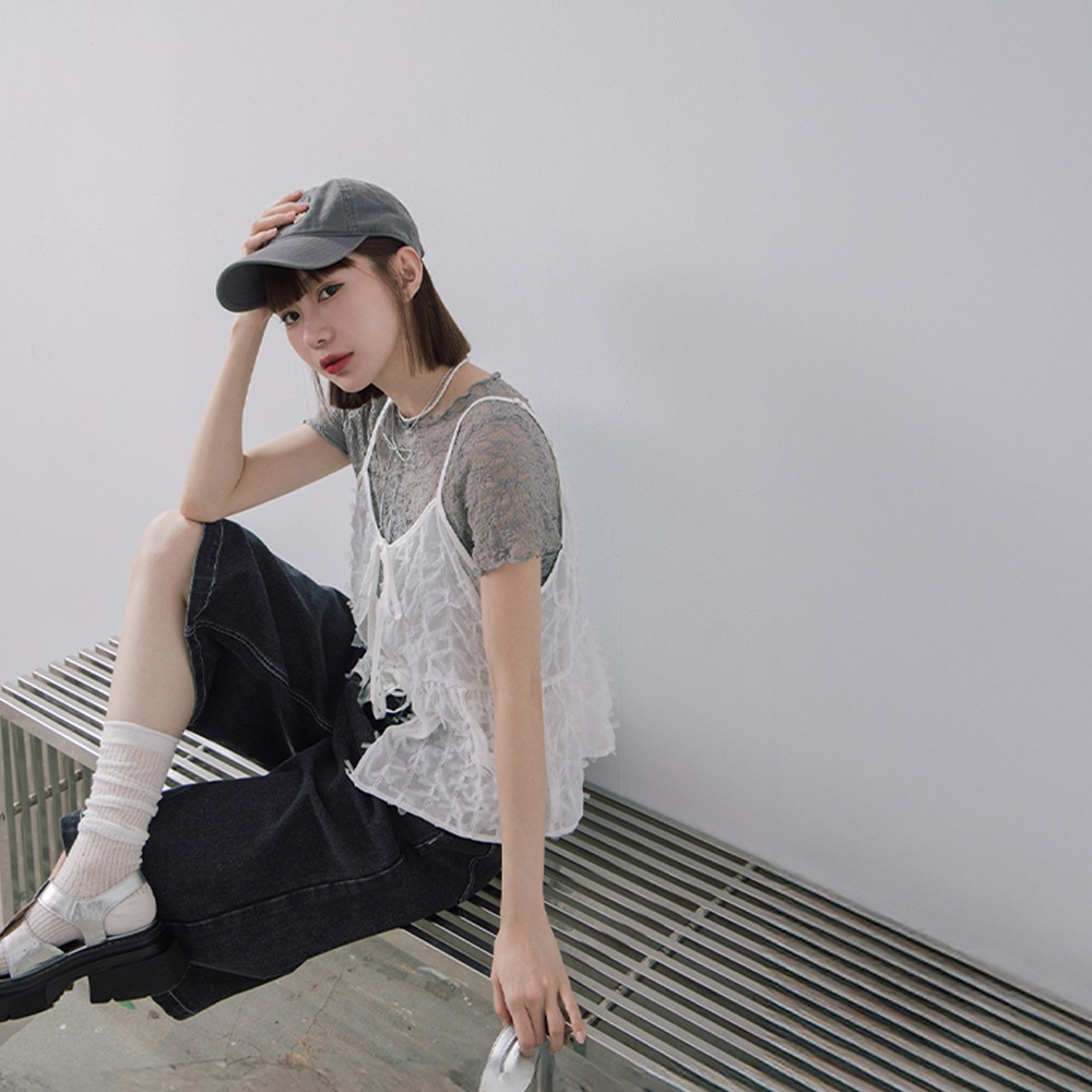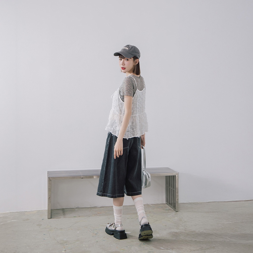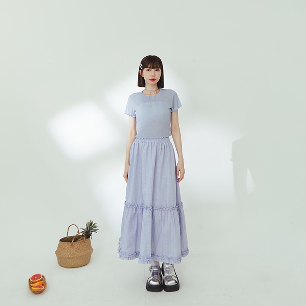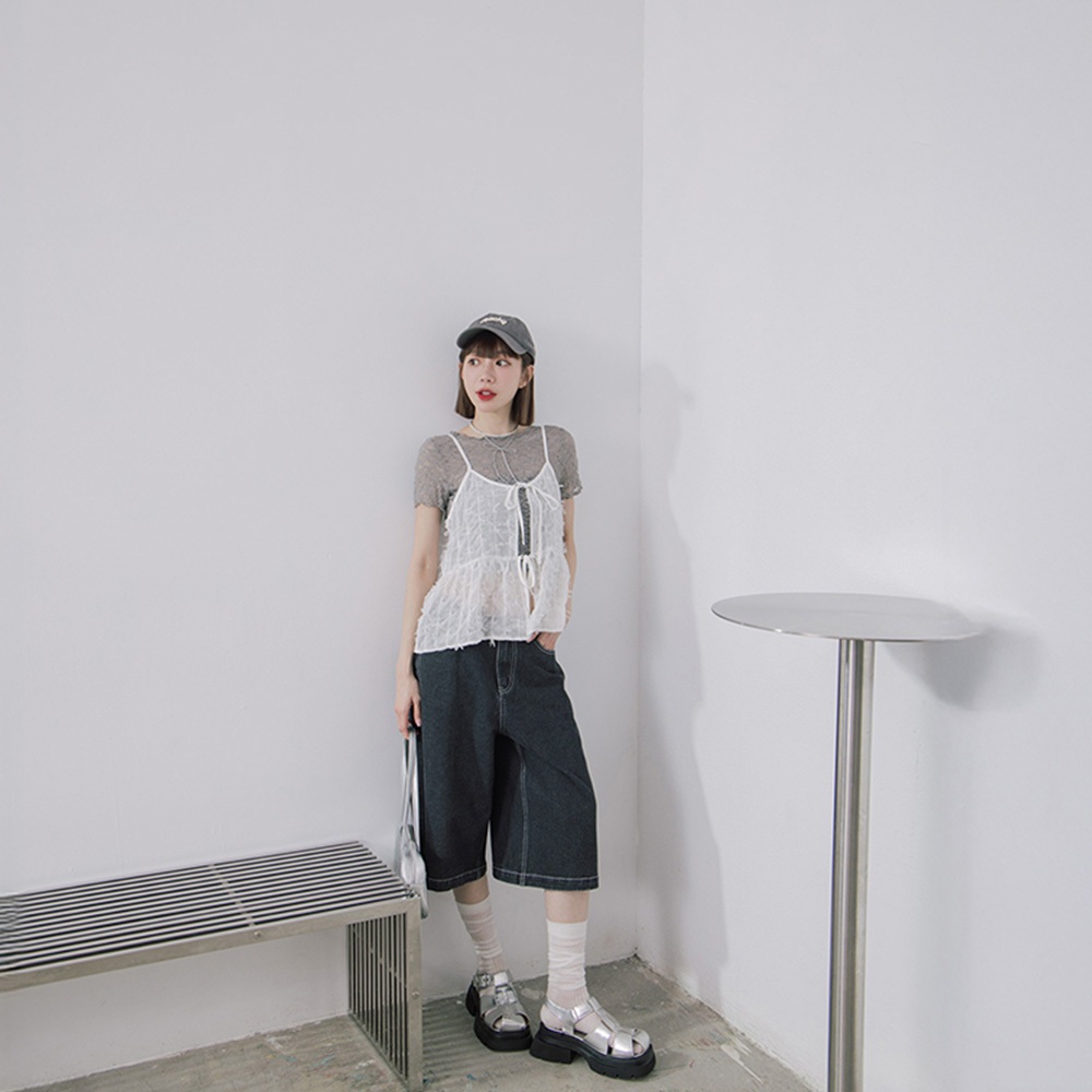 QUEENSHOP_ S 女裝 短袖木耳邊坑條透膚短版上衣 三色售 現+預 【01098797】黑|白|藍T-shirtsQUEENSHOP