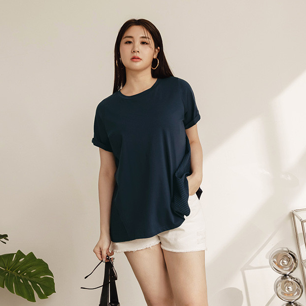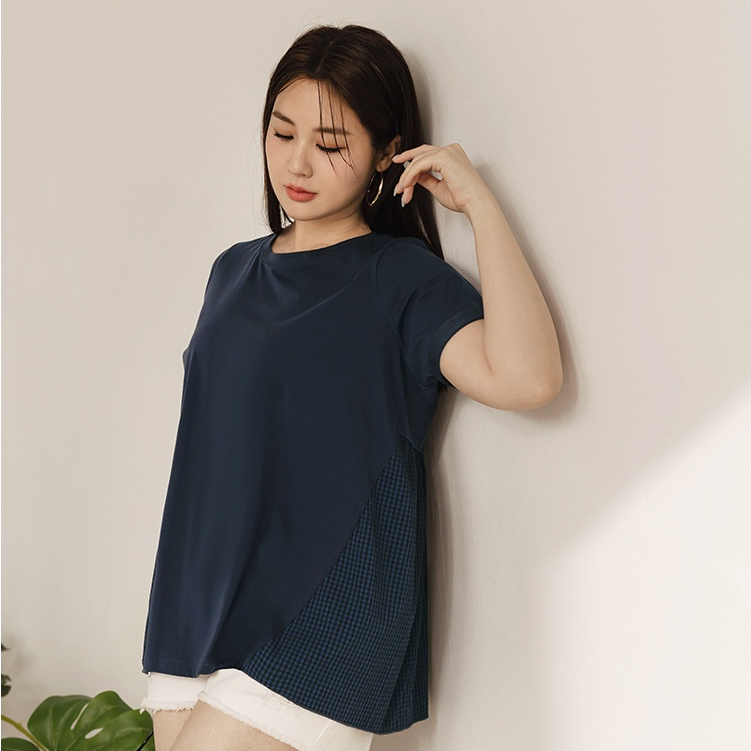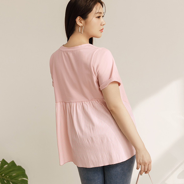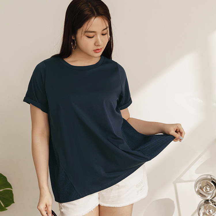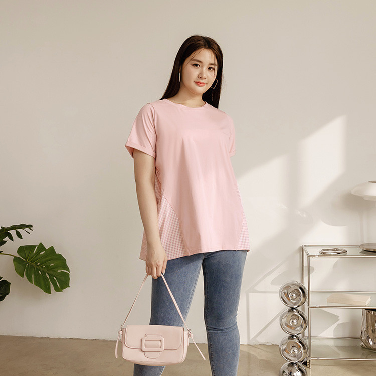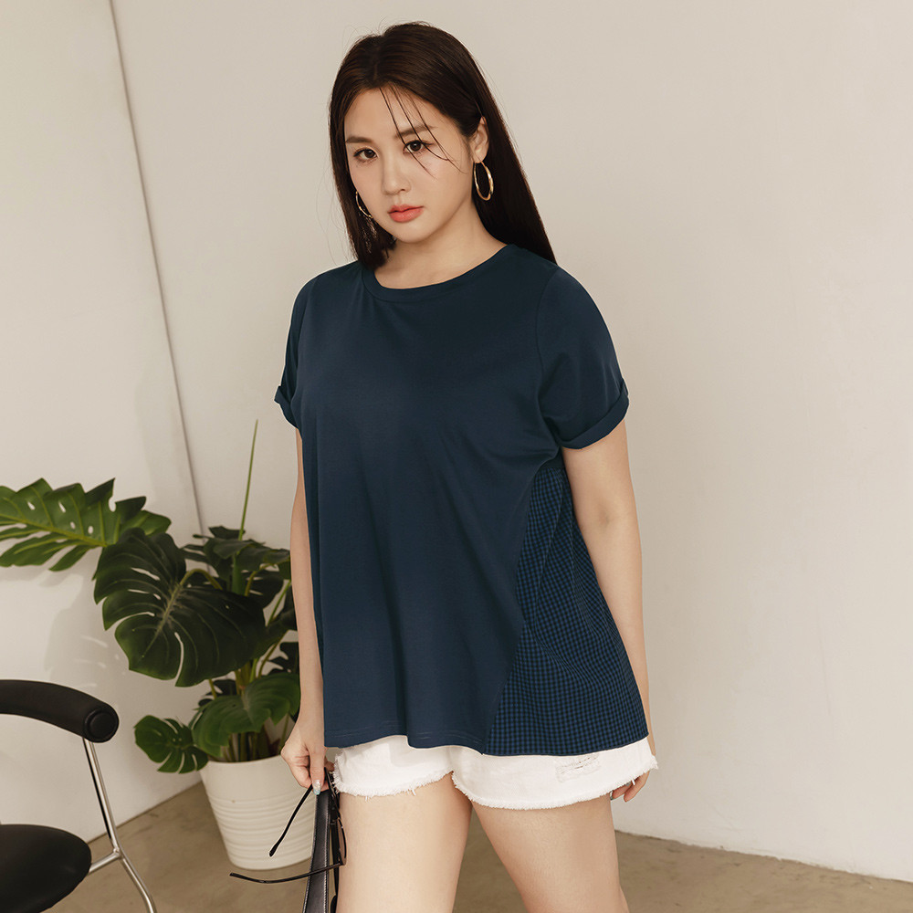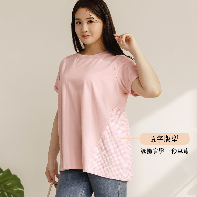 OB嚴選 雲朵自訂款-格紋拼接反折袖A字T恤上衣 《AB19517》大尺碼/女裝/現貨深藍,XL|深藍,2L|深藍,3L|粉紅,XL|粉紅,2L|粉紅,3LT-shirtsOB嚴選官方旗艦店