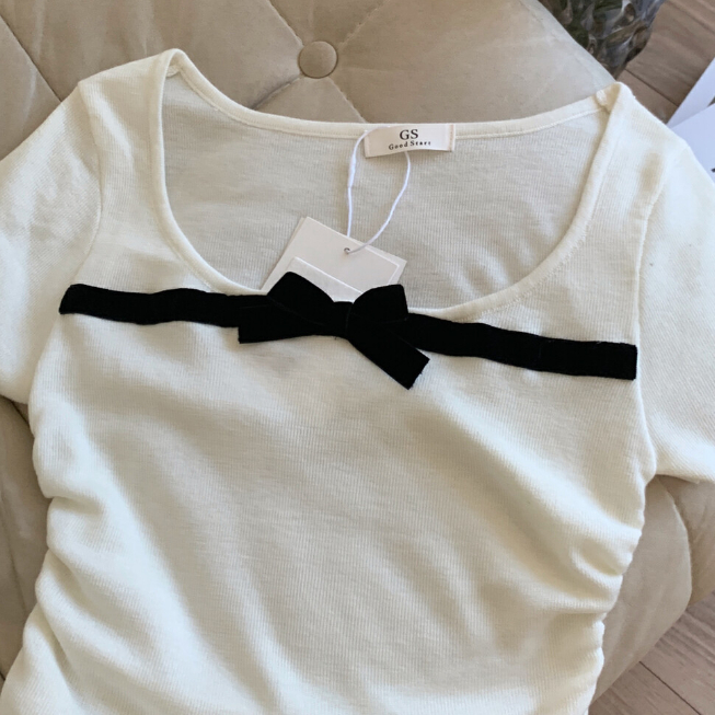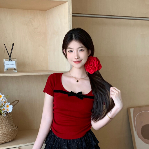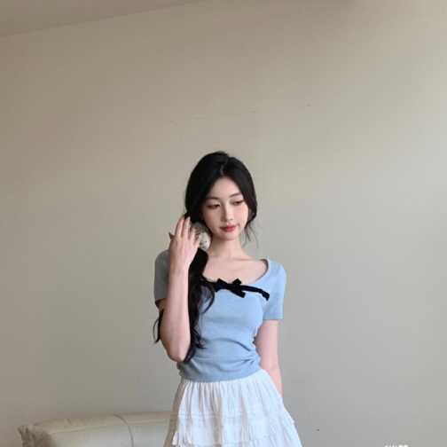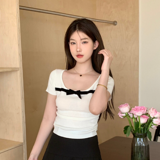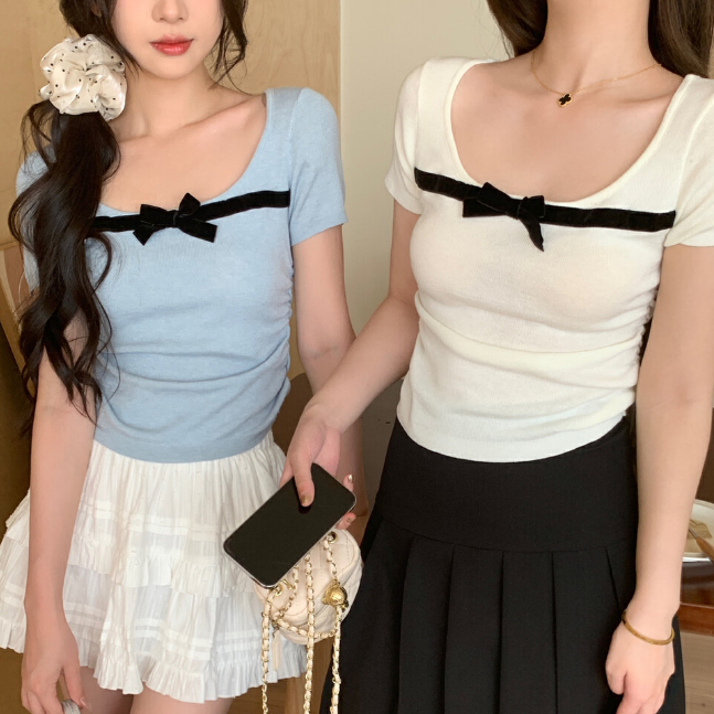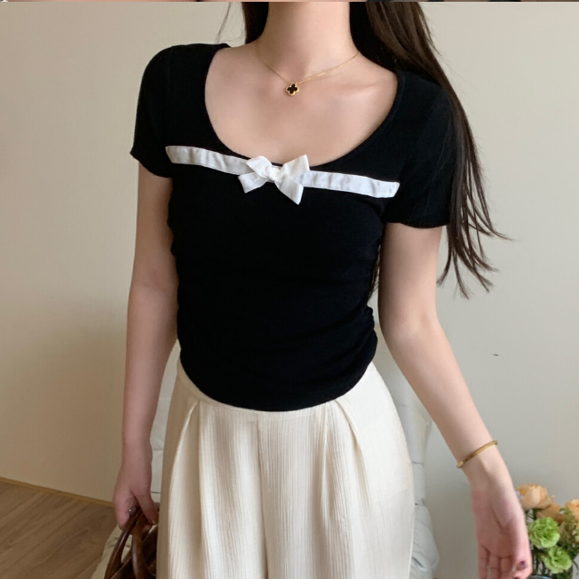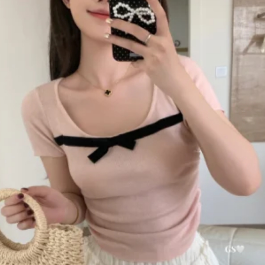 【ohi】撞色拼色蝴蝶結方領短袖上衣 少女感修身顯瘦 短袖針織衫上衣 夏天衣服 女裝 GWH6484黑色,均碼-65KG以內都可穿|紅色,均碼-65KG以內都可穿|藍色,均碼-65KG以內都可穿|杏色,均碼-65KG以內都可穿|粉色,均碼-65KG以內都可穿OHI衣著