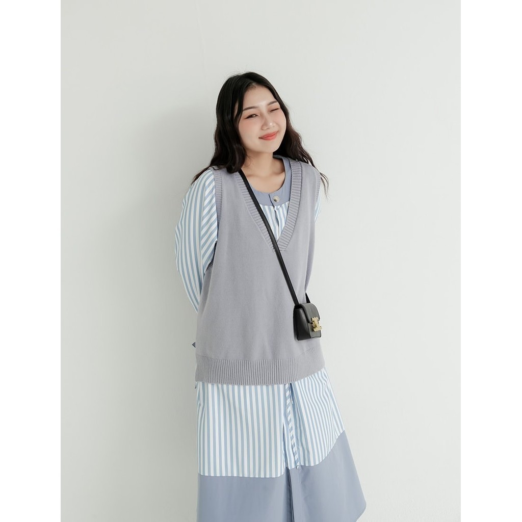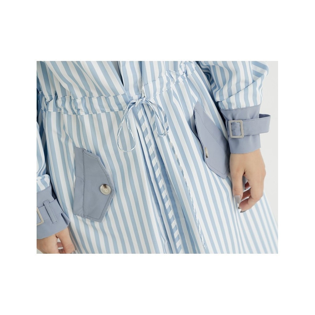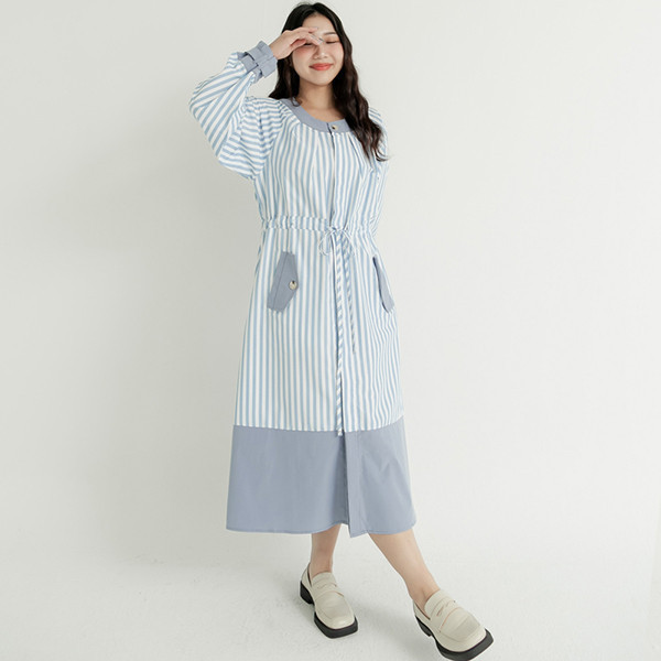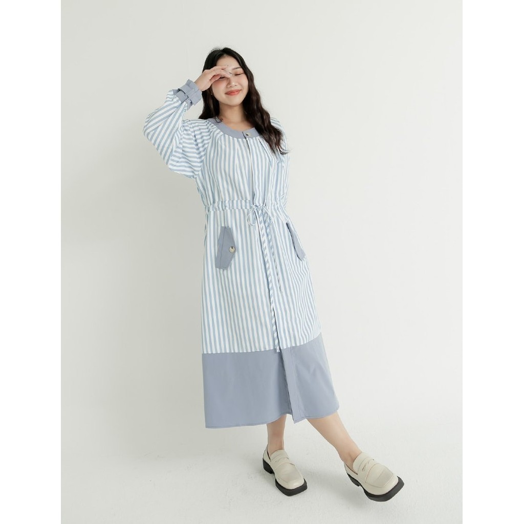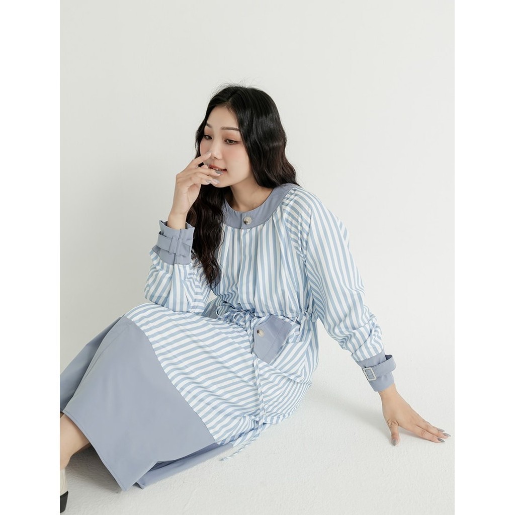 【PolyLulu】 清新波妞圓領直條紋綁帶長袖洋裝 中大尺碼洋裝 藍色L|XL|2XL|3XLPOLY LULU丨BEAUTY HAS NO SIZE 中大尺碼女裝