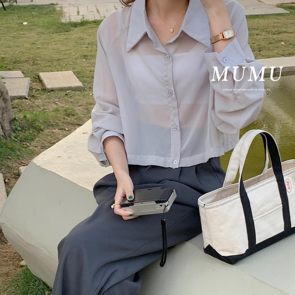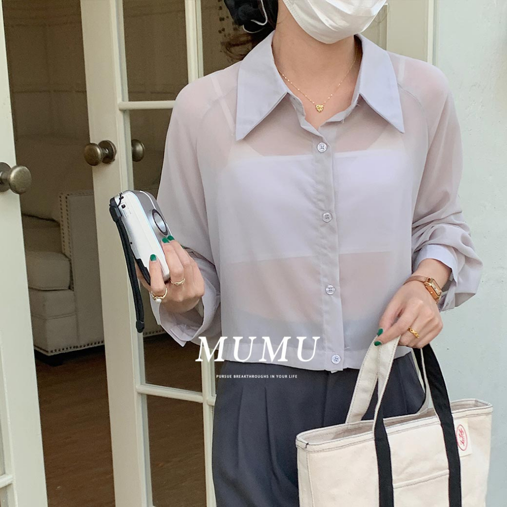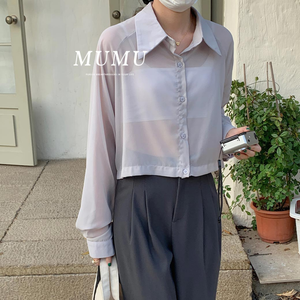 MUMU |【T94201】TGY現貨 微性感 短版雪紡透膚襯衫 短版襯衫 透膚上衣 薄長袖 女裝 襯衫藍,F|藕粉,F|灰,F|杏,F|深灰,F|綠,FShirts & BlousesMUMUSHOP 韓系女裝批發價 全站實拍