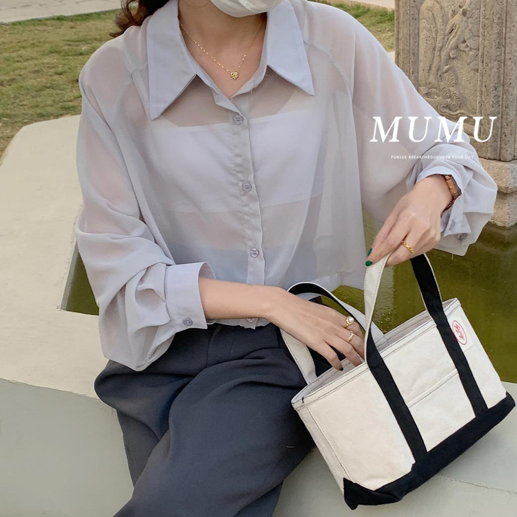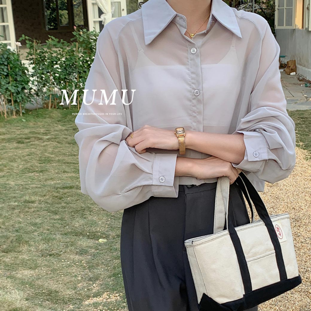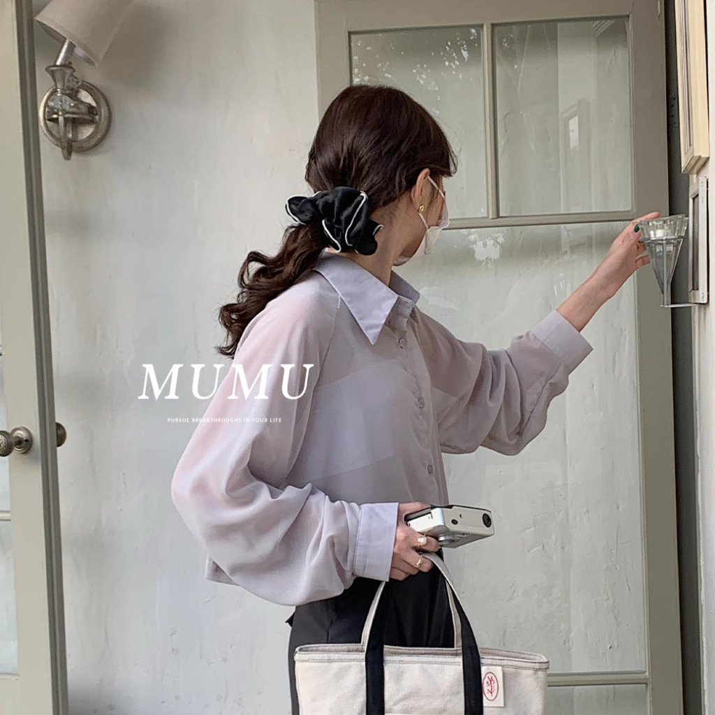 MUMU |【T94201】TGY現貨 微性感 短版雪紡透膚襯衫 短版襯衫 透膚上衣 薄長袖 女裝 襯衫藍,F|藕粉,F|灰,F|杏,F|深灰,F|綠,FShirts & BlousesMUMUSHOP 韓系女裝批發價 全站實拍