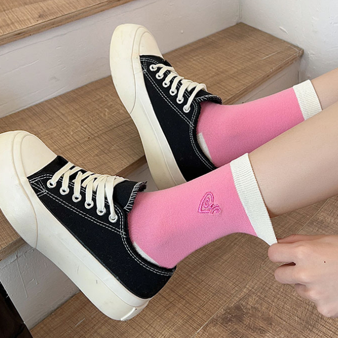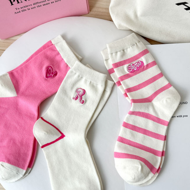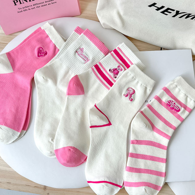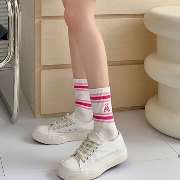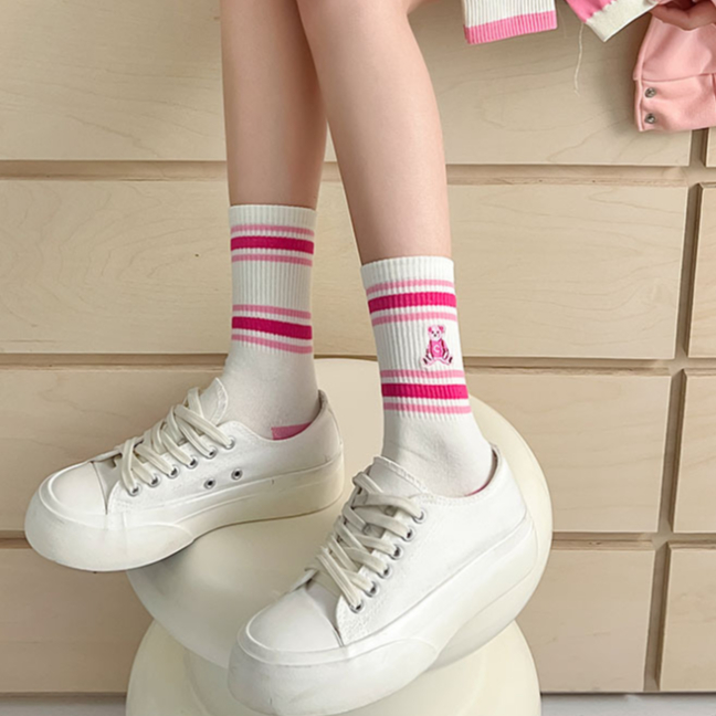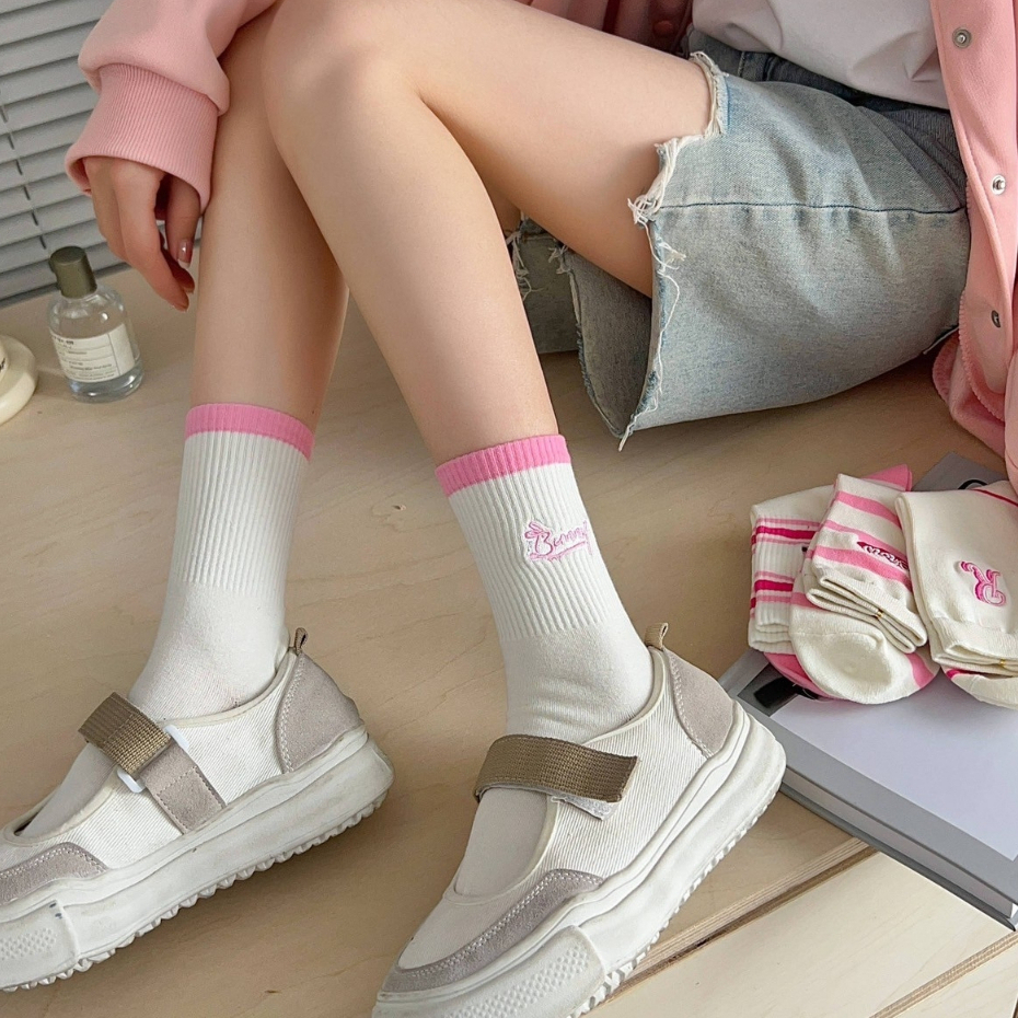 【ohi】現貨 新品 甜美 粉色系 小熊 英文刺繡 棉襪 長襪 中筒襪 學院風 女襪 襪子ZG143條紋-英文|白底-BUNNY|小熊熊|粉底色|白底-粉RSocksOHI衣著