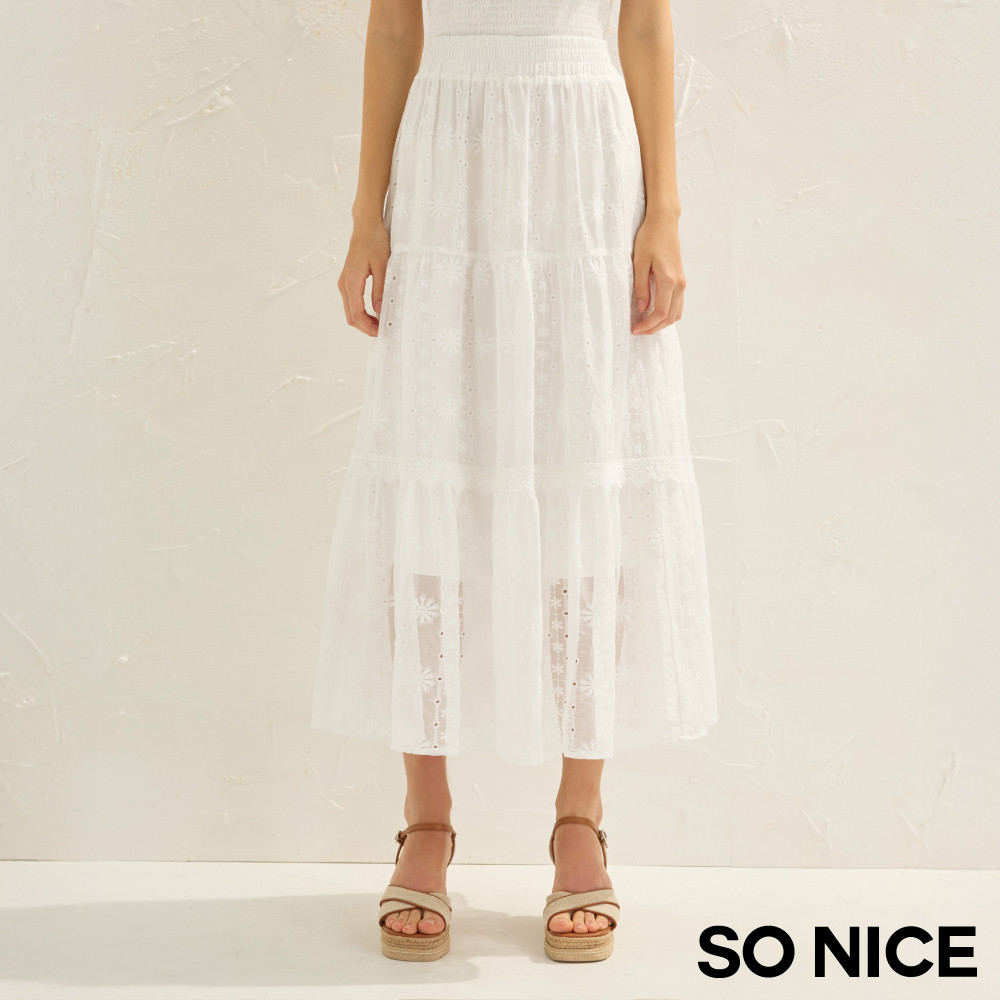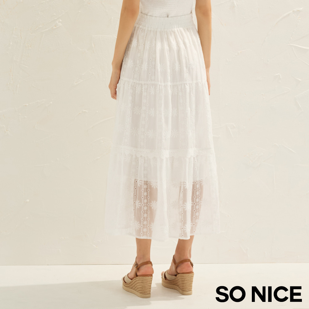 SO NICE 法式繡花蕾絲彈力腰頭蛋糕長裙|都會時尚女裝【75543002】白,40(L)|白,34(XS)|白,36(S)|白,38(M)SO NICE 官方旗艦店