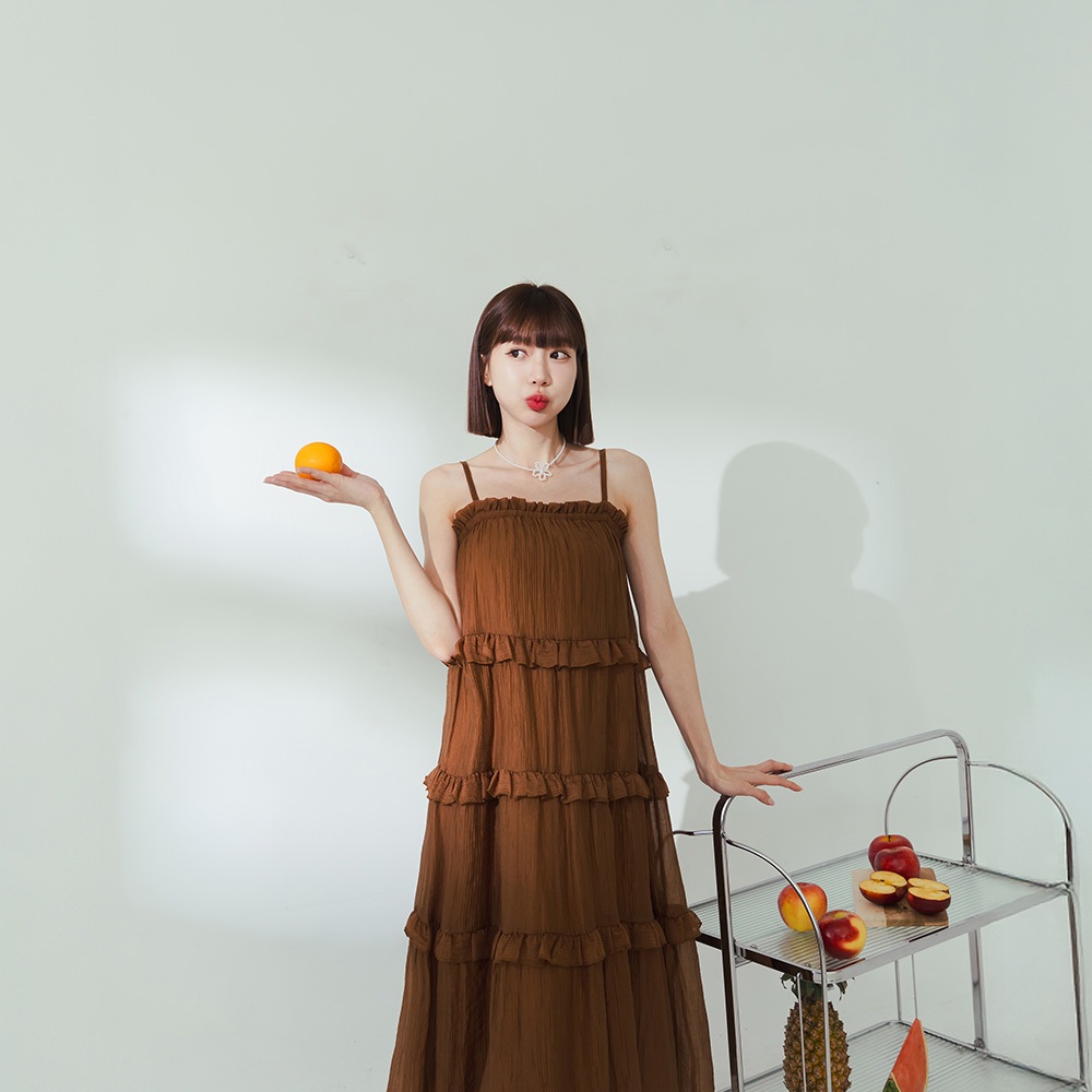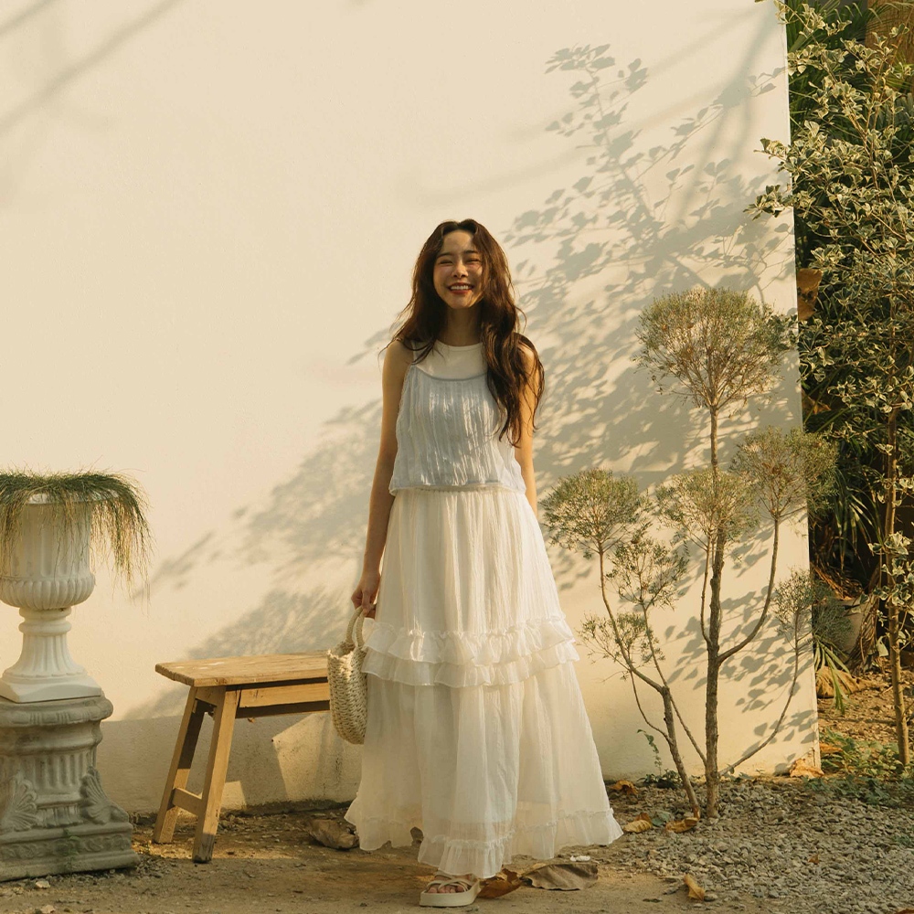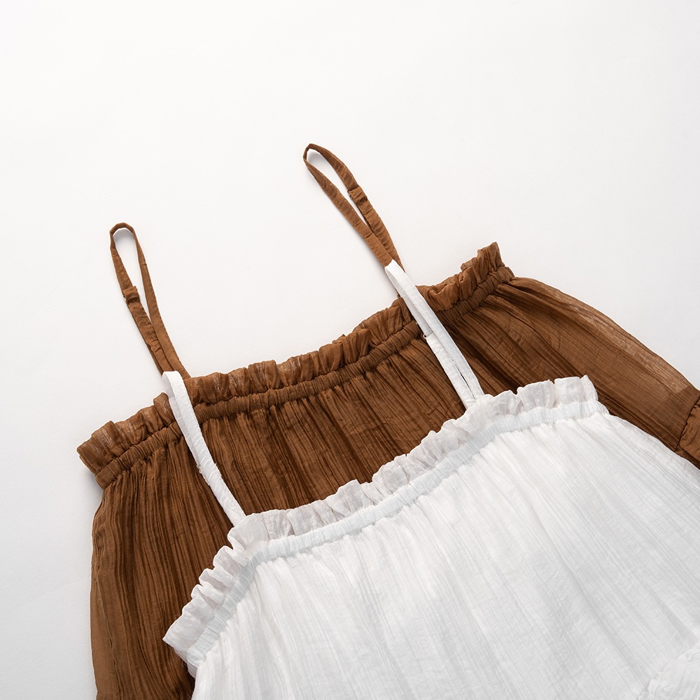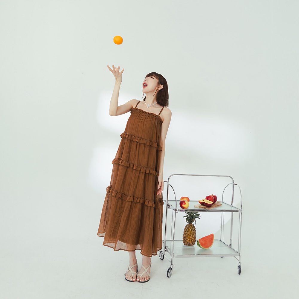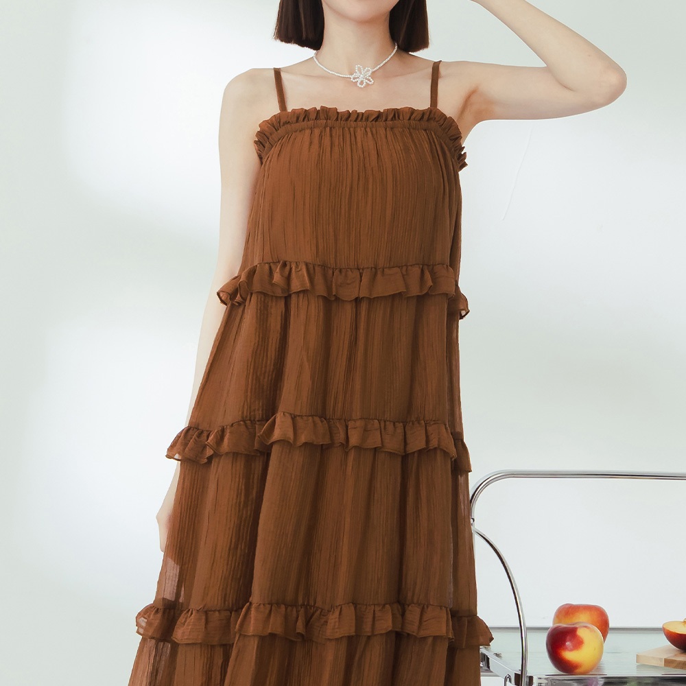 QUEENSHOP_ S 女裝 荷葉細褶蛋糕傘擺細肩長洋裝 兩色售 現+預 【01087097】白|咖啡QUEENSHOP
