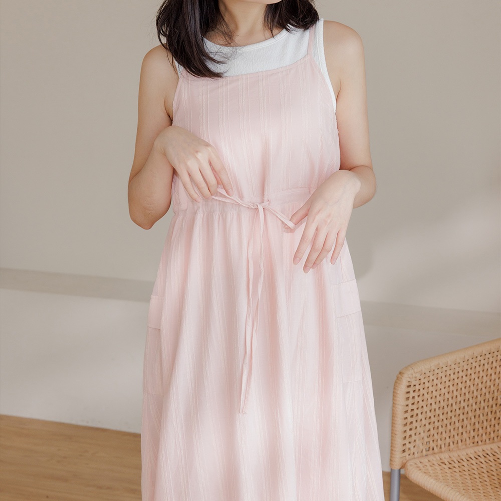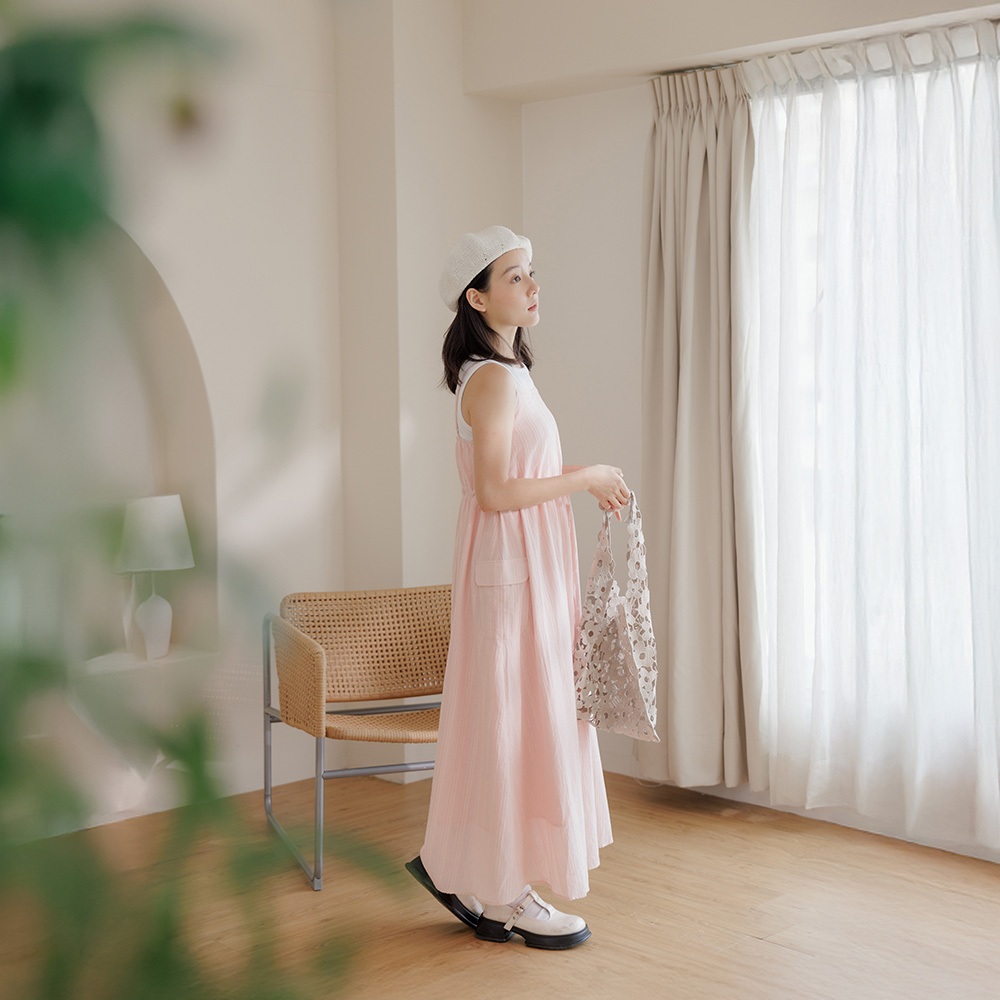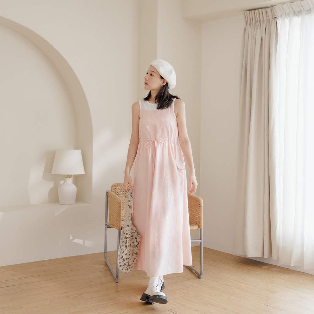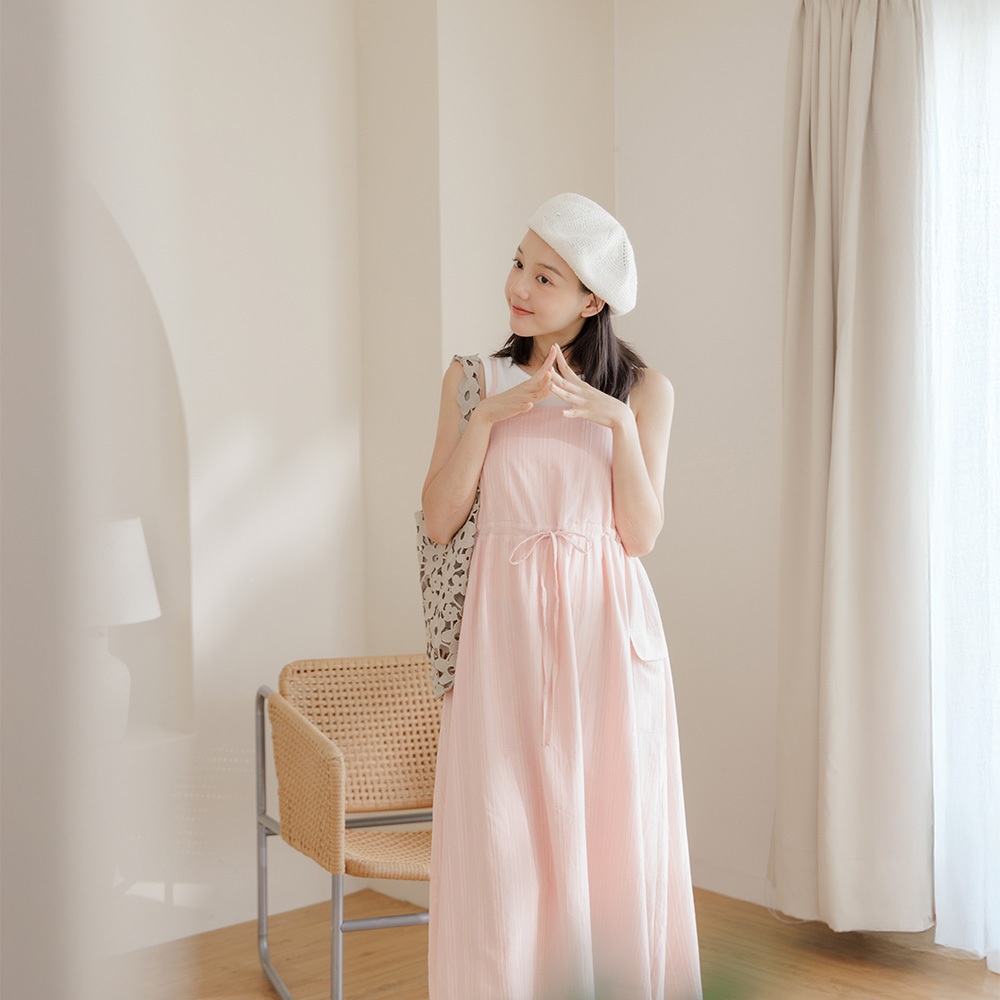 QUEENSHOP_ S 女裝 直紋紋理大口袋腰抽繩長洋裝 兩色售 現+預 【01087117】粉|杏QUEENSHOP