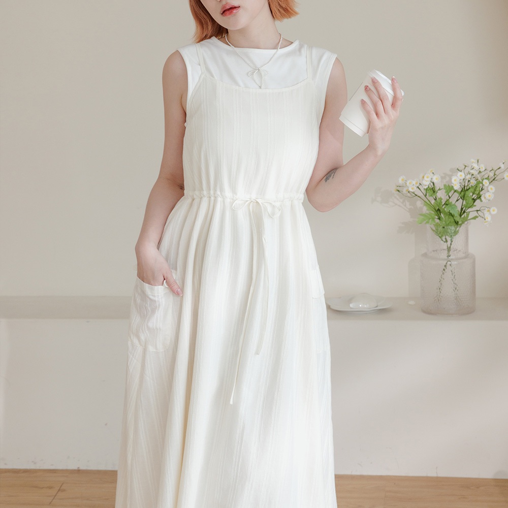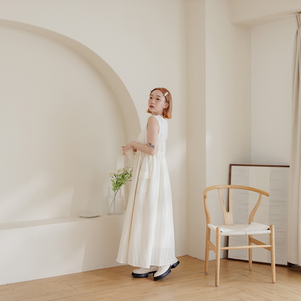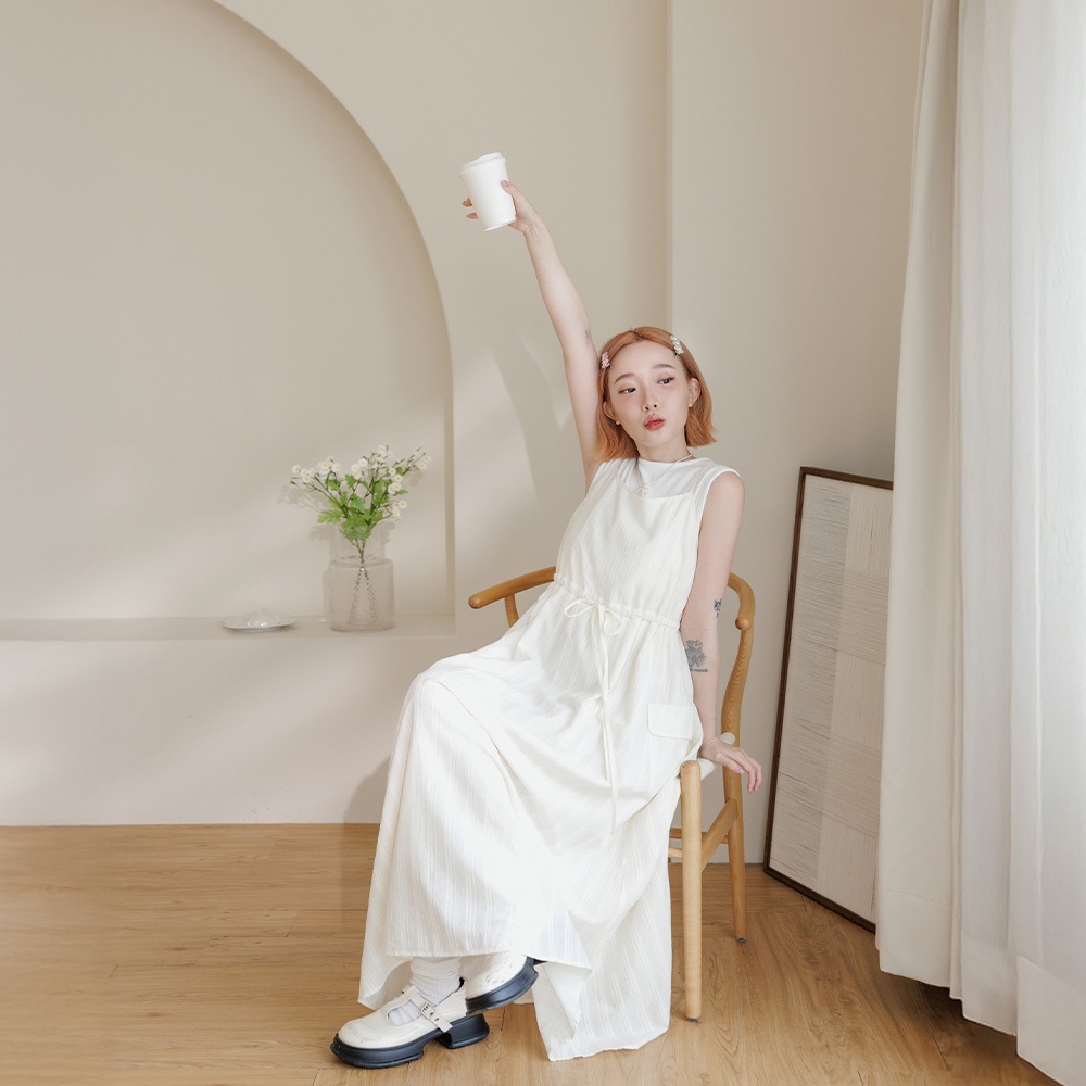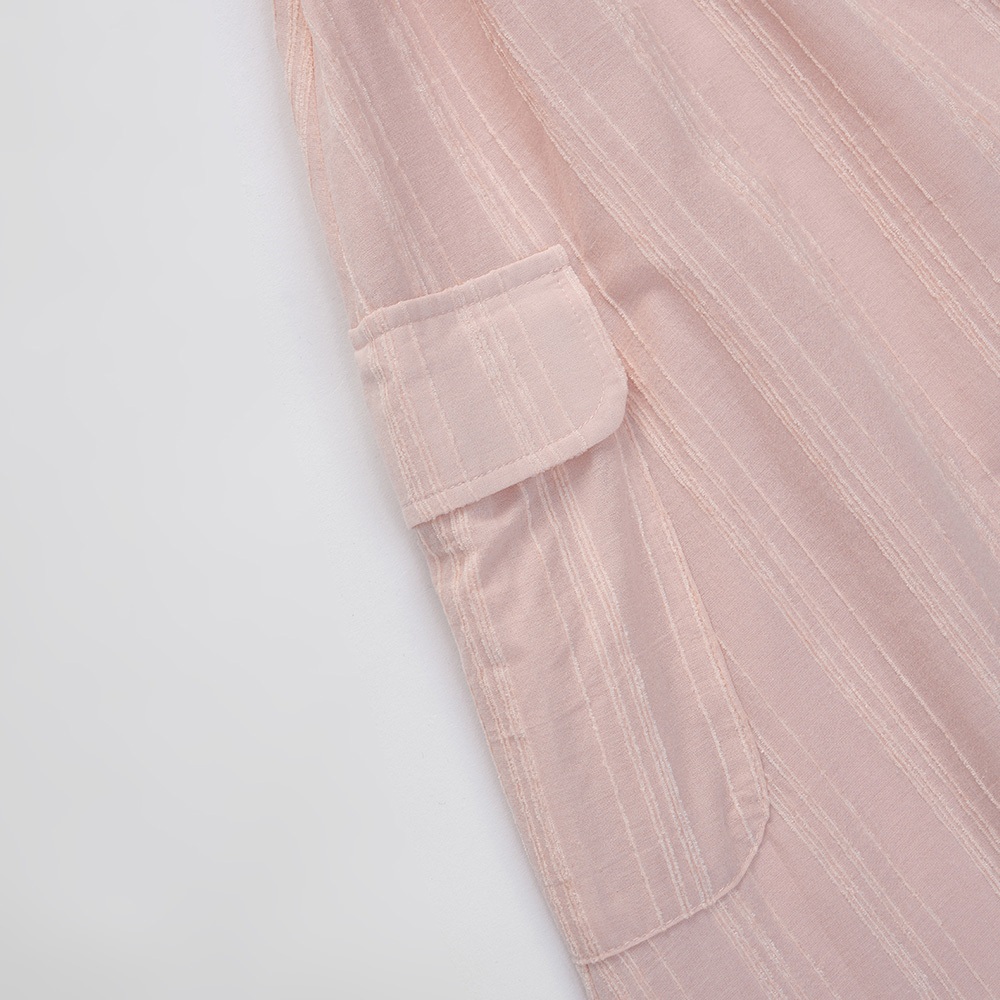 QUEENSHOP_ S 女裝 直紋紋理大口袋腰抽繩長洋裝 兩色售 現+預 【01087117】粉|杏QUEENSHOP