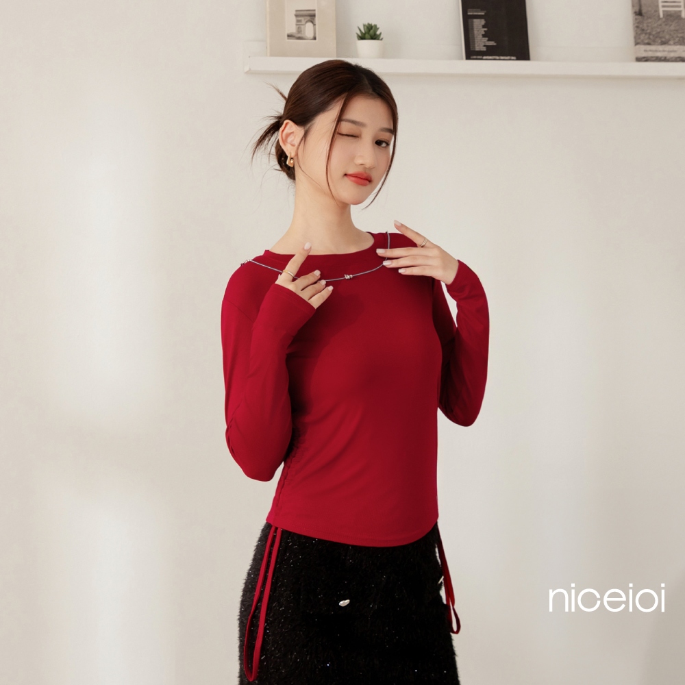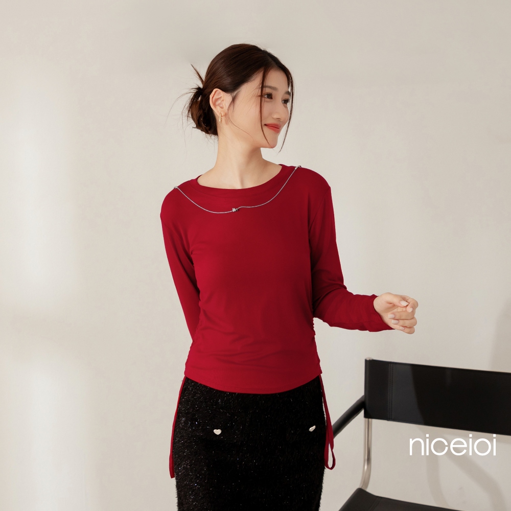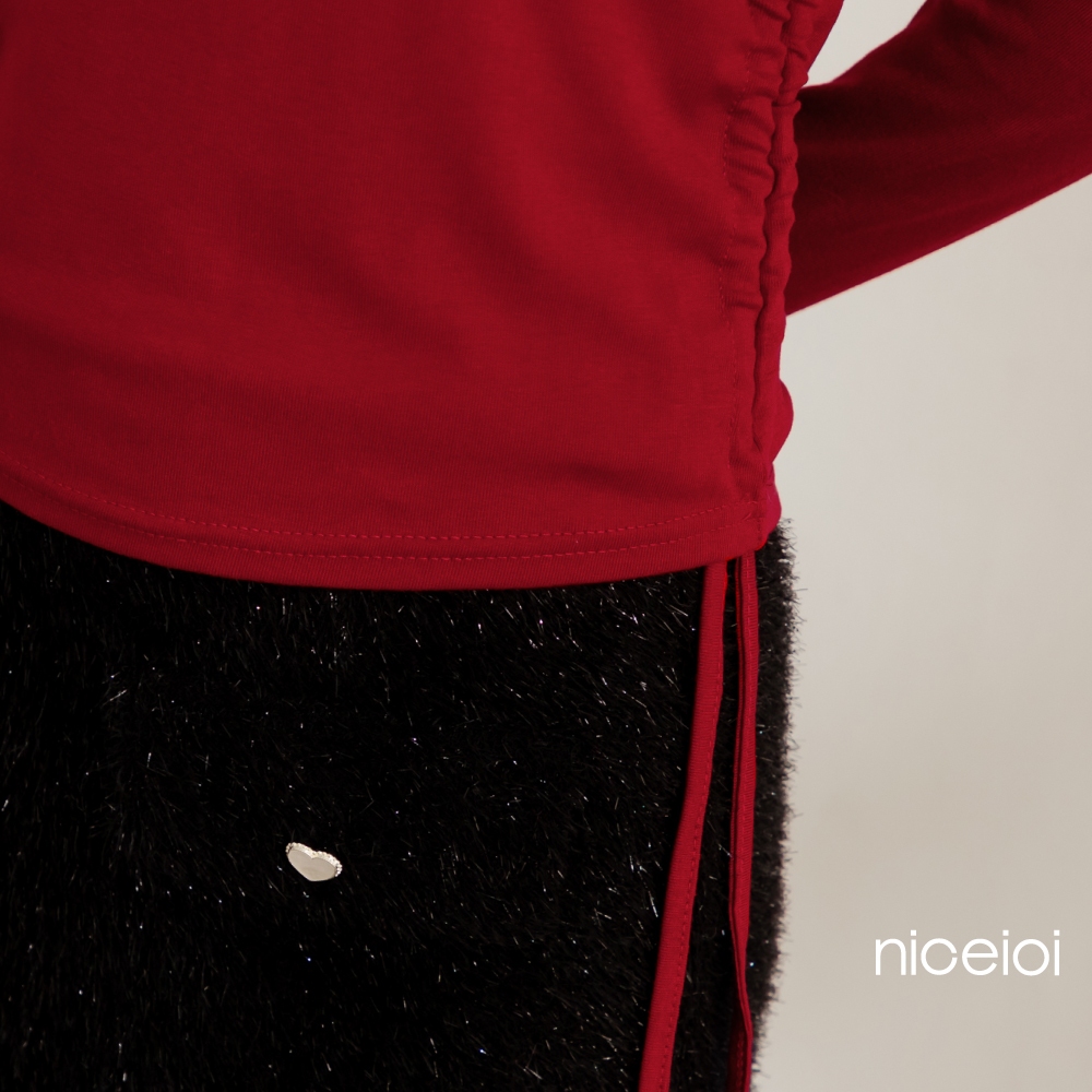 niceioi【特惠】小碎石項鍊側抓皺顯瘦上衣 (共3色) 女裝黑,F|紅,F|咖,FT-shirtsniceioi 官方旗艦店