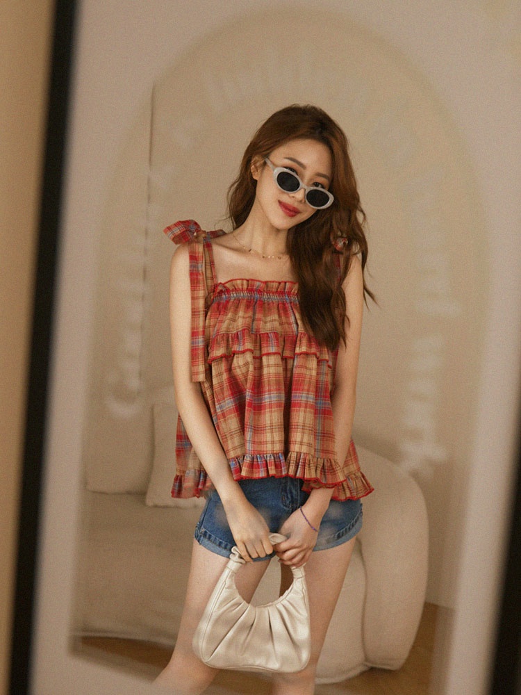 OB嚴選 親膚格紋荷葉邊方領綁帶背心上衣 《AB18782》女裝/現貨/時髦紅,S|紅,M|紅,L|芥末綠,S|芥末綠,M|芥末綠,LOthersOB嚴選官方旗艦店