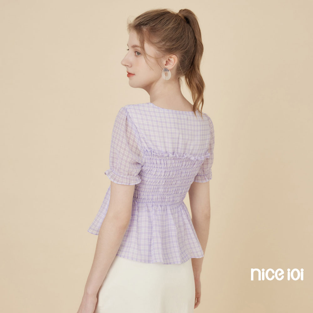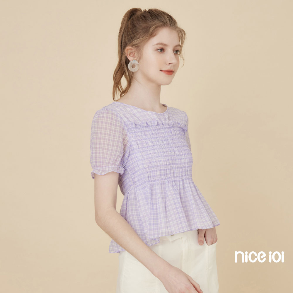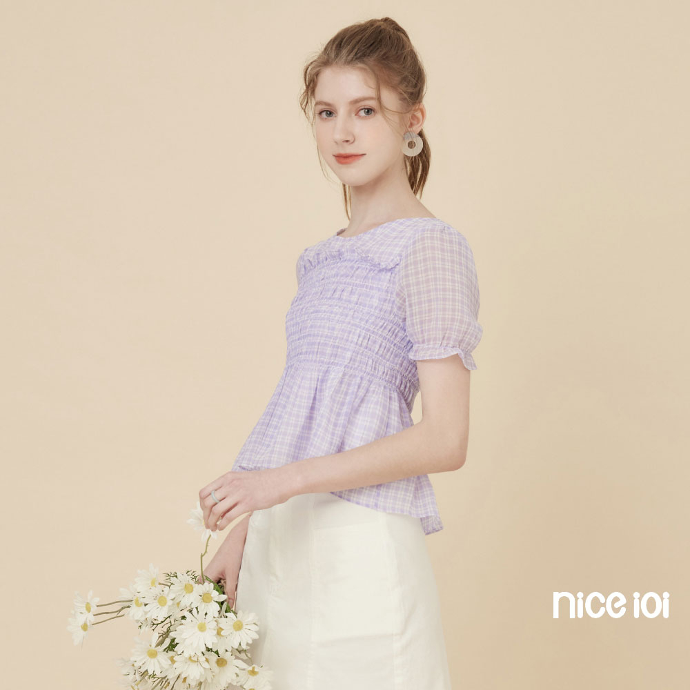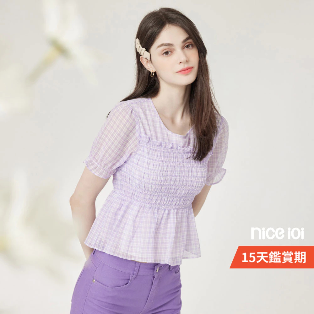 niceioi【特惠】甜美格紋荷葉雪紡上衣 女裝紫,S|紫,M|紫,L|紫,XLT-shirtsniceioi 官方旗艦店